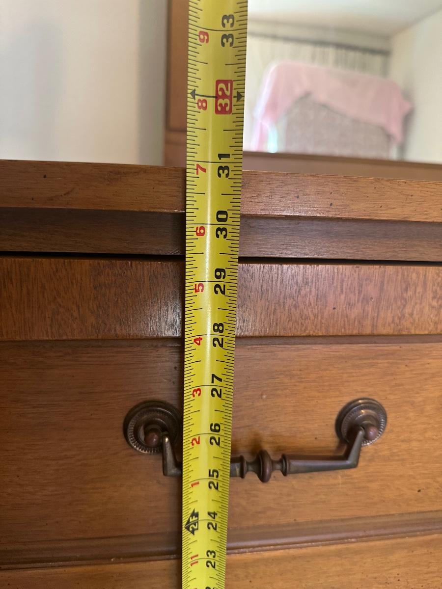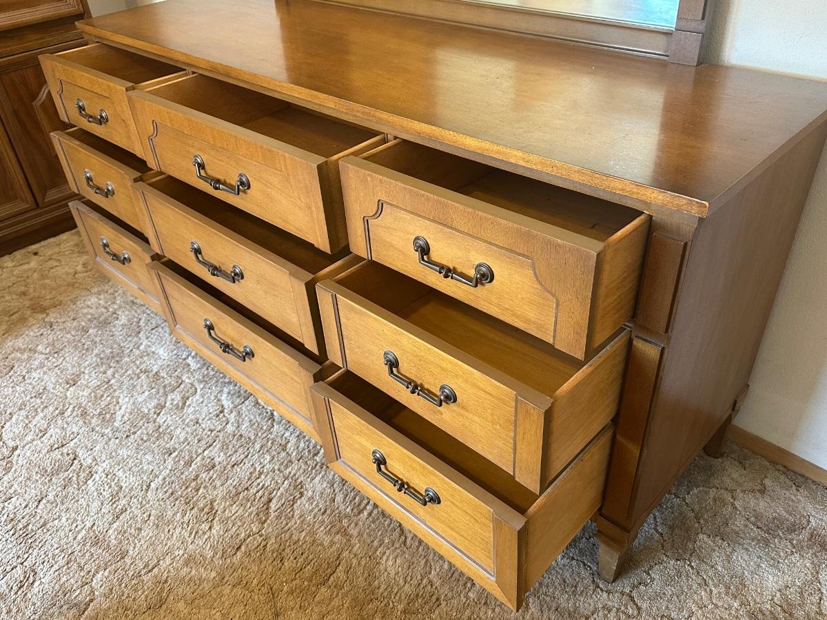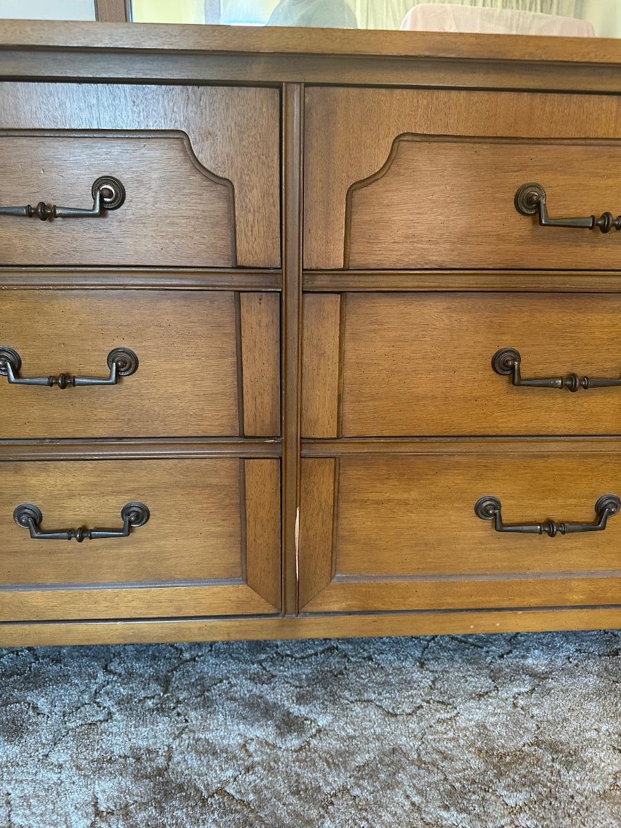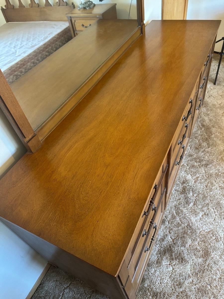 Vintage wooden 9-drawer dresser with an attached framed mirror. Dovetail drawers. All drawers open smoothly. Mirror is removable. Light surface wear and a few small marks consistent with age and use; overall in good, sturdy condition.
