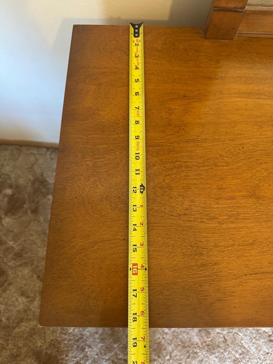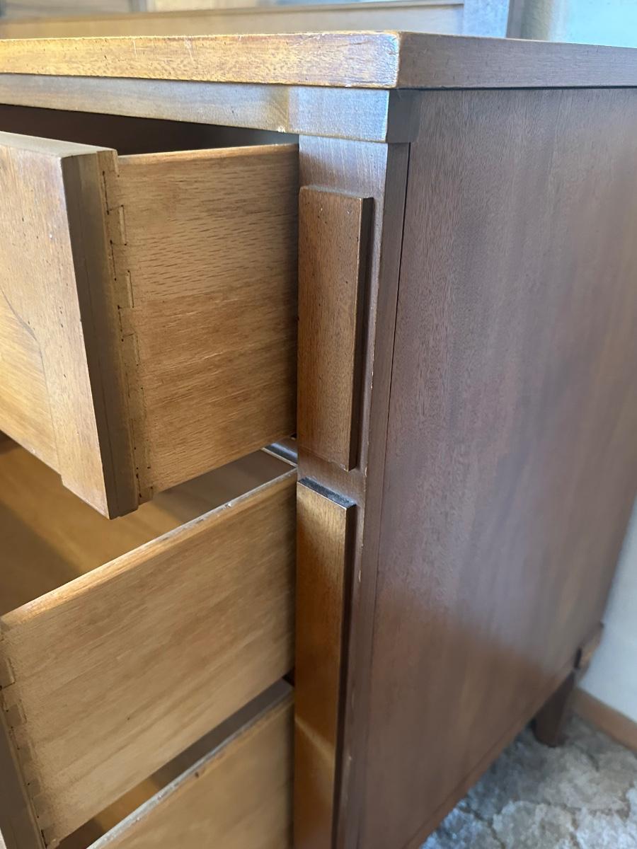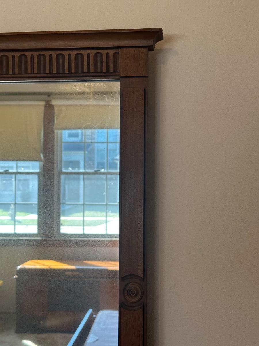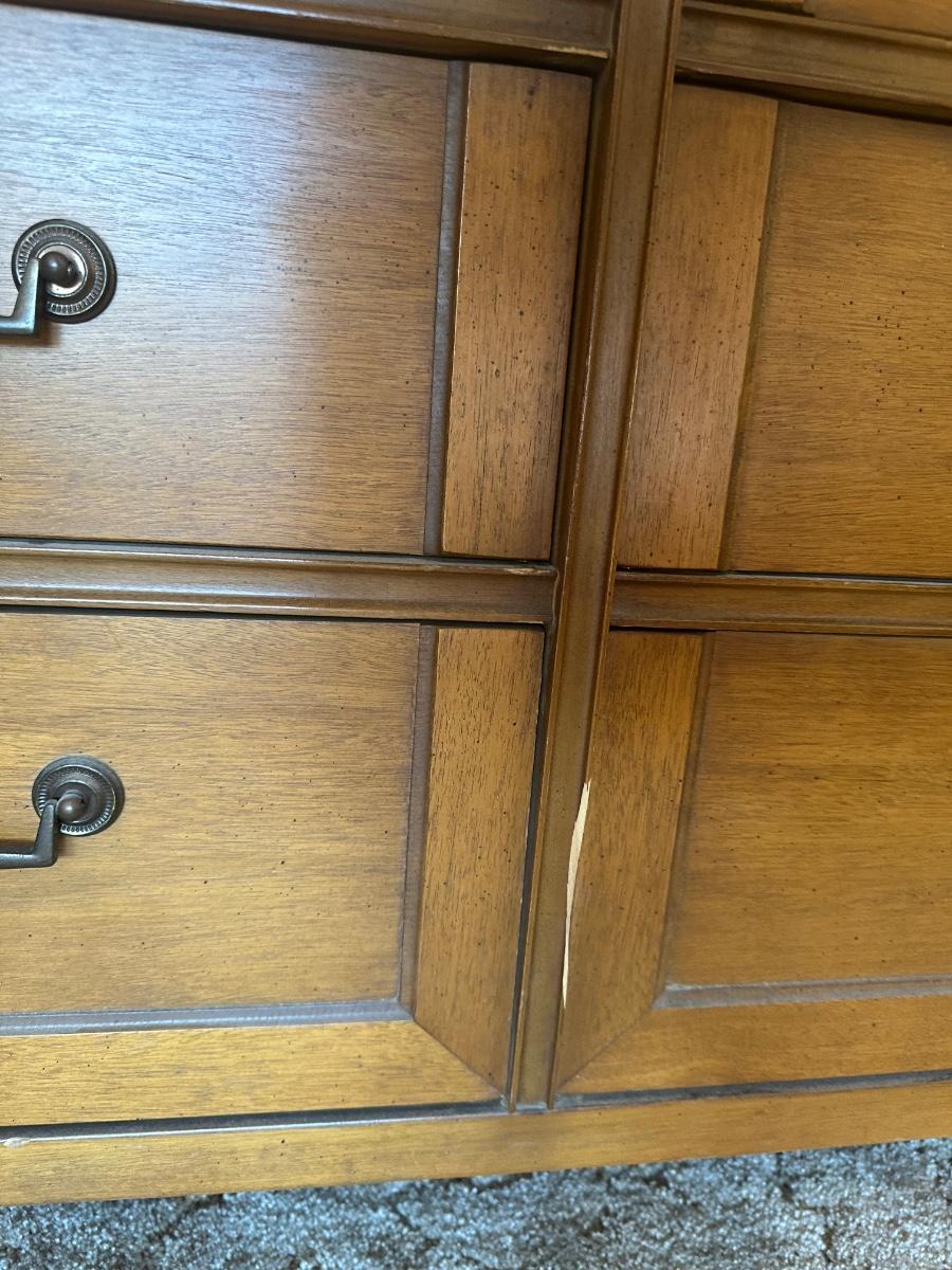 Vintage wooden 9-drawer dresser with an attached framed mirror. Dovetail drawers. All drawers open smoothly. Mirror is removable. Light surface wear and a few small marks consistent with age and use; overall in good, sturdy condition.
