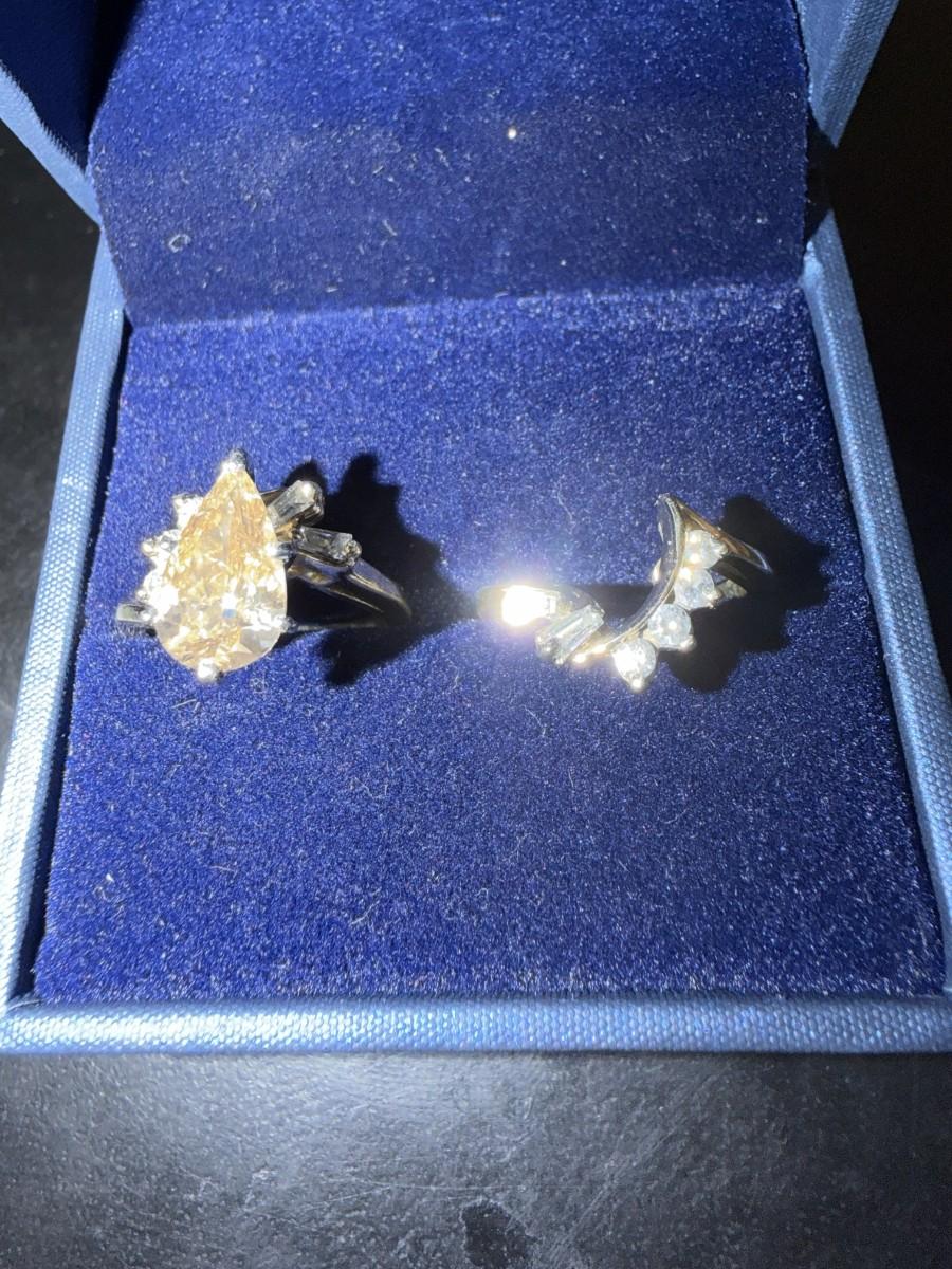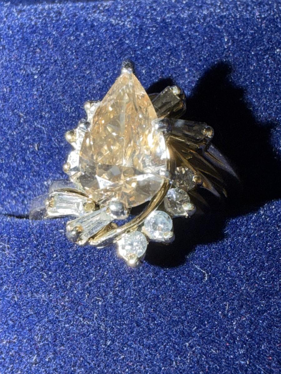 14K yellow gold and diamond pair of stacking rings feature a fancy brown pear-shaped brilliant diamond with baguette diamond and round brilliant diamond melee. The primary stone is valued at $9423.00