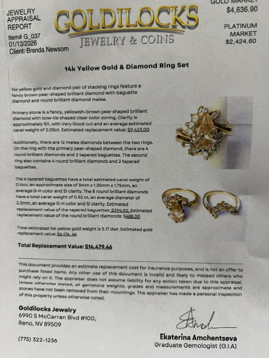 Estimated 14k gold weight is 5.17 dwt, with a value of $ 4174.46. Appraisal is dated 1-13-26