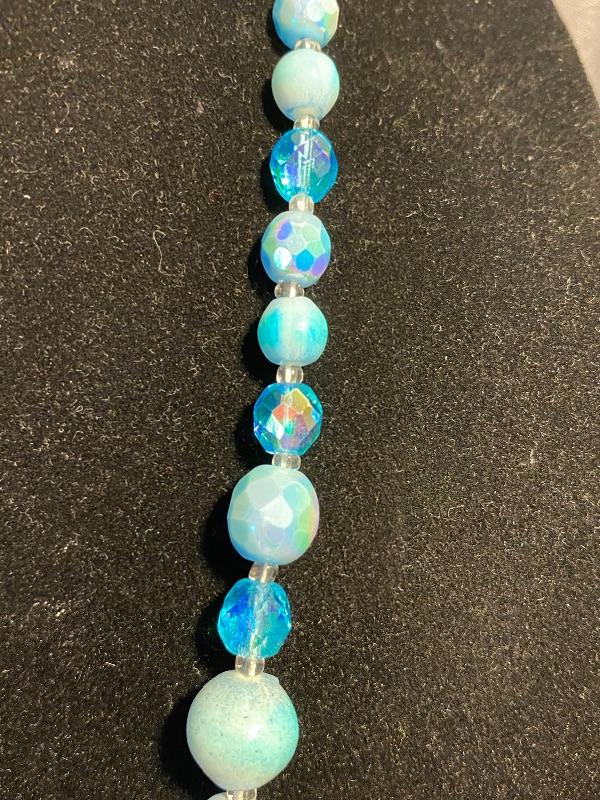 Vintage turquoise color beaded necklace. Great mix of texture and cut. Some of the beads have a rainbow AB effect. A turquoise rhinestone pendant hangs from center. I think the pendant may have been added, matches wonderfully in color, can be easily removed. Measures about 14" with pendant.