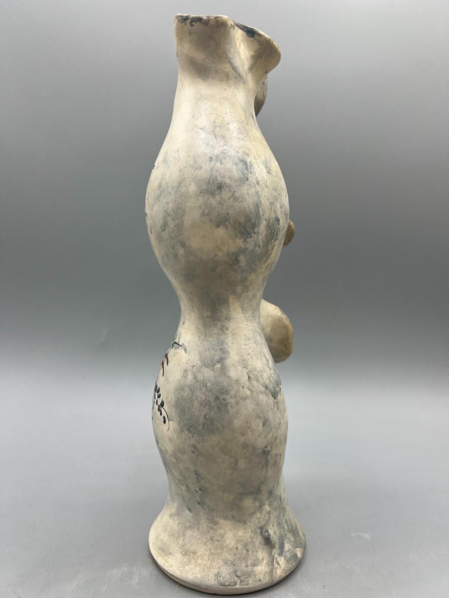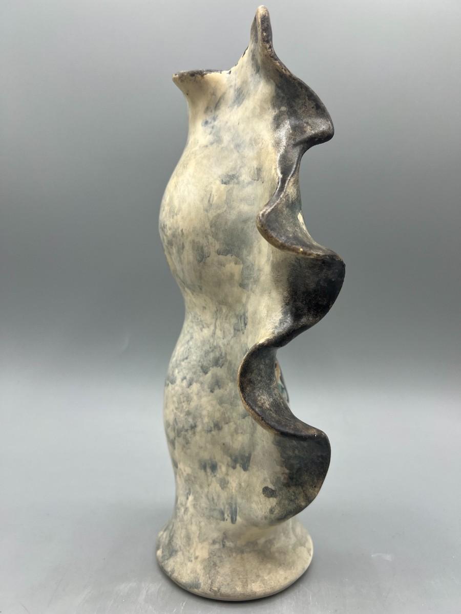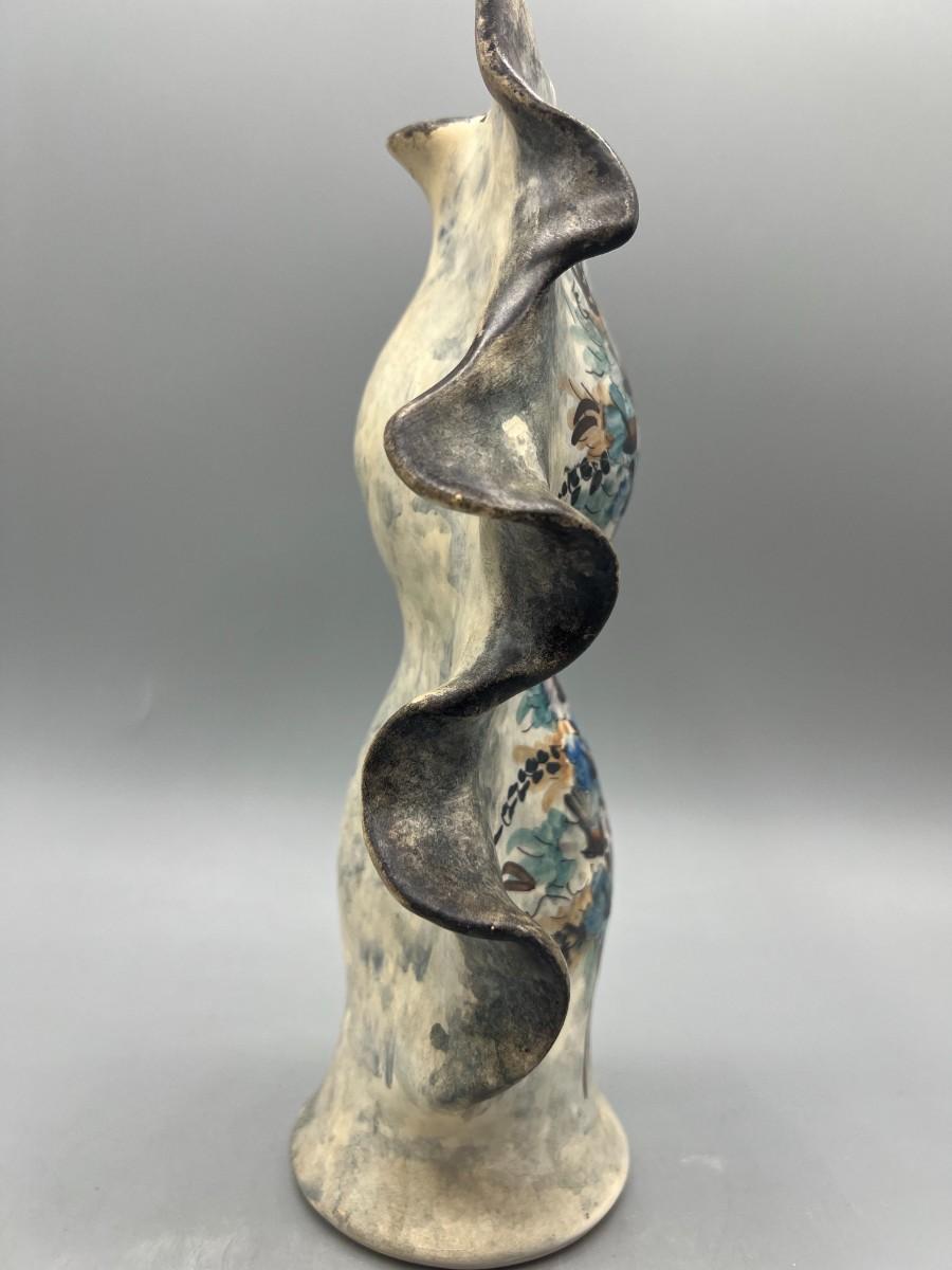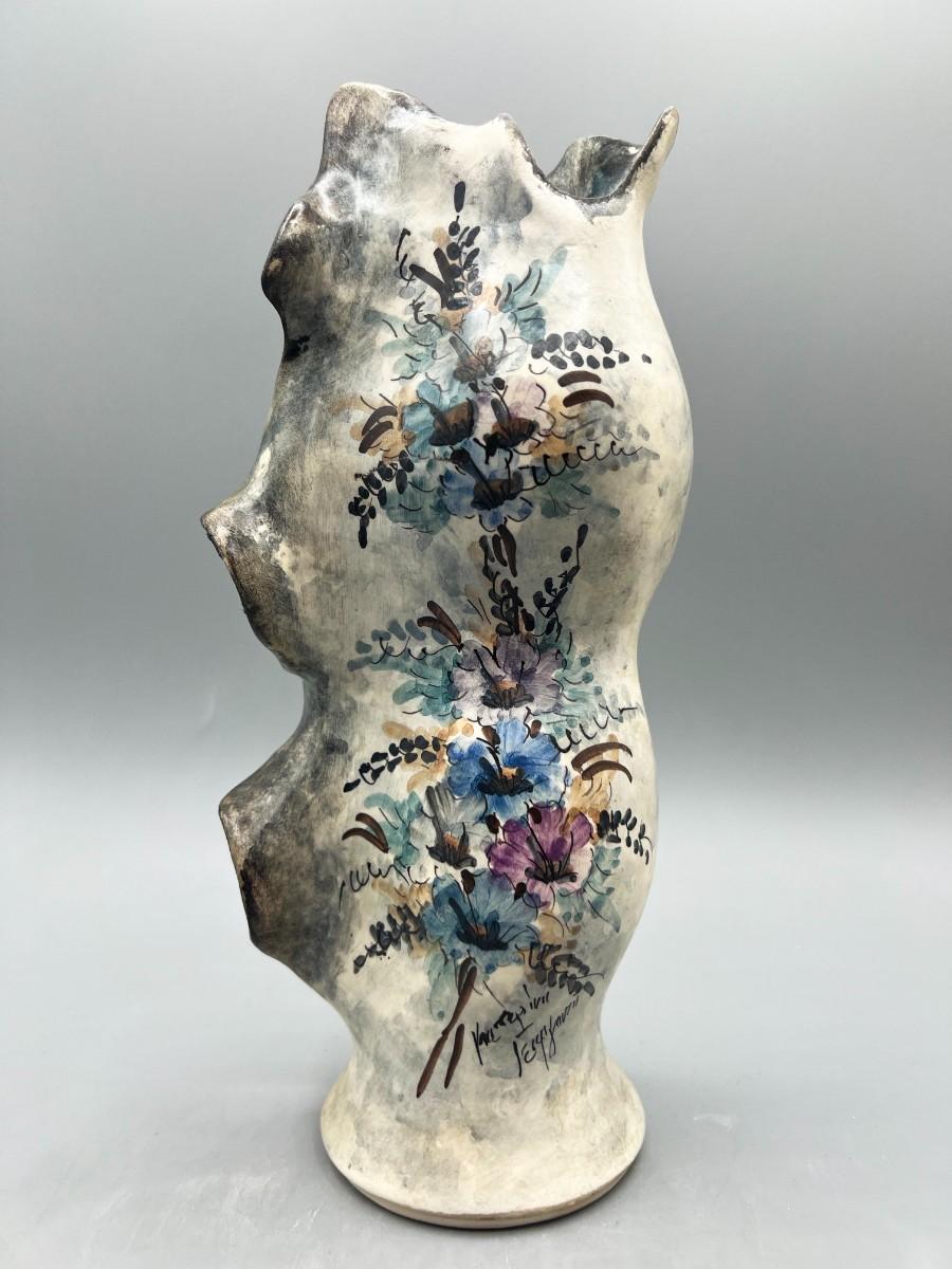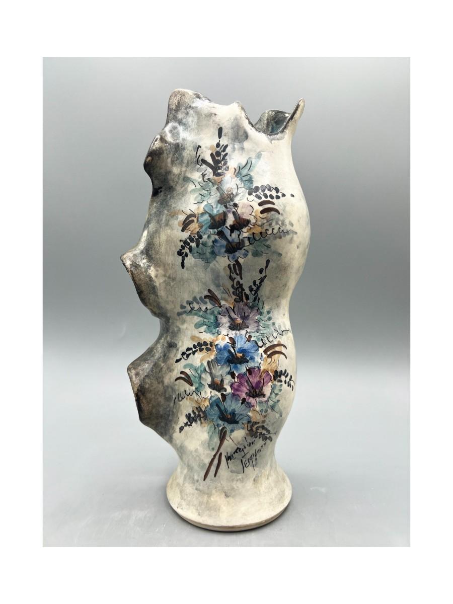 Vintage Abstract Avant Garde Floral Bouquet Painted Vase Artist Signed. Interesting pottery shape. It is signed by artist near the bottom, hard to make out the name. In good vintage condition. About 9" tall.