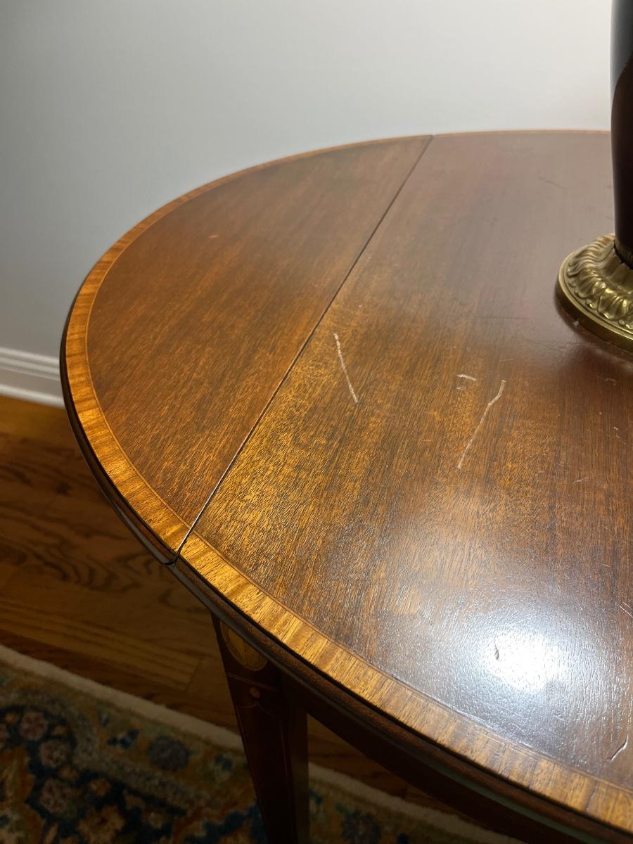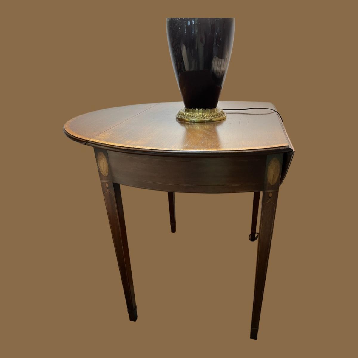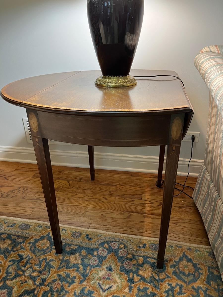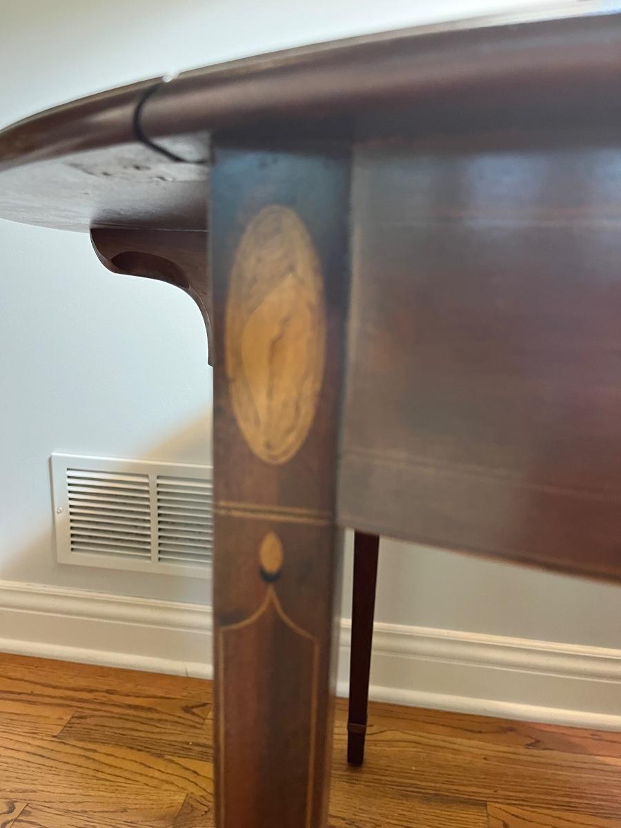 30"h x 27"d x 19"w (without leaves) x 37"w (with leaves)--lovely Adams style side table in mahogany with beautiful fruit wood inlaid shell details and stringers and simple straight legs. It's a timeless piece that will fit in with lots of different decor styles.