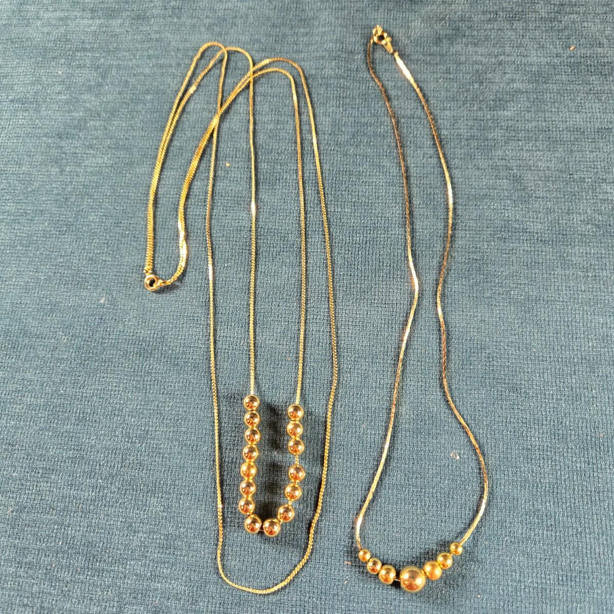 This auction lot is for Vintage "Add a Bead" Necklaces. This is a pair of "Add a Bead" necklaces that were popular in the late 70's. We recall you could purchase and add as many beads as you wanted or could afford. If we remember correctly the chains were Gold Electroplated but the beads were 14K. The first necklace is a double chain, the one without beads is about 16-inches long and the one with beads is about 23-inches long. The single chain necklace is about 16-inches long with graduating size beads. There are no marks so there are no guarantees about any gold content. They are, however, still shiny and the beads are light weight. None-the-less, they are still very pretty and timeless.