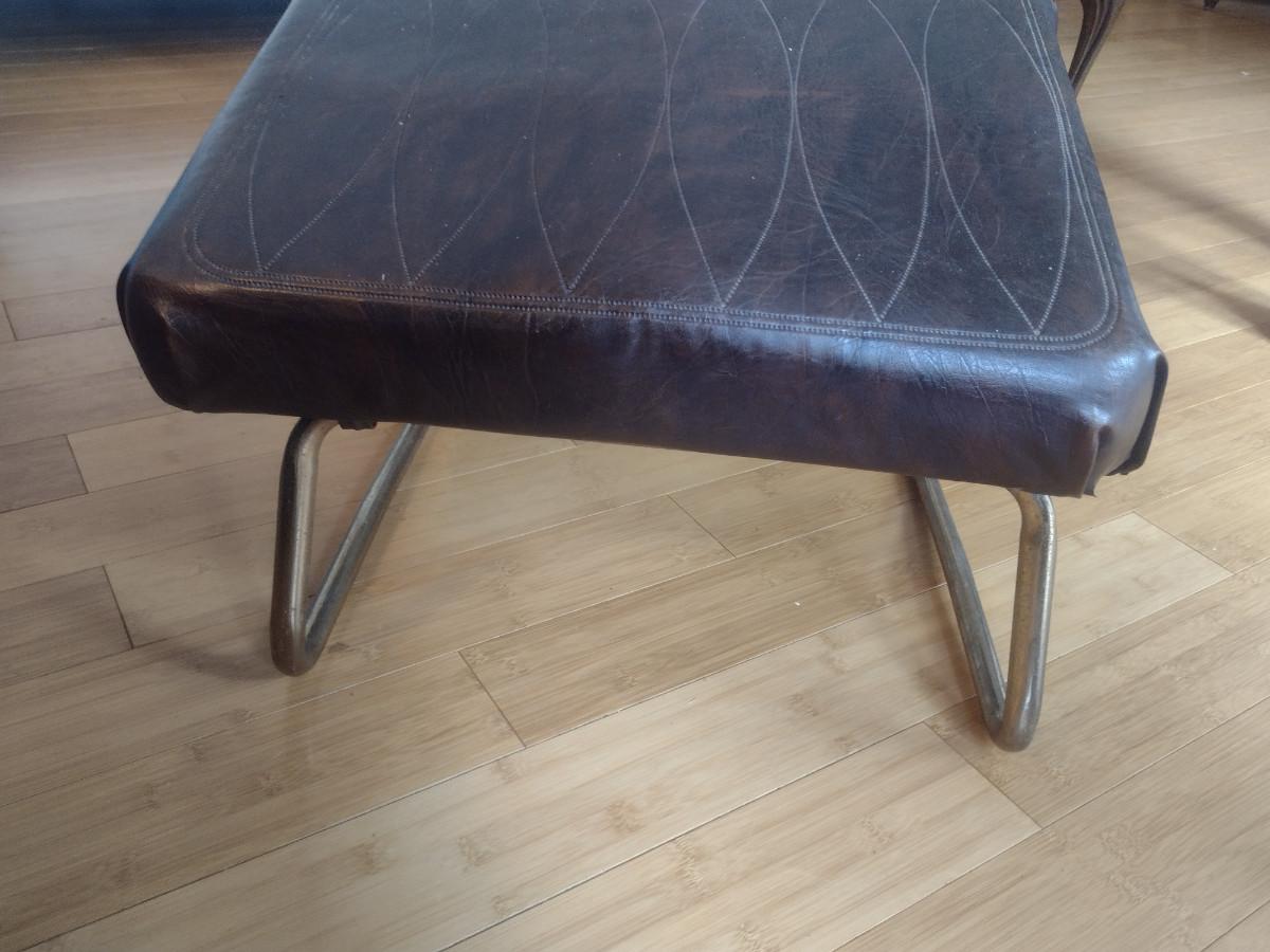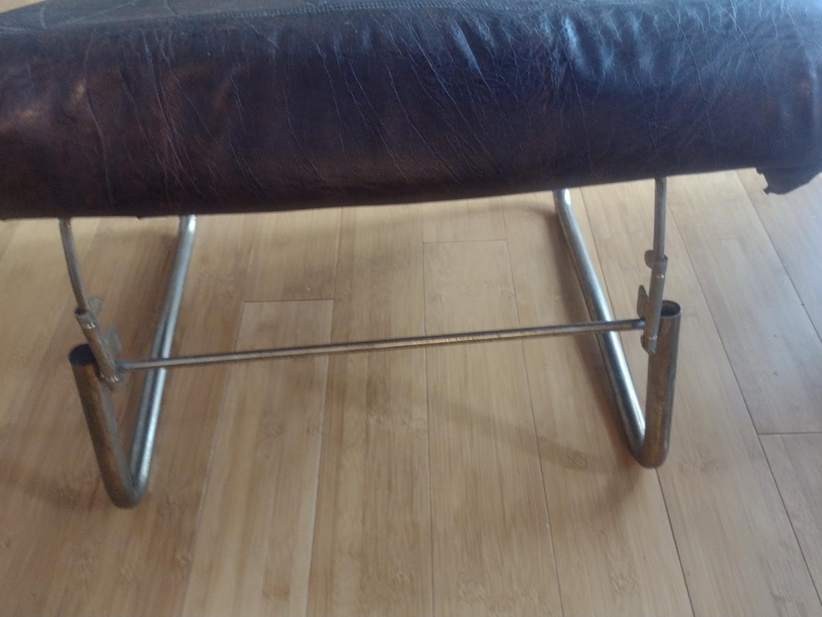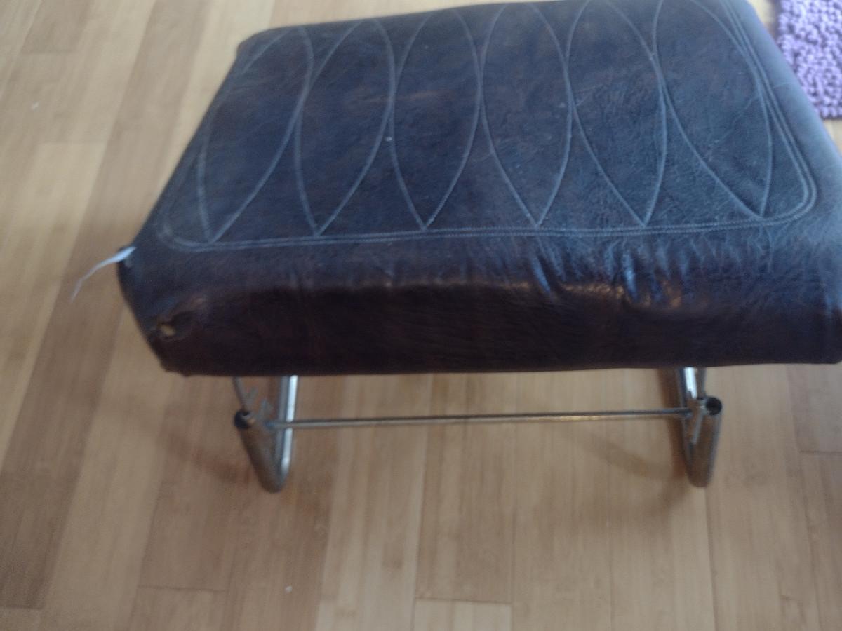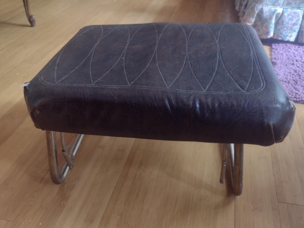 Vintage Adjustable Foot Stool. Corners have some cracking. Metal frame may have discoloration/oxidation. Please see pictures- missing one end tab on metal frame.