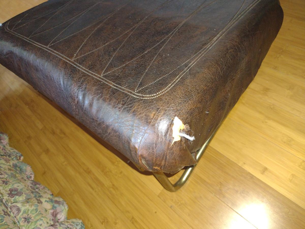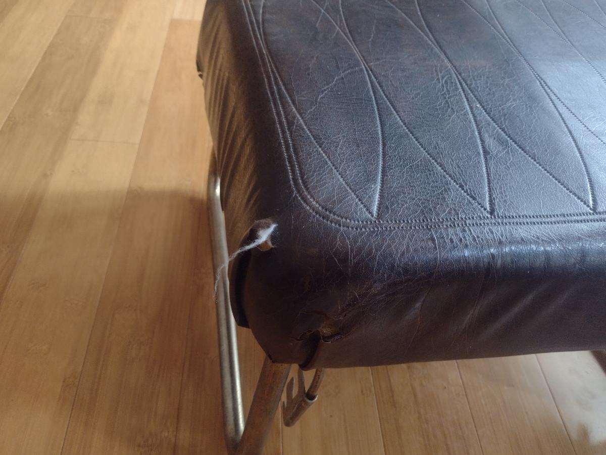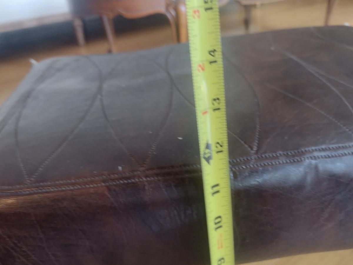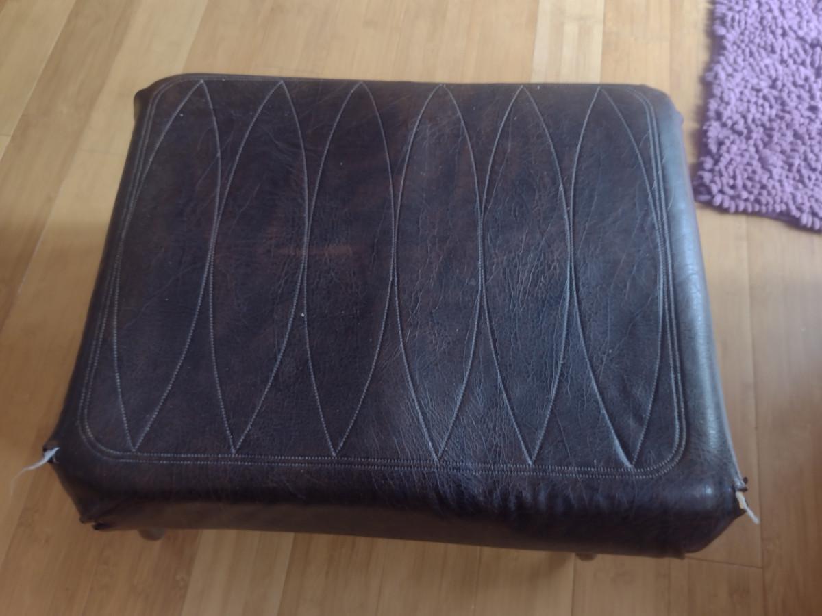 Vintage Adjustable Foot Stool. Corners have some cracking. Metal frame may have discoloration/oxidation. Please see pictures- missing one end tab on metal frame.