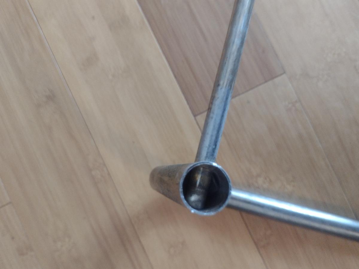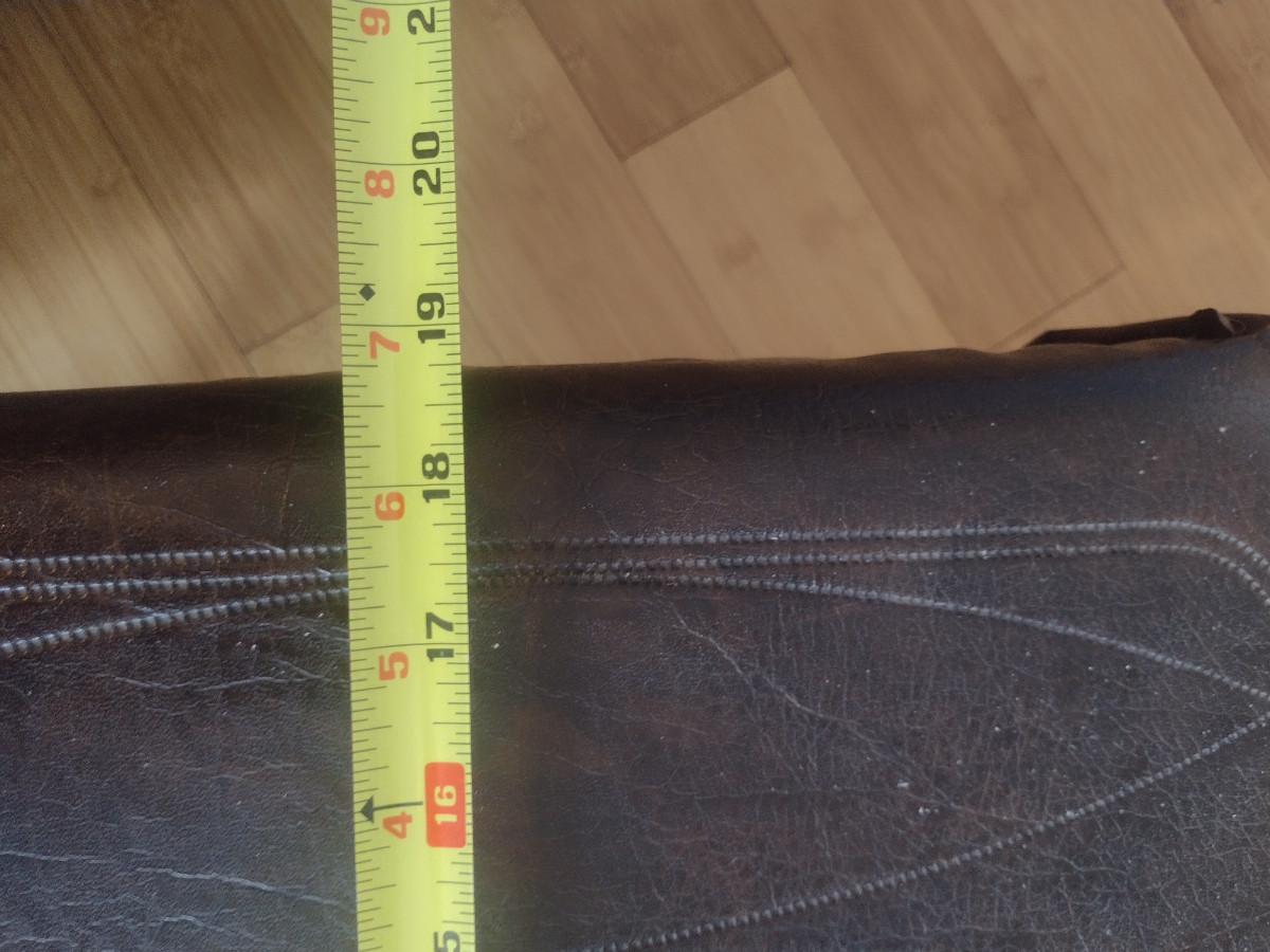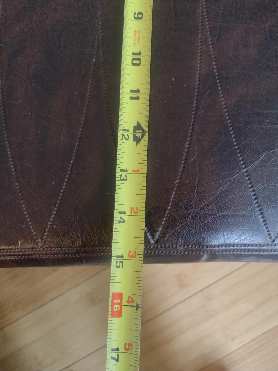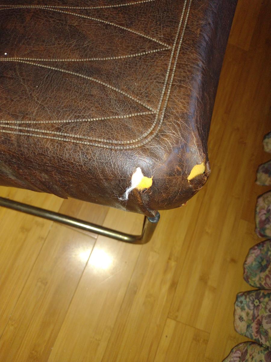 Vintage Adjustable Foot Stool. Corners have some cracking. Metal frame may have discoloration/oxidation. Please see pictures- missing one end tab on metal frame.