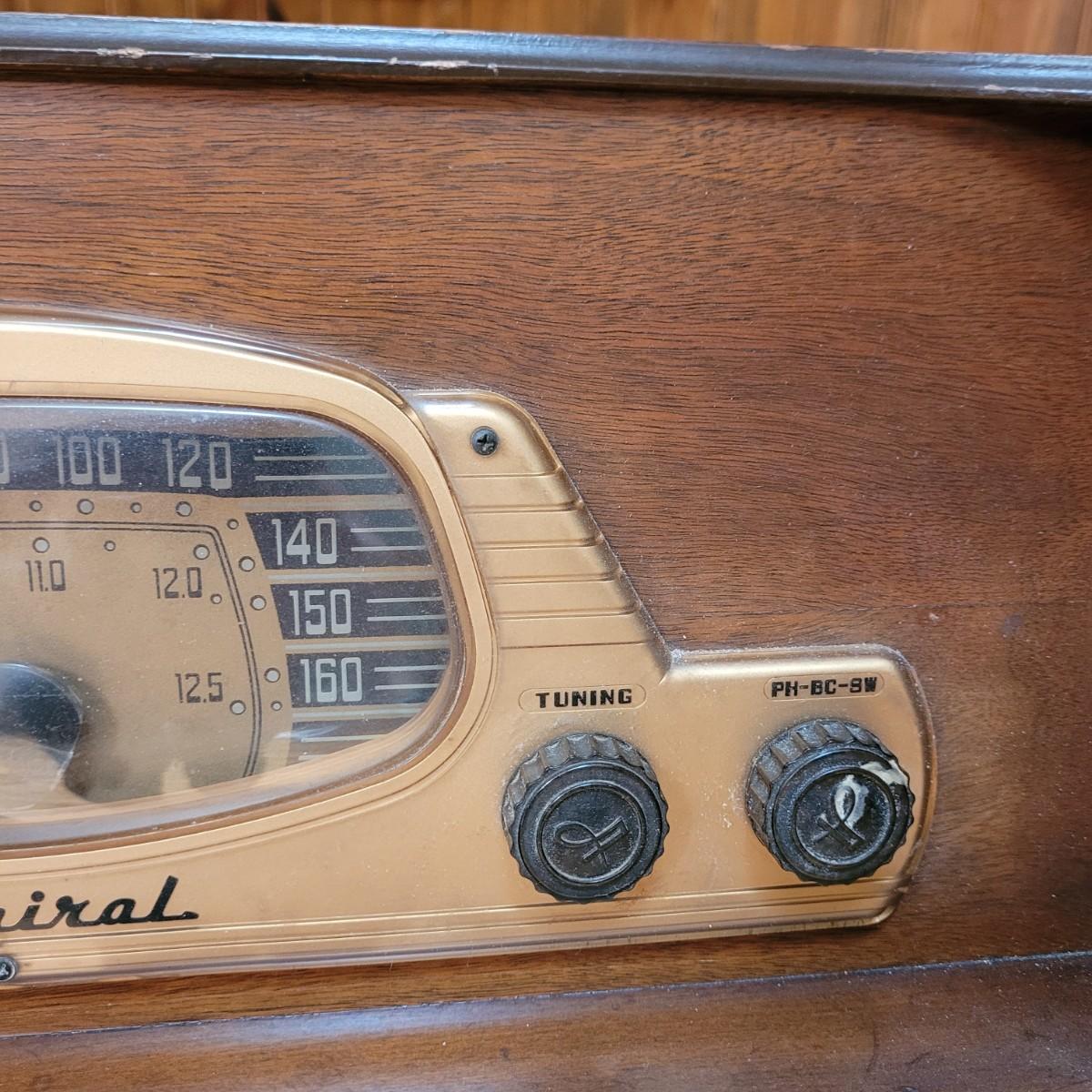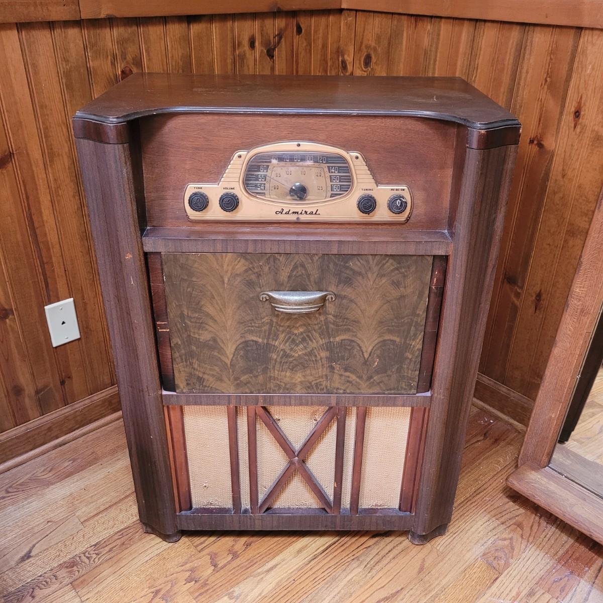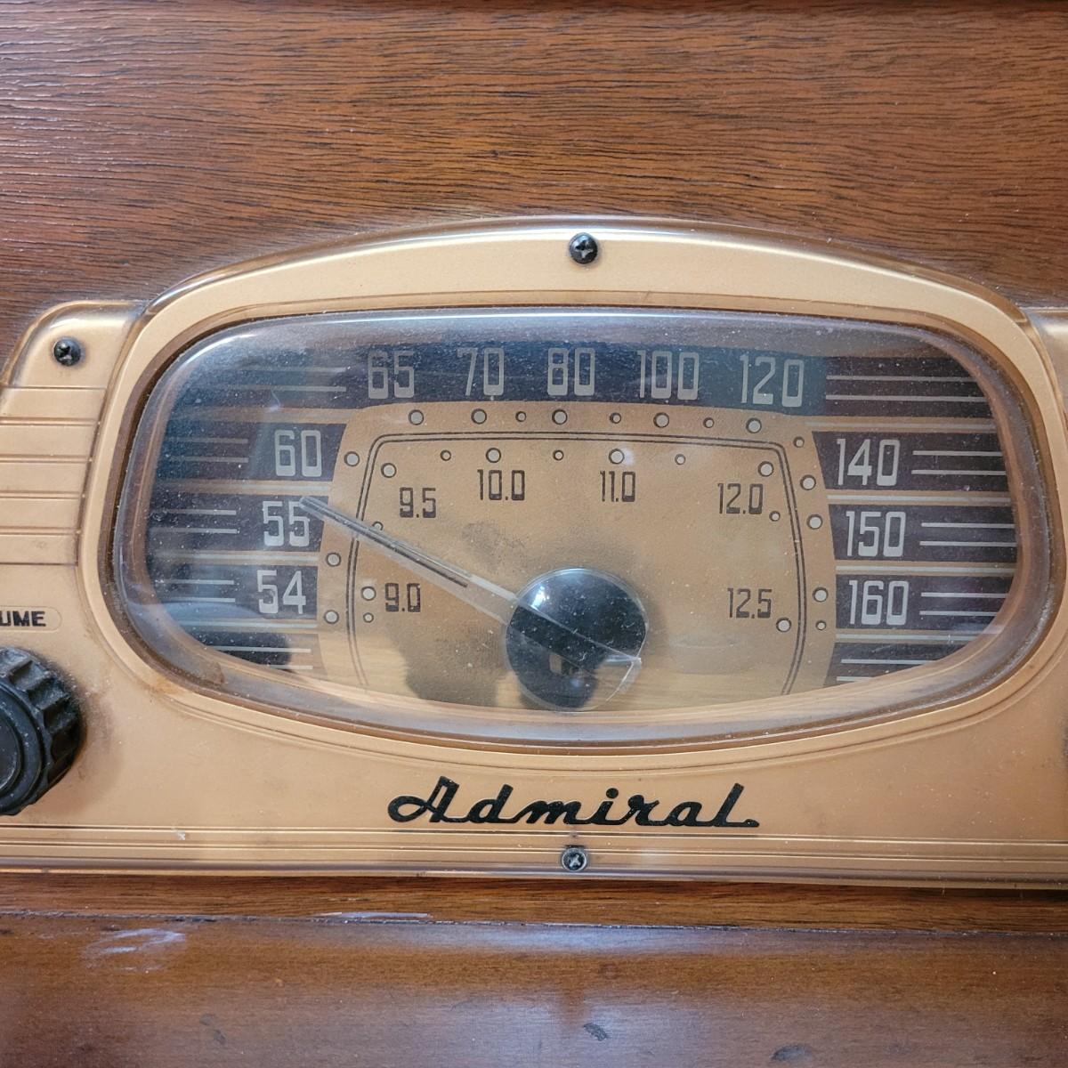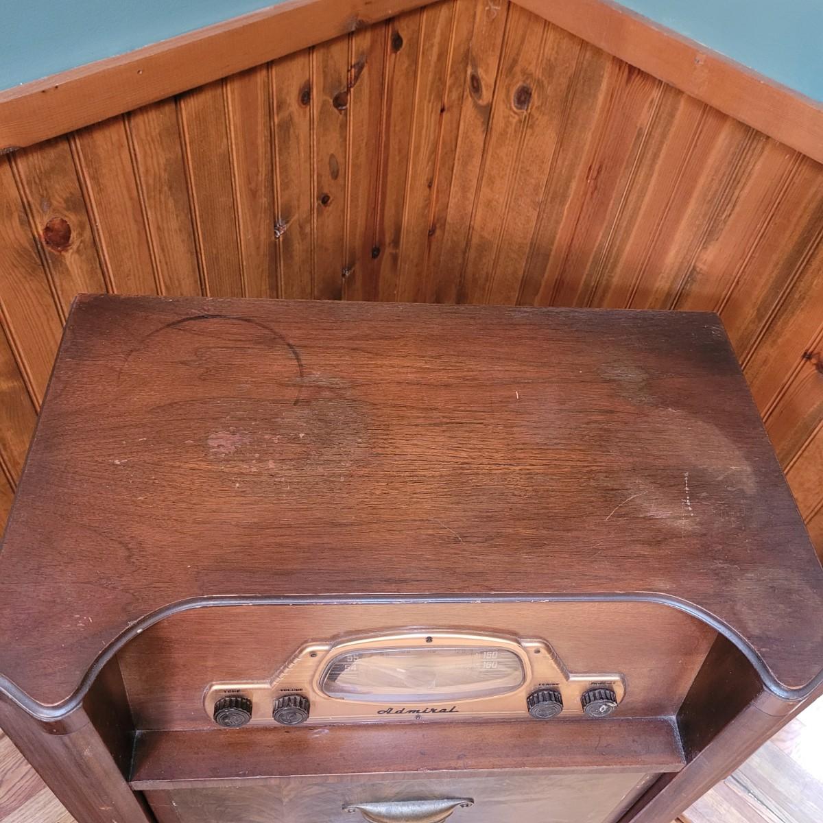 This vintage Admiral Chassis radio phonograph powers on when plugged in. Measures approximately 27" x 17" x 36.5"H. Top of radio has waster marks and scratches, see pictures. Local pickup only. Winning bidder must bring assistance to help move and load this item due to its weight and/or size.