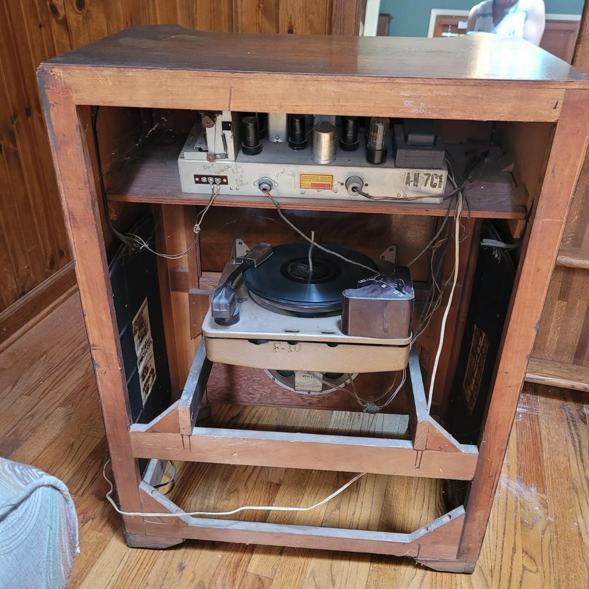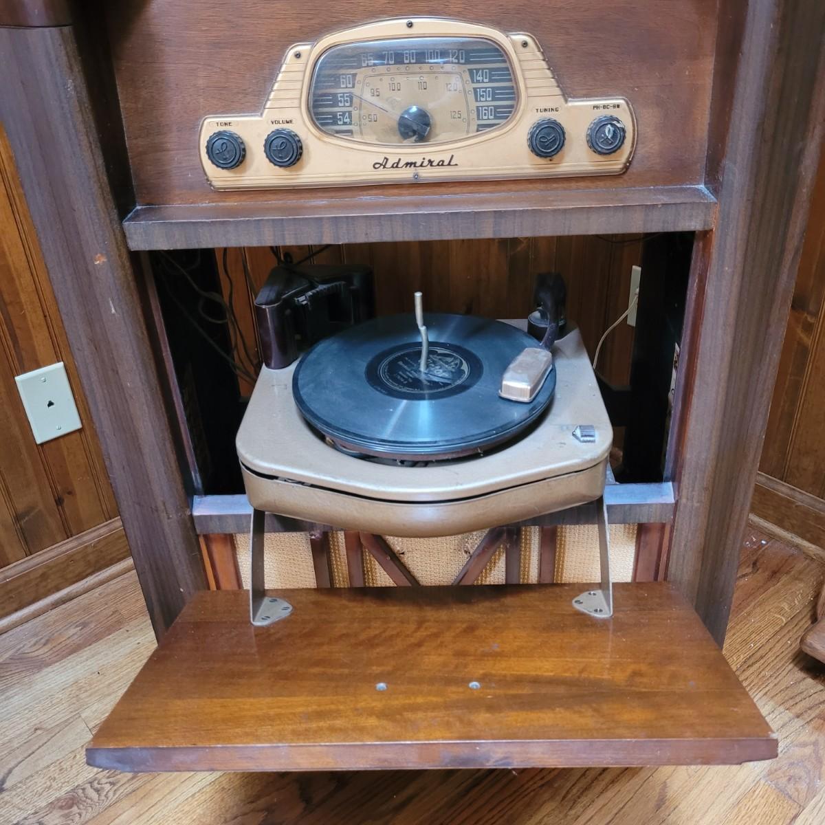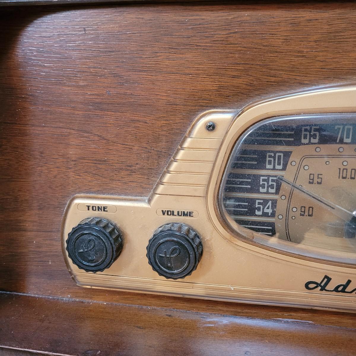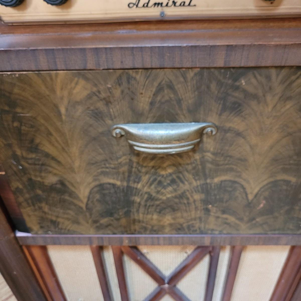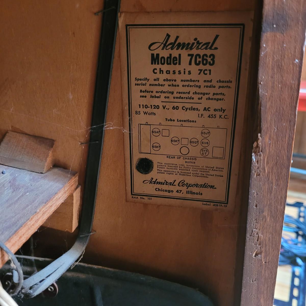 This vintage Admiral Chassis radio phonograph powers on when plugged in. Measures approximately 27" x 17" x 36.5"H. Top of radio has waster marks and scratches, see pictures. Local pickup only. Winning bidder must bring assistance to help move and load this item due to its weight and/or size.