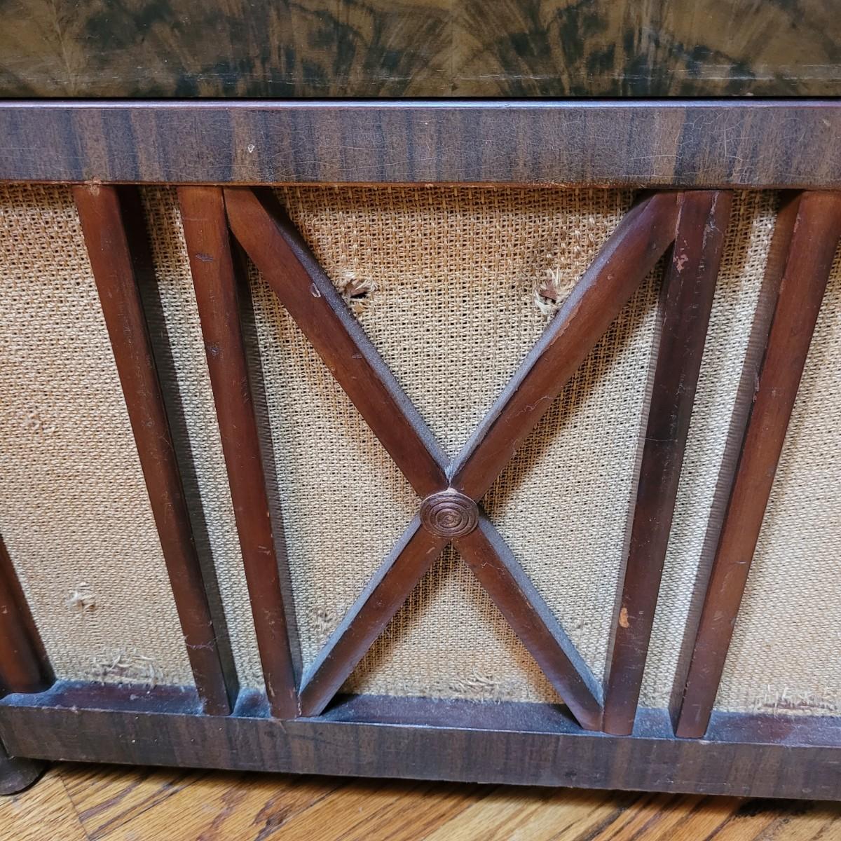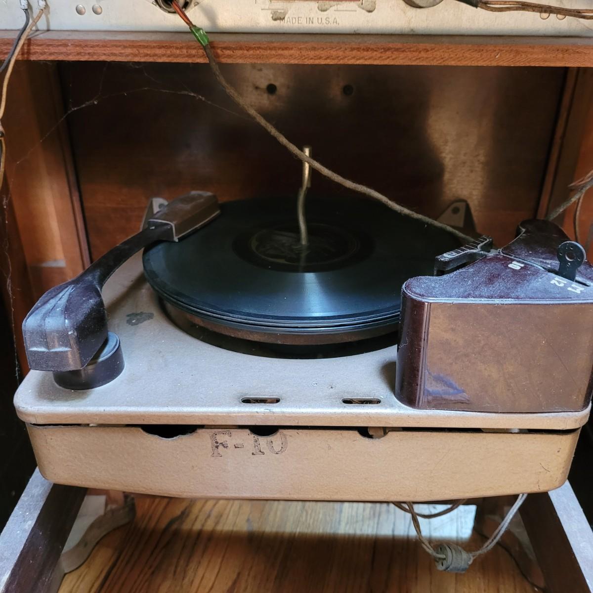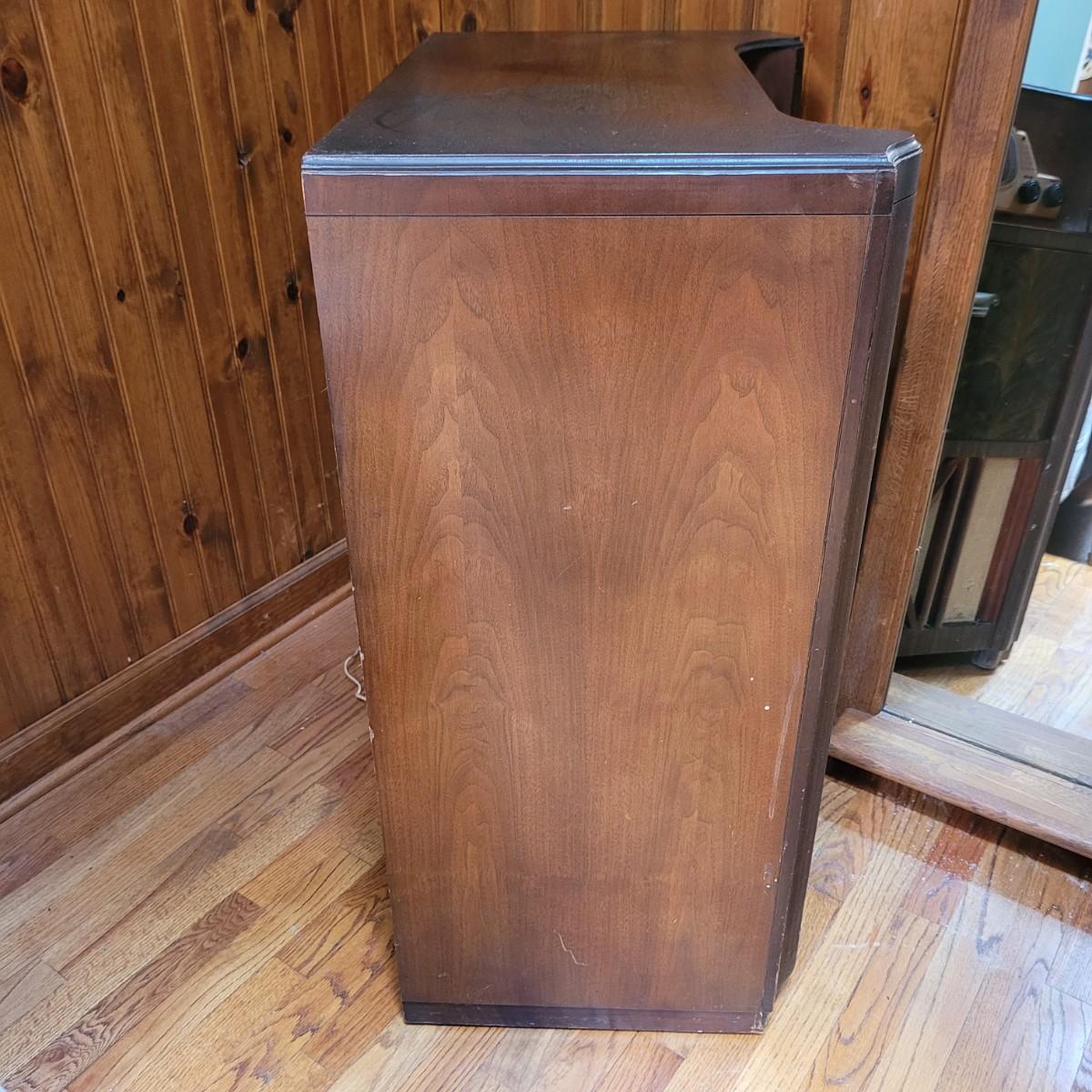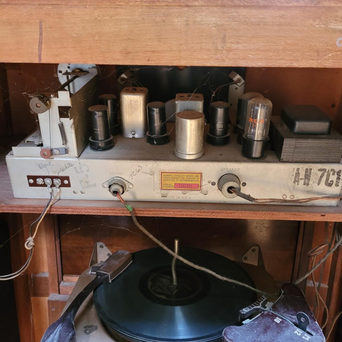 This vintage Admiral Chassis radio phonograph powers on when plugged in. Measures approximately 27" x 17" x 36.5"H. Top of radio has waster marks and scratches, see pictures. Local pickup only. Winning bidder must bring assistance to help move and load this item due to its weight and/or size.