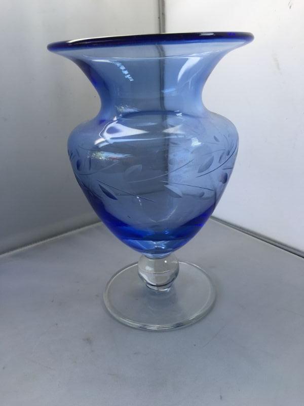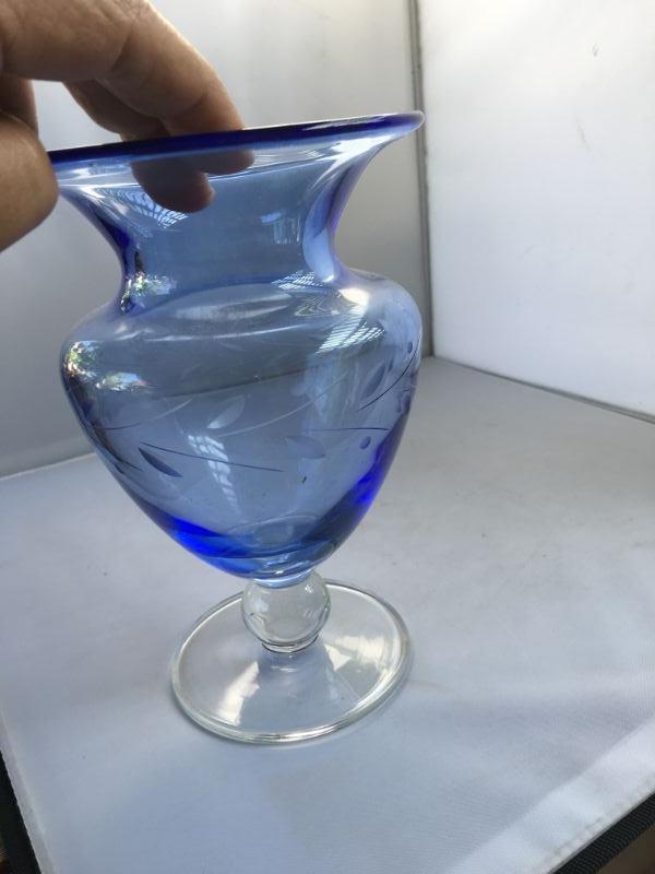 Vintage Adorable Etched Blue Glass Vase