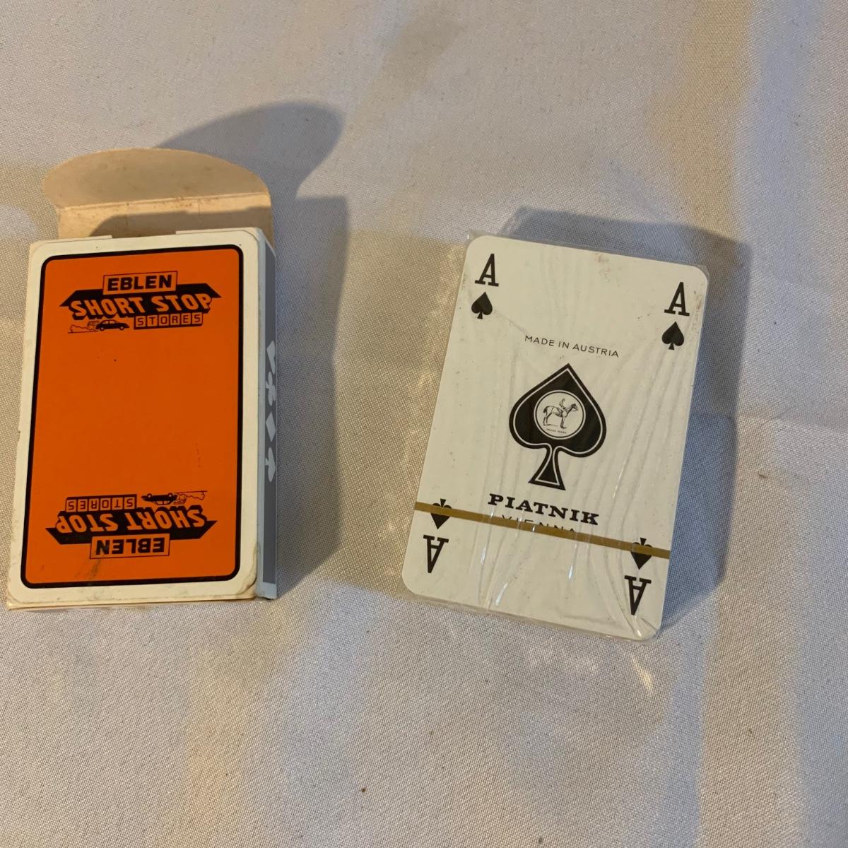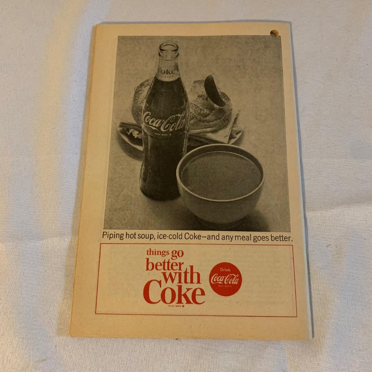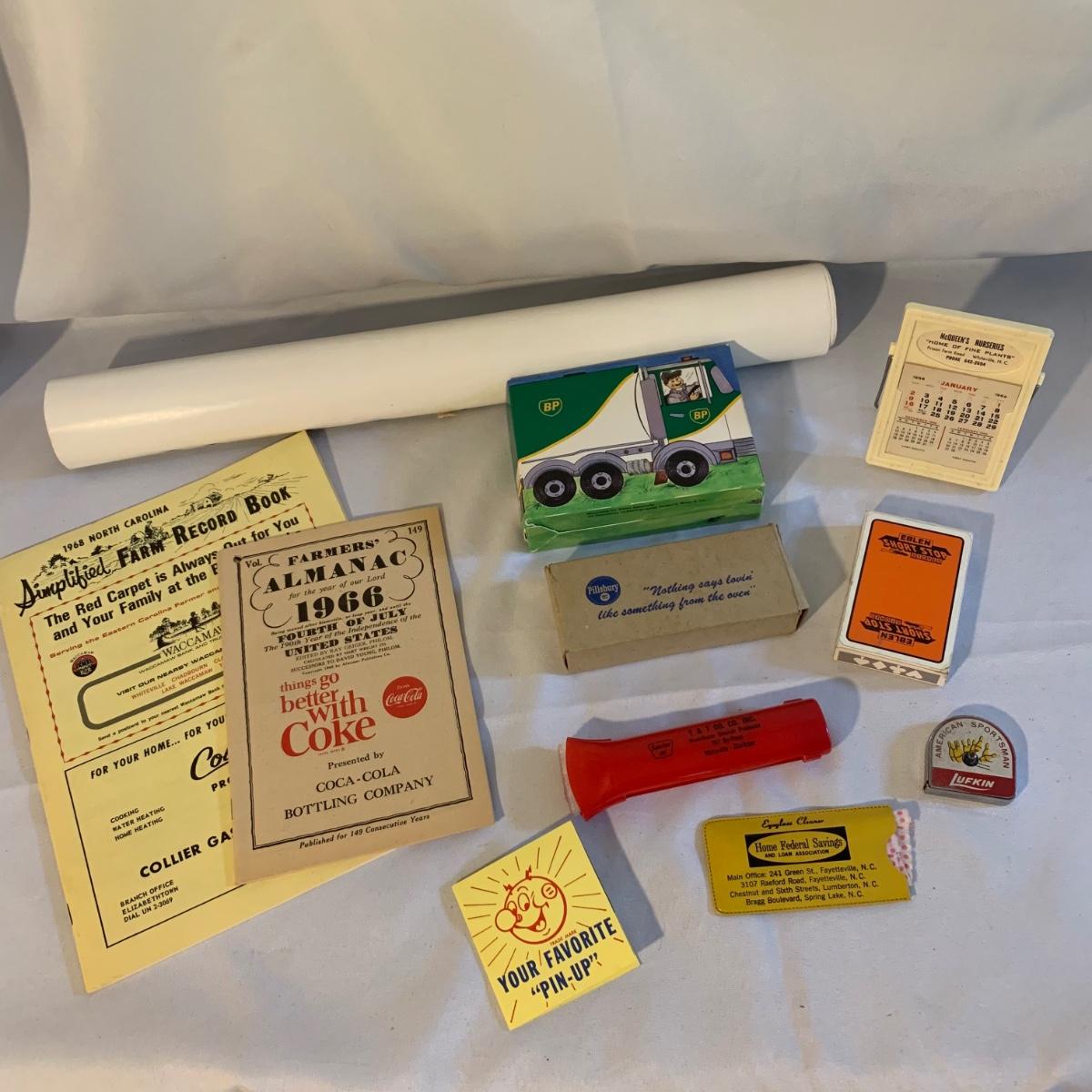 This lot includes a variety of vintage advertising trinkets. Books, a poster, a pin, playing cards, and more are included. The playing cards are unopened and in original packaging. The pieces range from fair to good condition. The poster measures about 27.5in. Shipping available.
