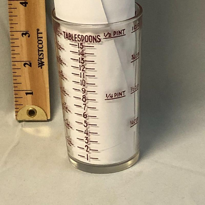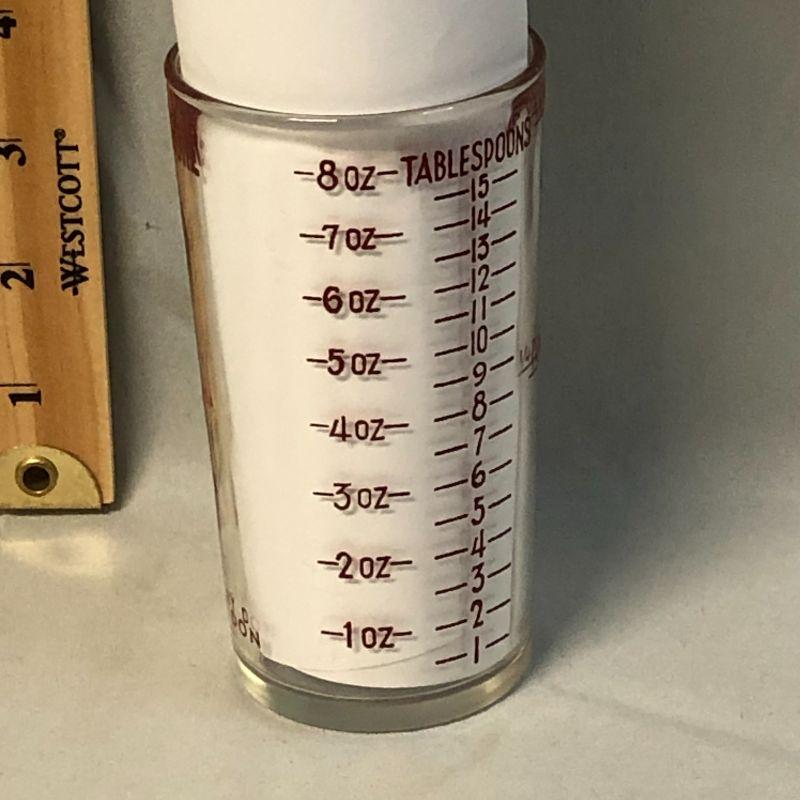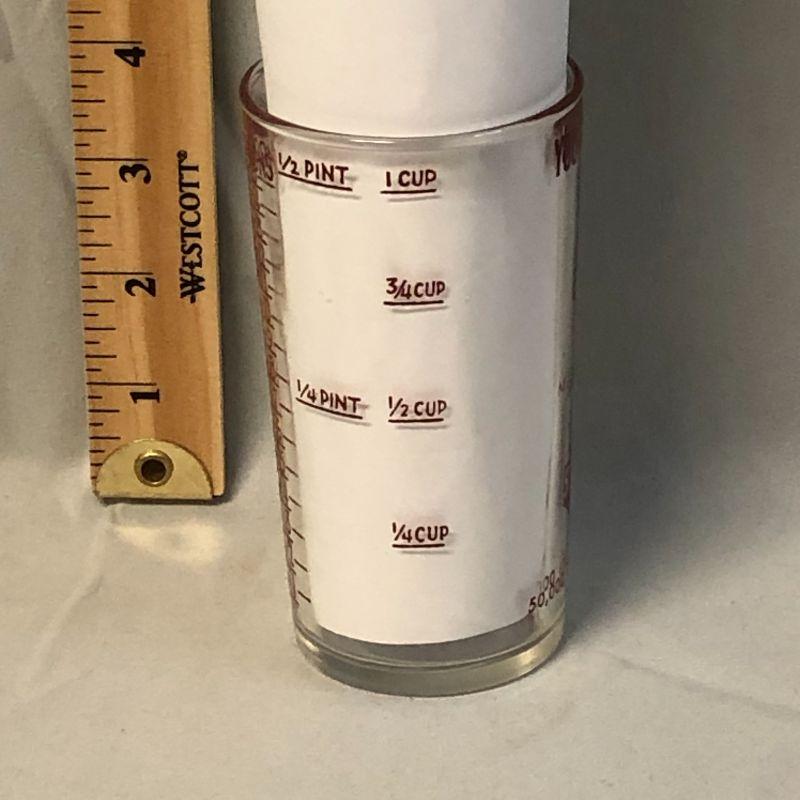 This glass is in excellent condition - no issues with the paint or the glass. It measures 8 oz, 16 tablespoons, 1/2 pint, and 1 cup. It is 4.75" in height.