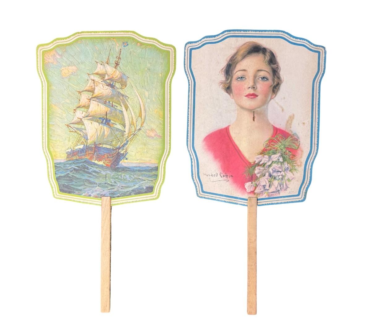 Two fans. One fan is signed by notable illustrator William Haskell Coffin, and the other has a nautical scene. Each is intact, with minimal age related wear. Measurement: 14”L (approximate). [LD]