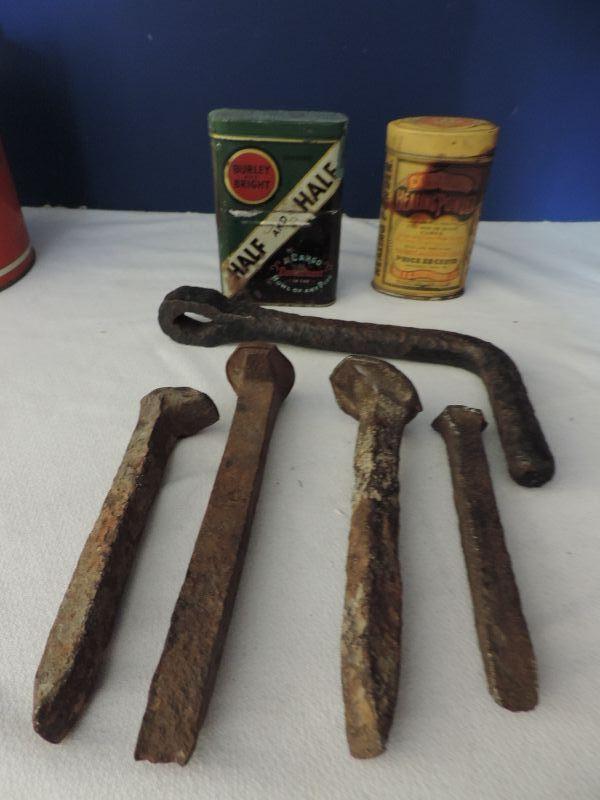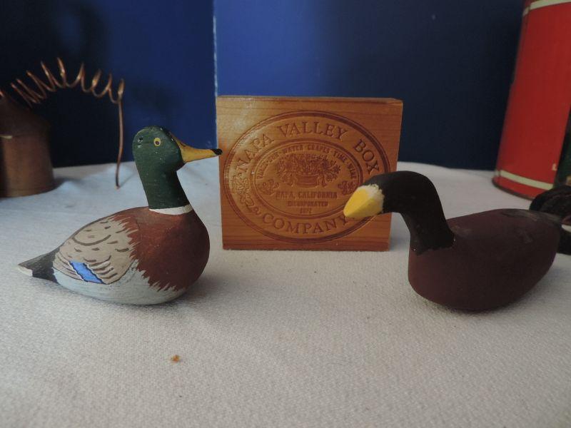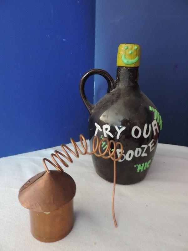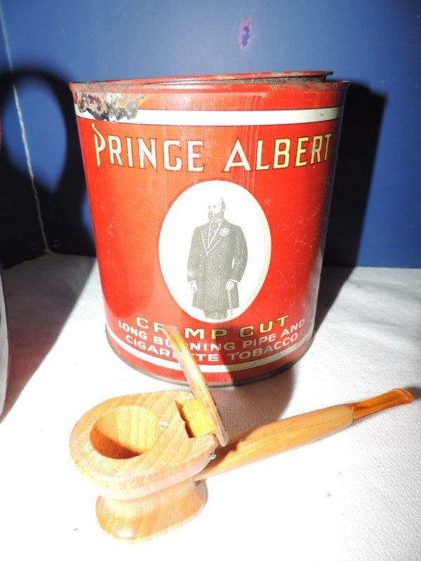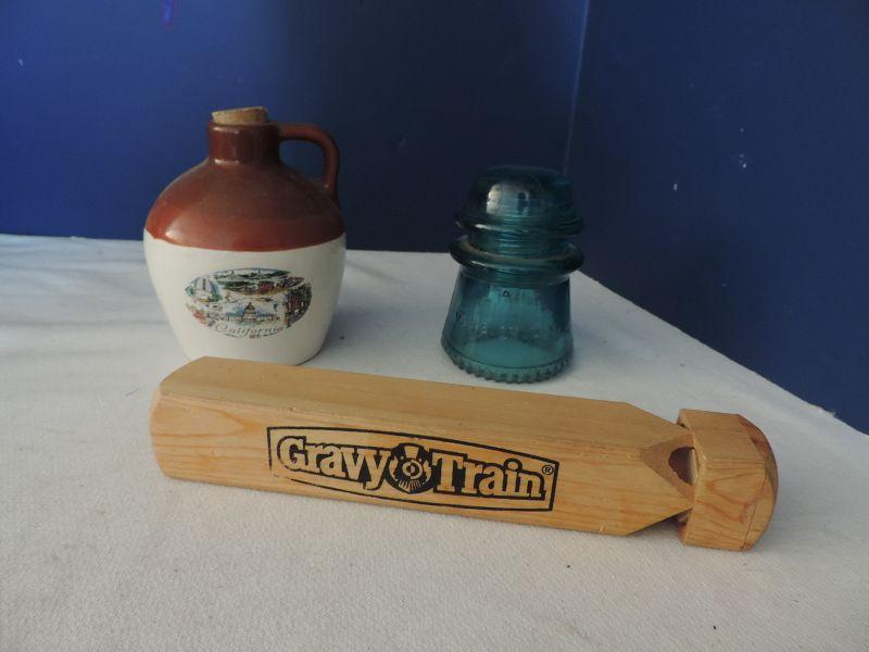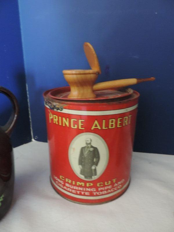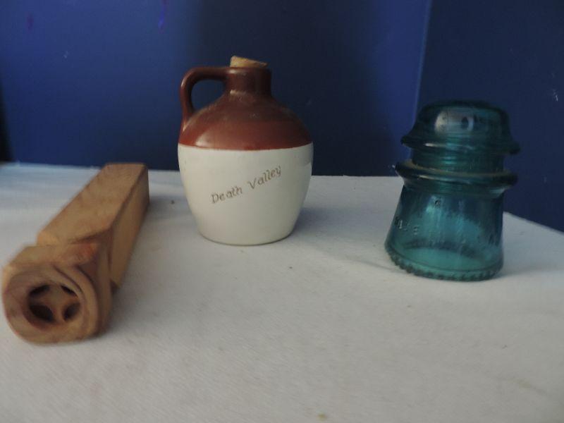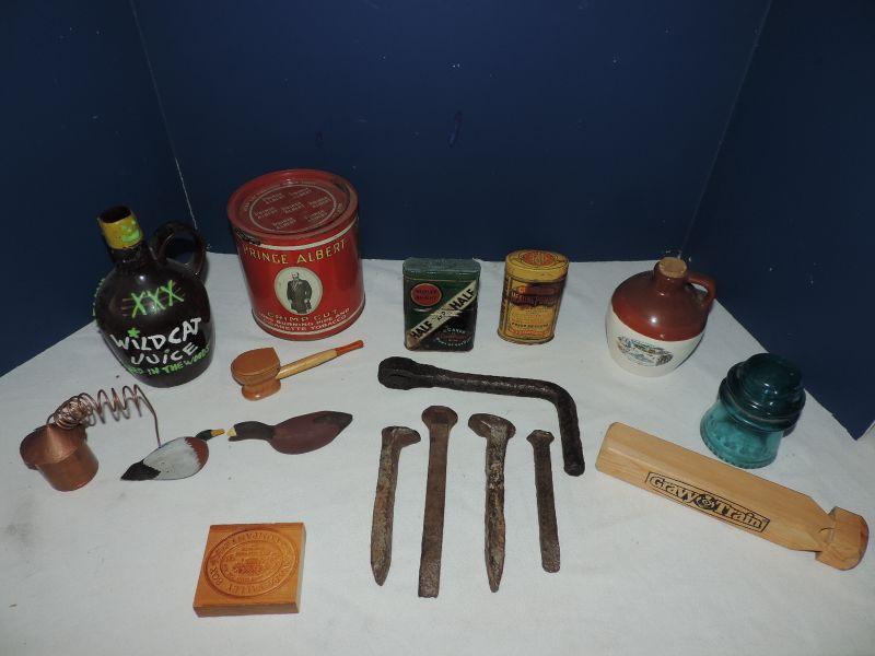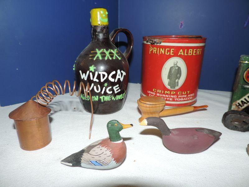 TOBACCO TIN-WOOD DUCKS-WOOD TOBBACCO PIPE-CLAY JUG-WILDCAT JUICE -WOOD WHISTLE-AND MORE