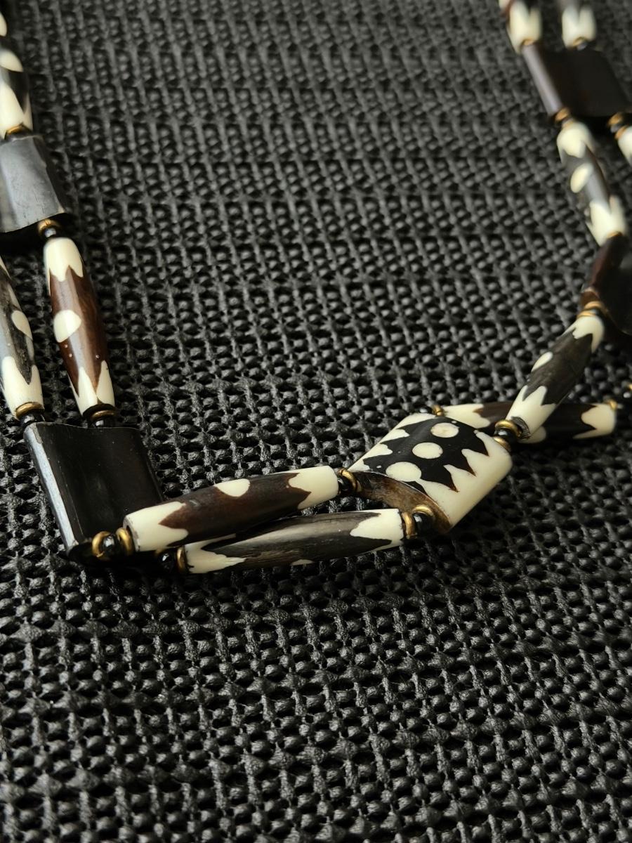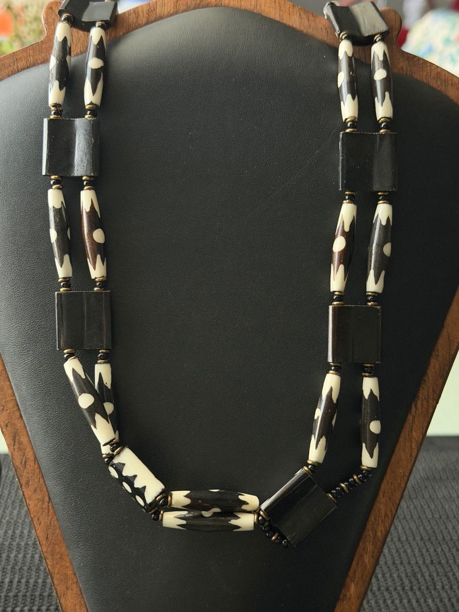 vintage African black and white batik bone necklace, like handmade in Kenya.