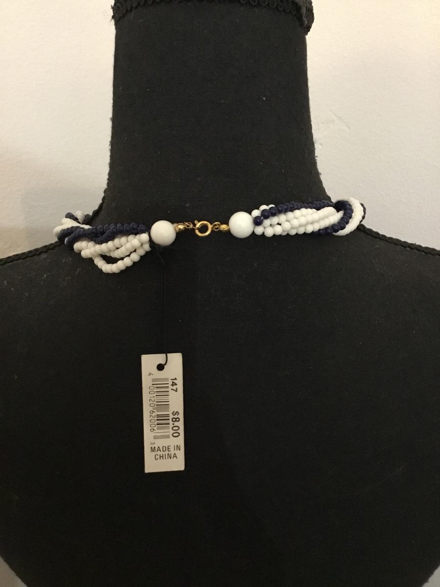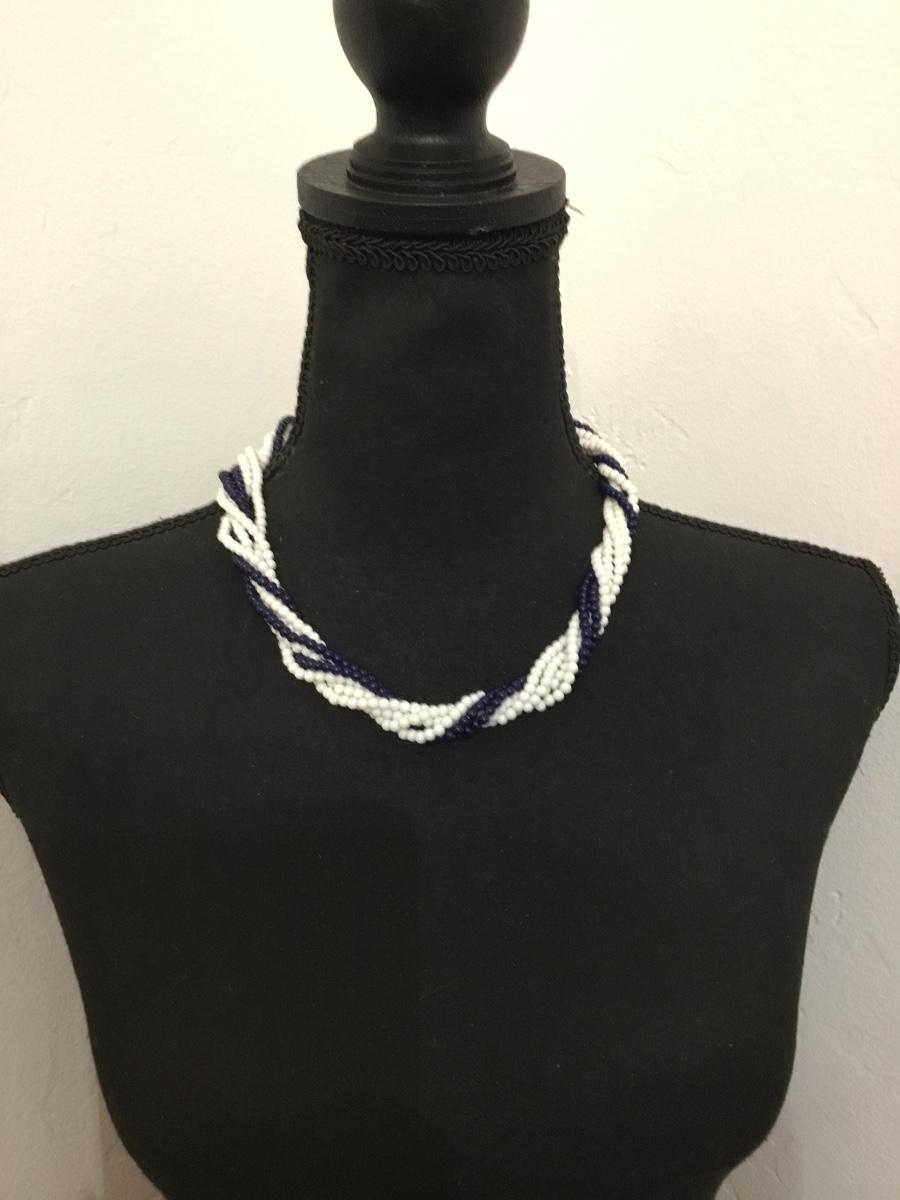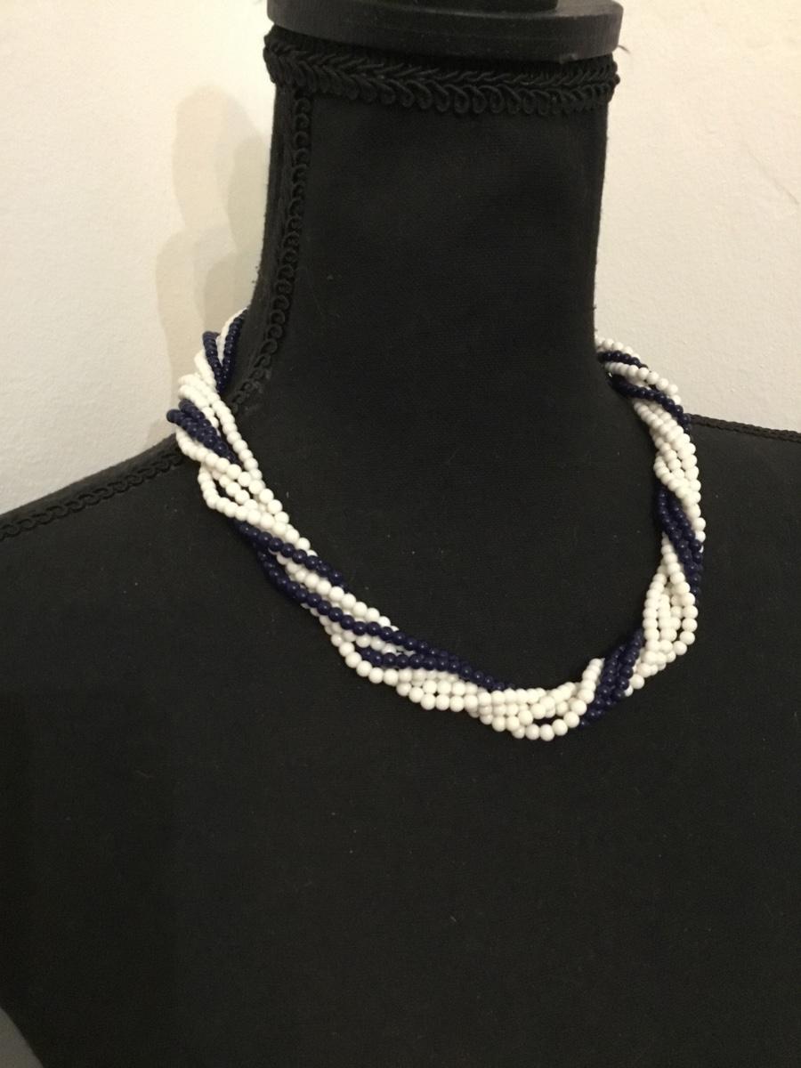 Vintage afterthoughts, dark navy blue white twisted, multi strand bead collar necklace