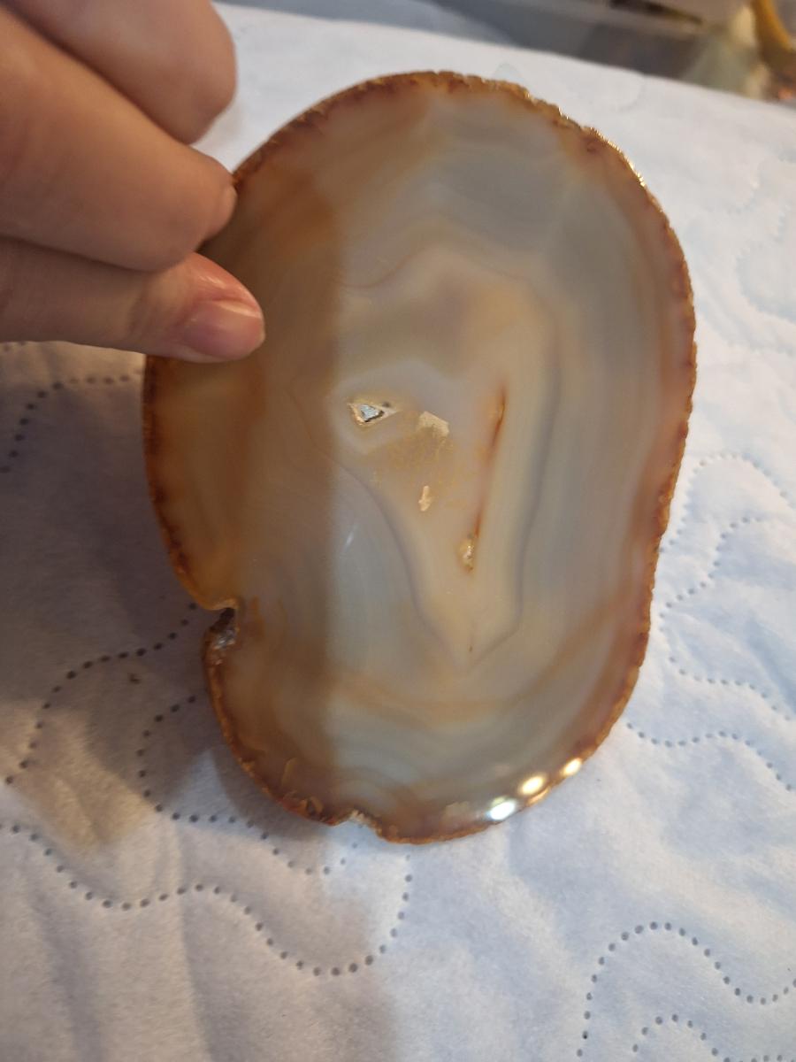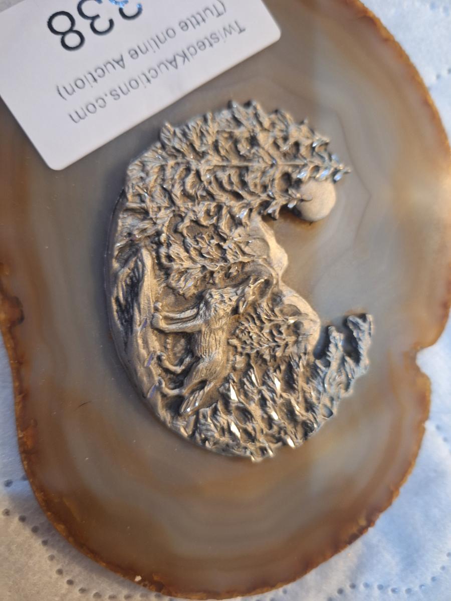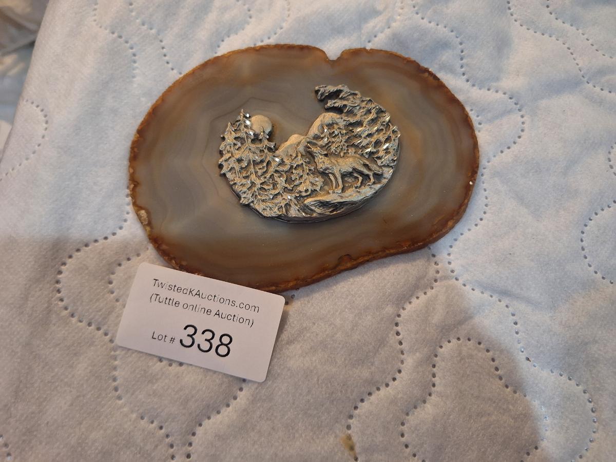 vintage agate slice with silver colored wilderness scene- wolf in the woods.