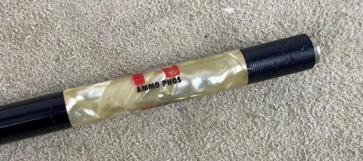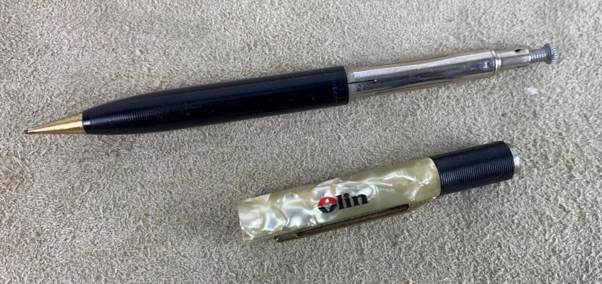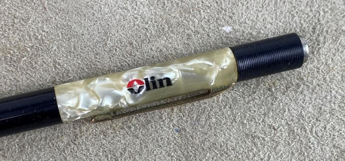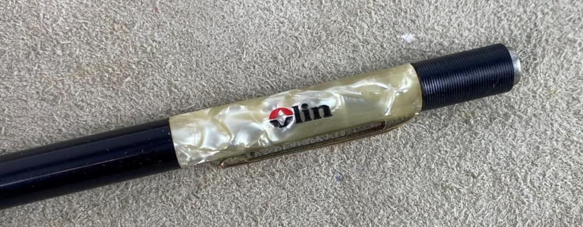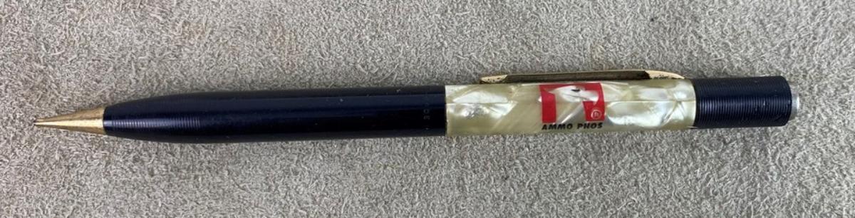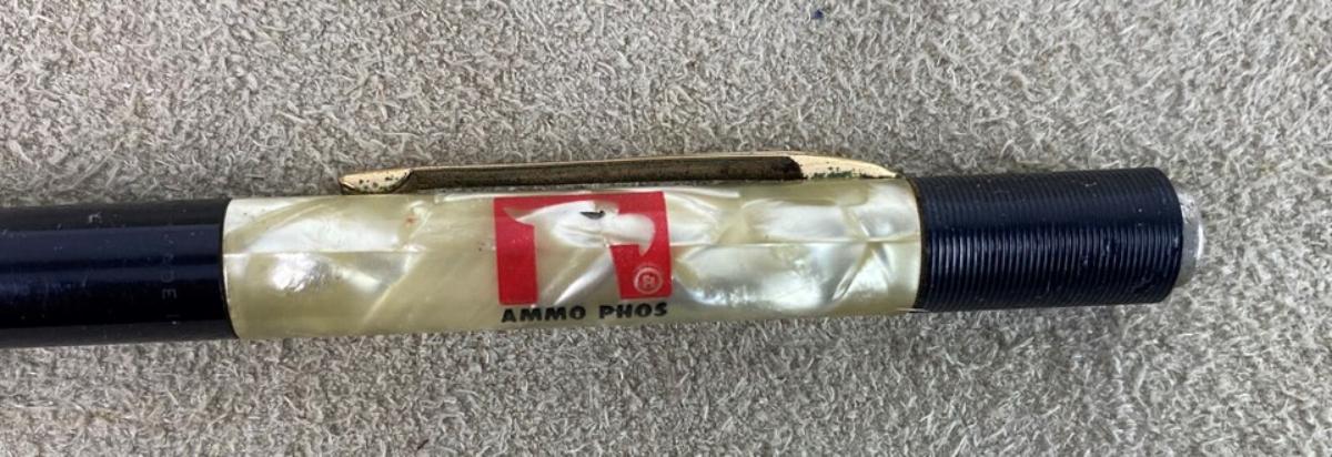 With some normal age and use wear here is a Sheaffer Fineline advertising mechanical pencil promoting OLIN AMMO-PHOS fertilizer...Pearlized band..5.25" long...Working condition.