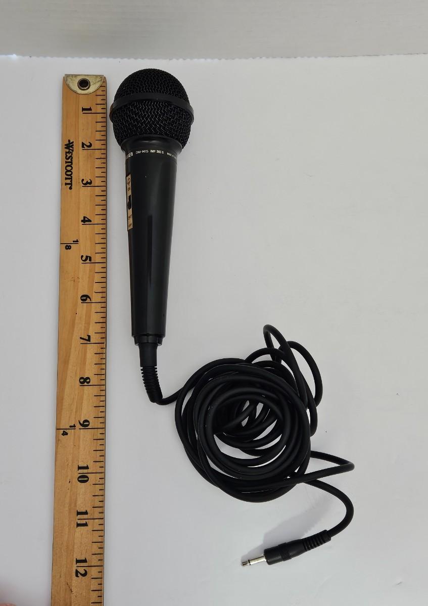 This is a vintage Aiwa DM-H15 dynamic microphone, a popular model from the 1980s that was often bundled with consumer-grade cassette decks and karaoke systems. It is a reliable, lightweight, wired microphone featuring a cardioid (unidirectional) pickup pattern, designed to focus on sound coming directly from the front. The microphone is suitable for karaoke, voice recording, or as a nostalgic collectible piece of audio equipment.