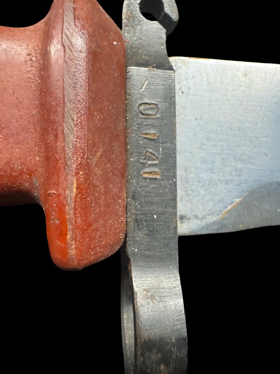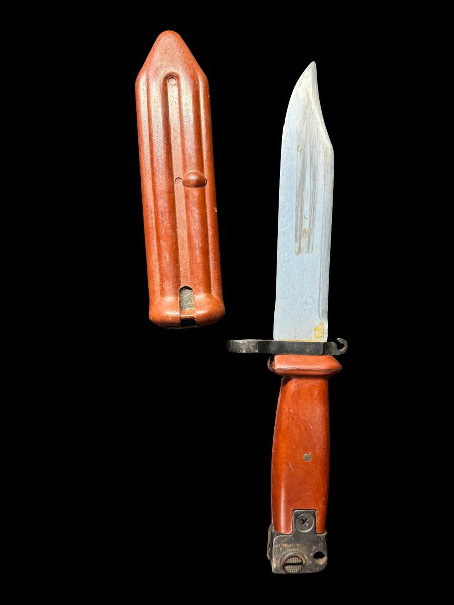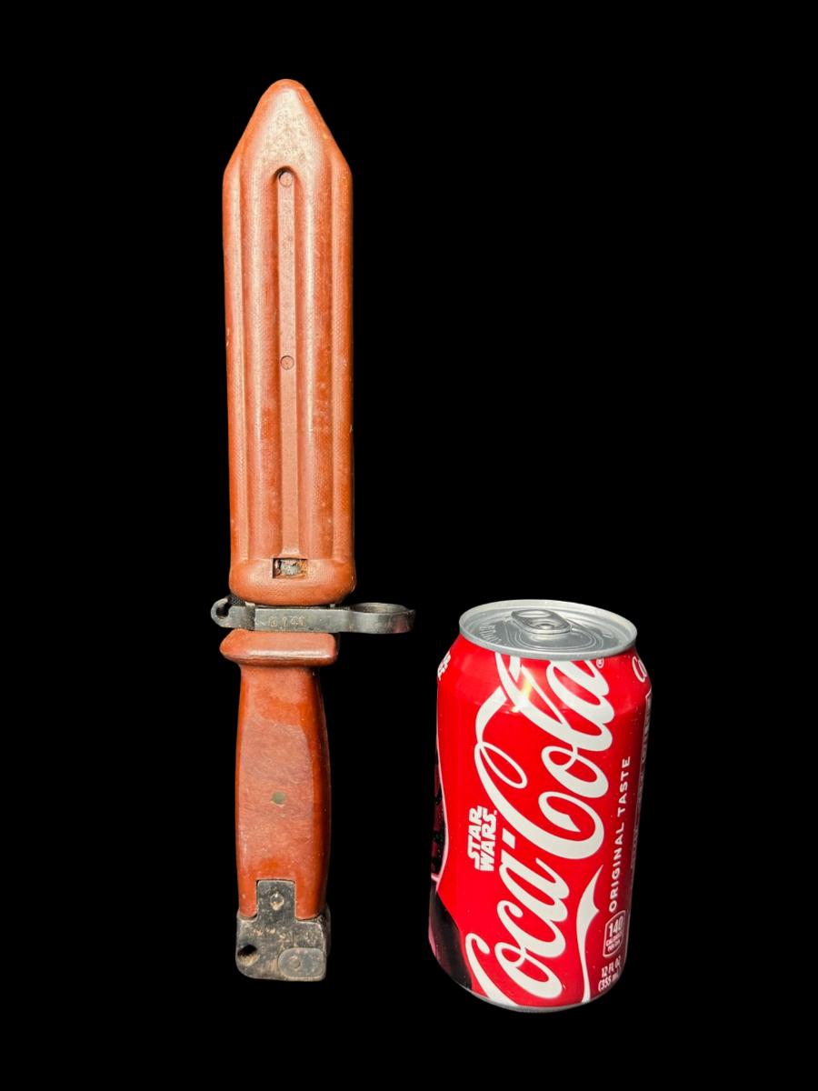 Designed for the 7.62mm Kalashnikov assault rifle. One piece molded plastic grip, in brown. Produced by Russia and/or other Eastern Block countries. This is a clean piece, with little wear. Measurement: 10.5”L. [JR]