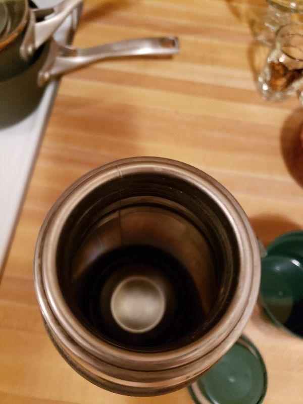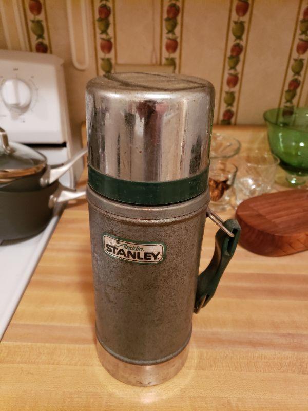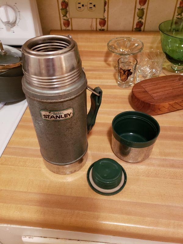 Great condition. Glass interior. Green. Thermos with handle,screw on cap ,cup.