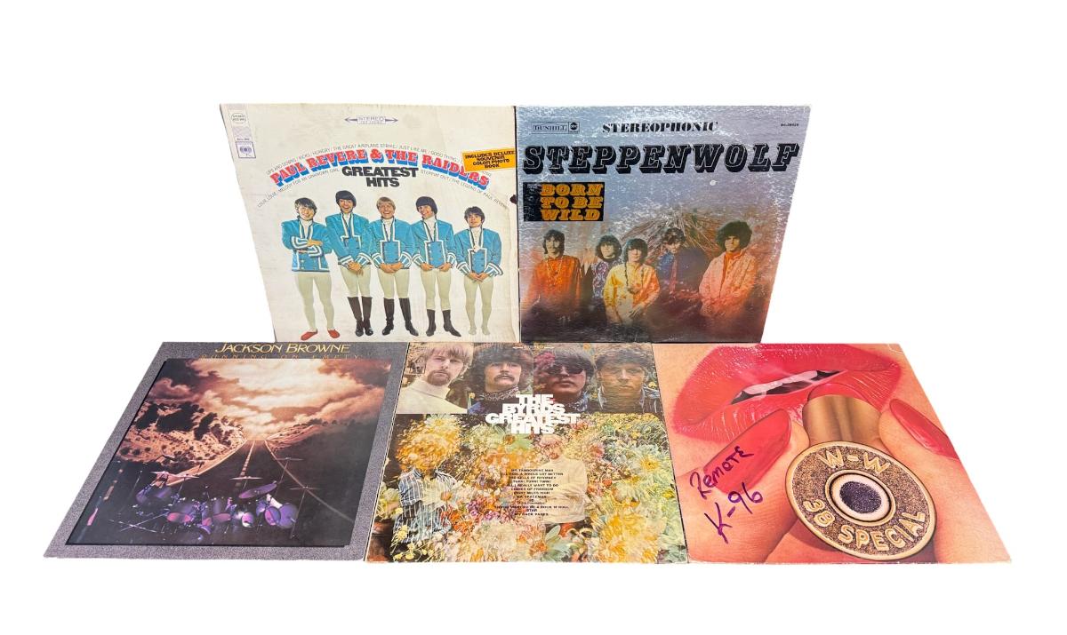 Includes Steppenwolf, Paul Revere & The Raiders, Jackson Browne, .38 Special, and The Byrds. Total of five albums. There is age related wear, including staining on some of the jackets.