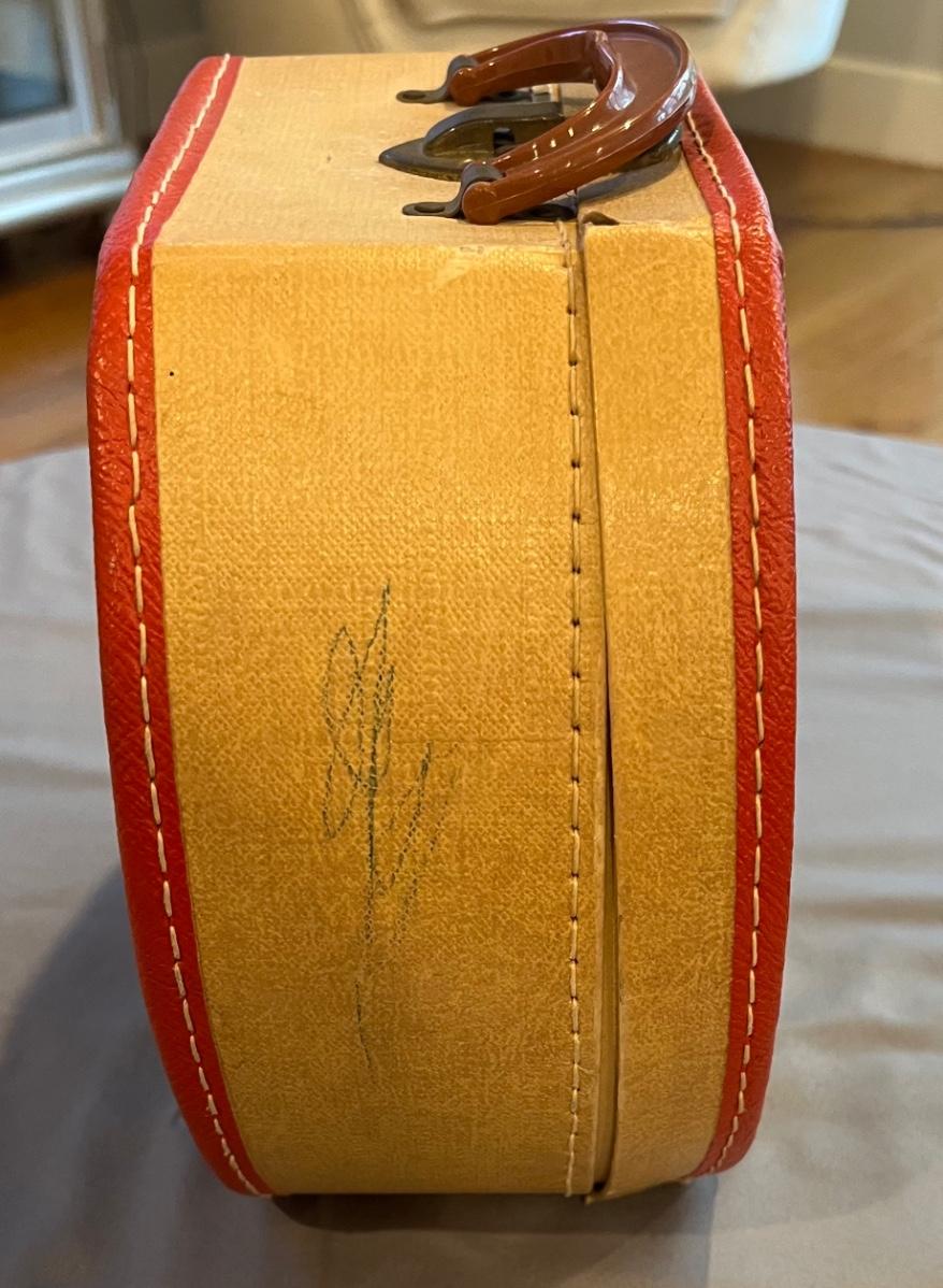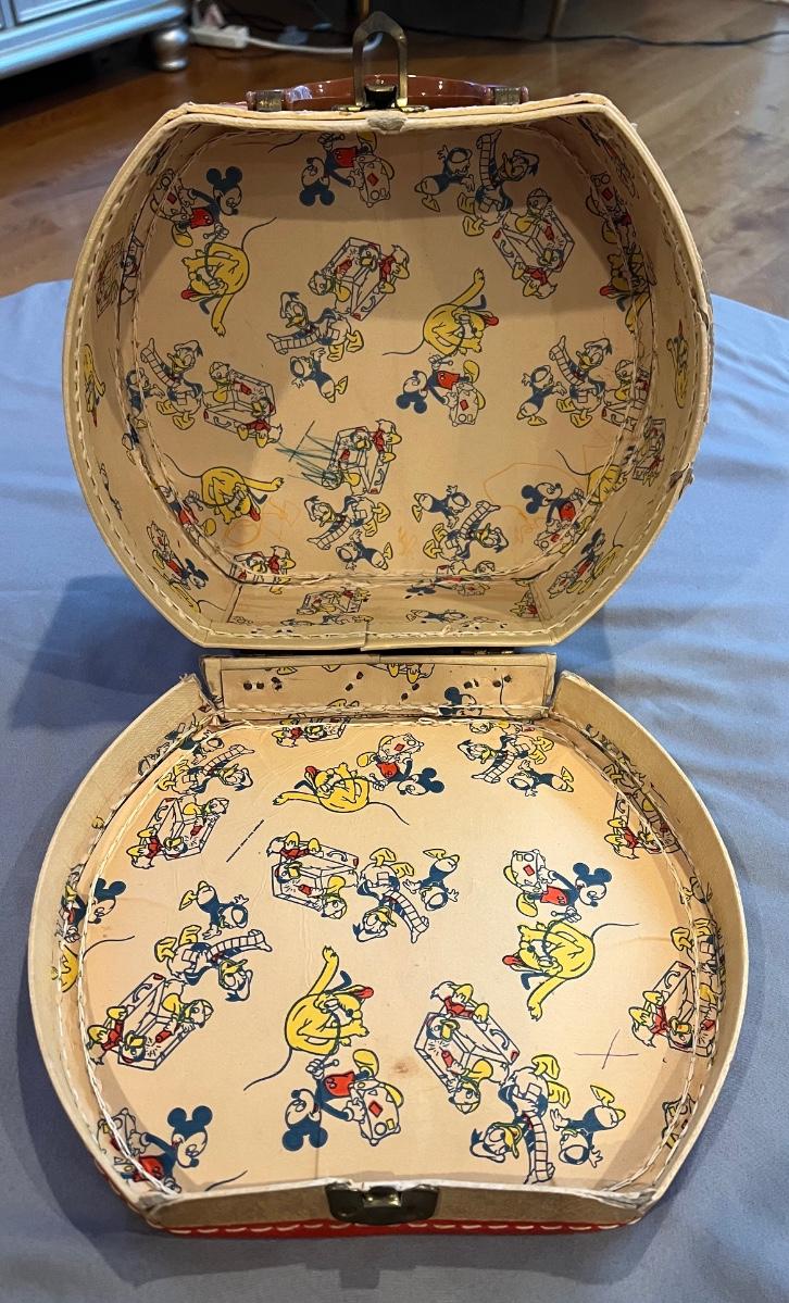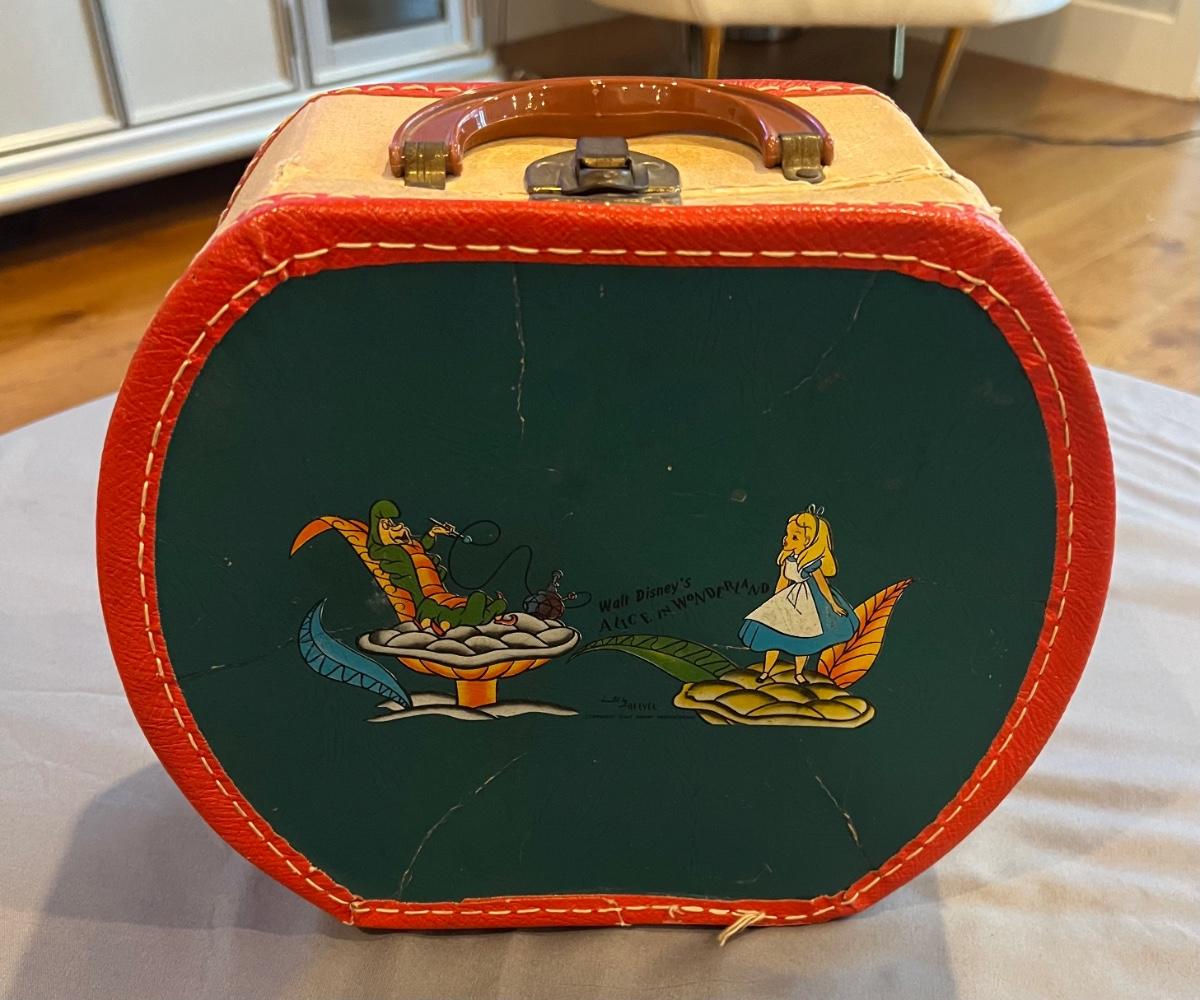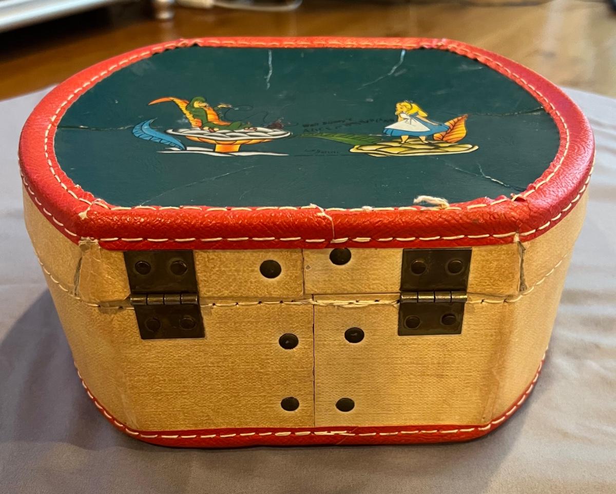 Nice Walt Disney Productions built by NEEVEL Childs travel case in fair condition for its age and use. Has Alice in Wonderland on one side and is blank on the other side. Case is made of cardboard and has some ware and tear damage on the lid and the bottom corners (see pics). It measures approximately 5 inches deep, 10.5 inches wide and 9.5 inches tall. A good piece for your collection since it's made of cardboard I'm surprised it's in as good of shape and condition as it is.