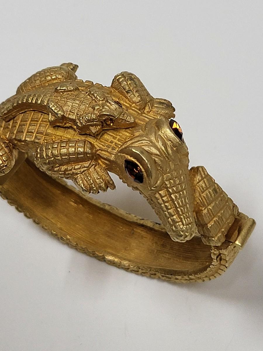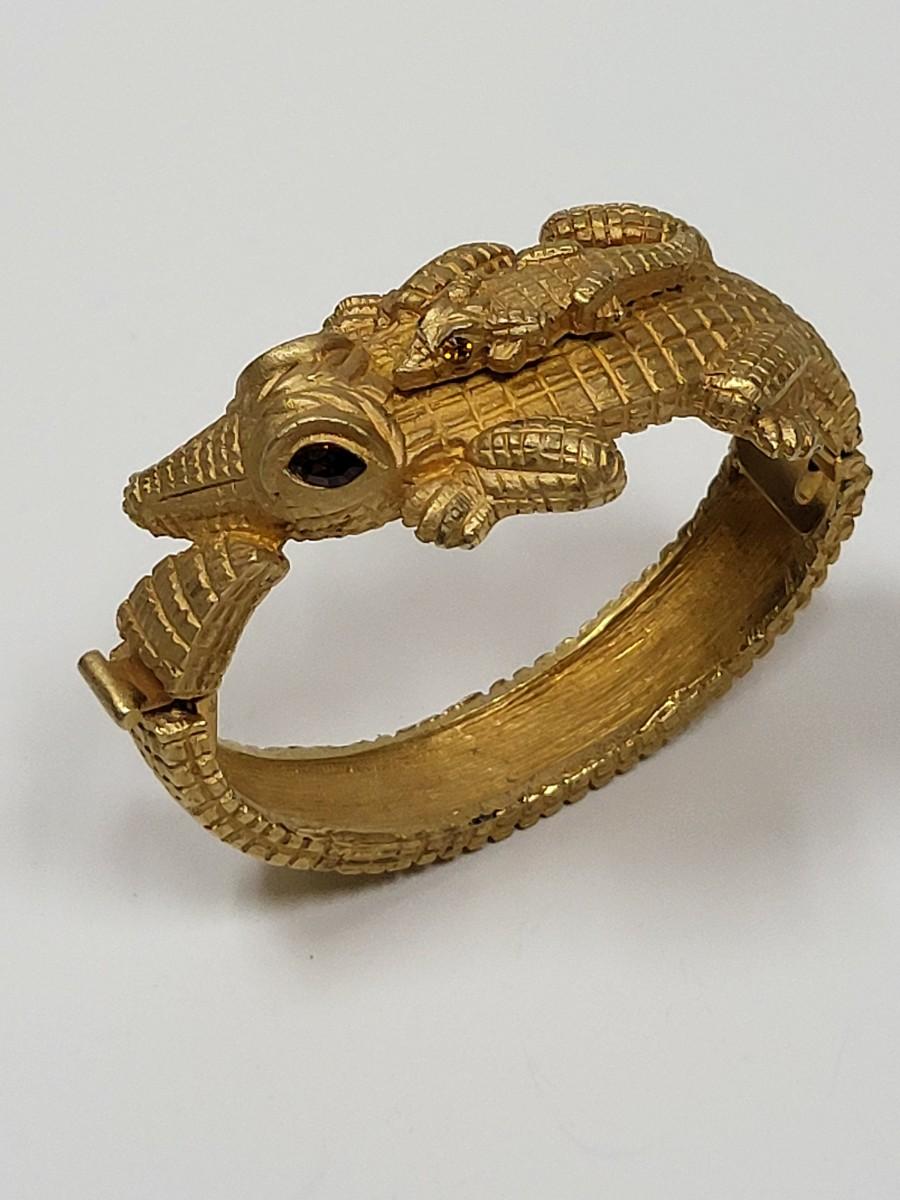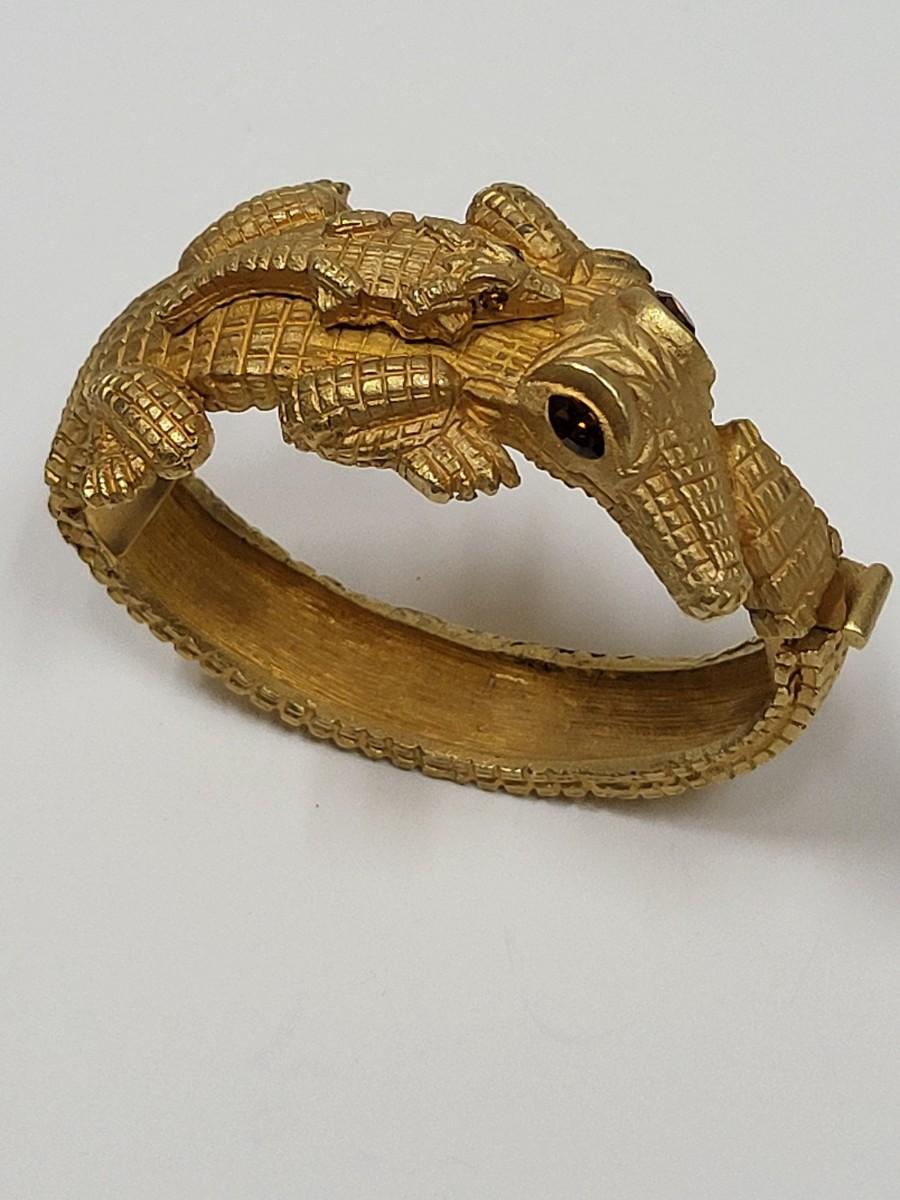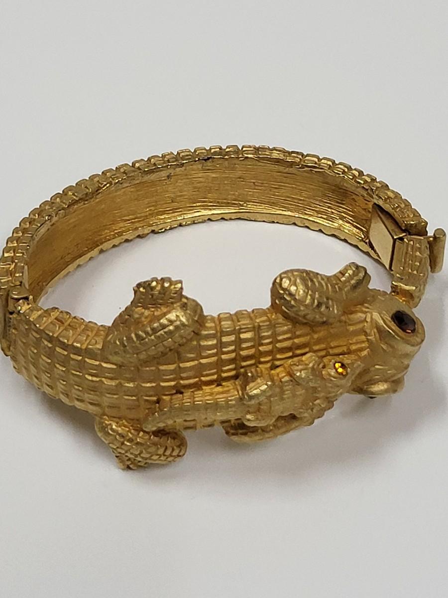 Momma alligator with baby alligator on her back. Topaz orange rhinestone eyes. Textured band, gold tone metal. Secure push clasp closure, and hinged clamper style bangle bracelet.