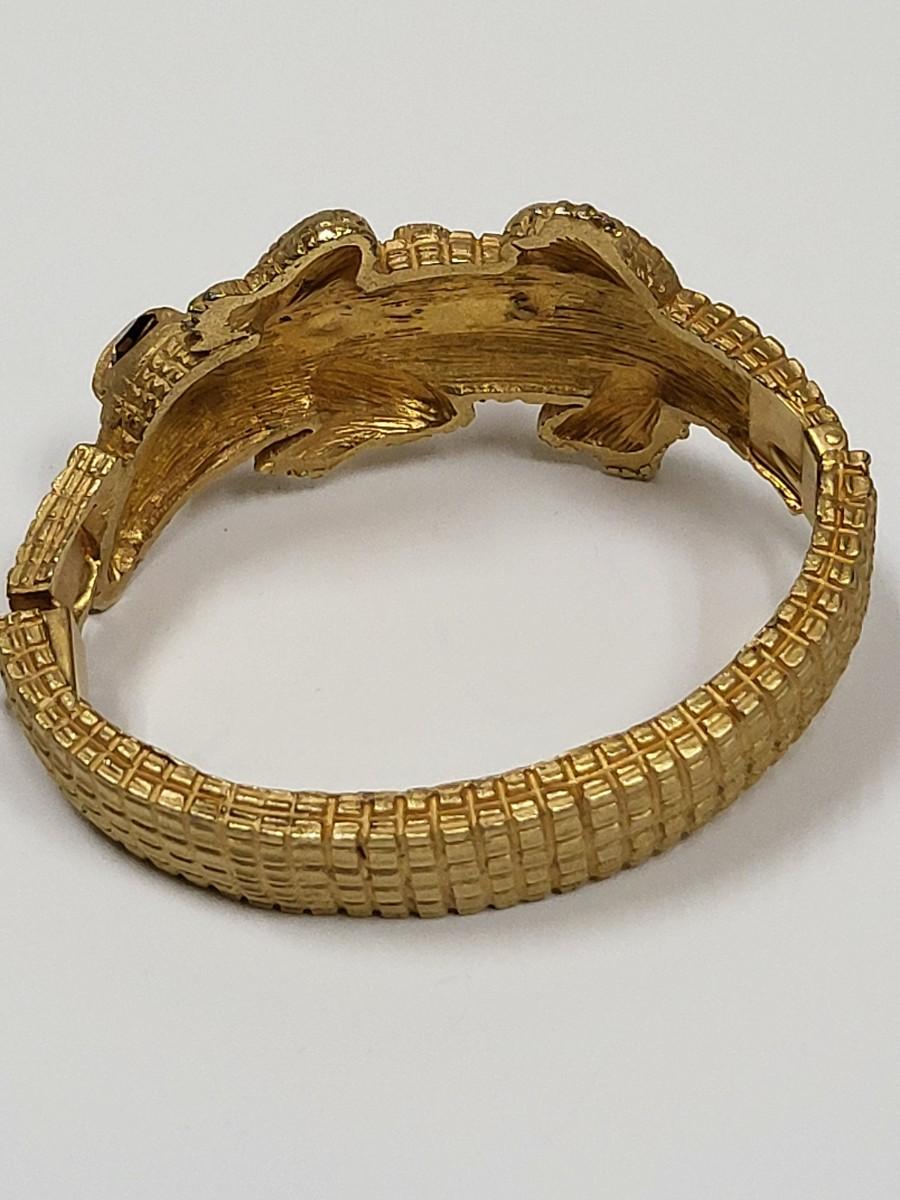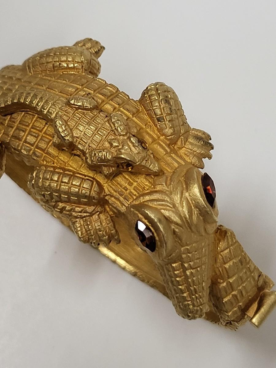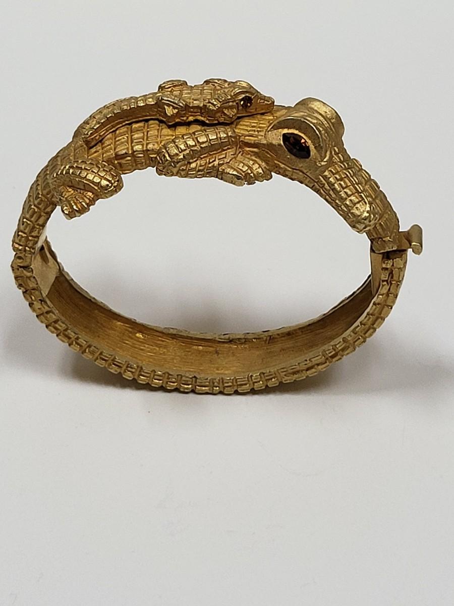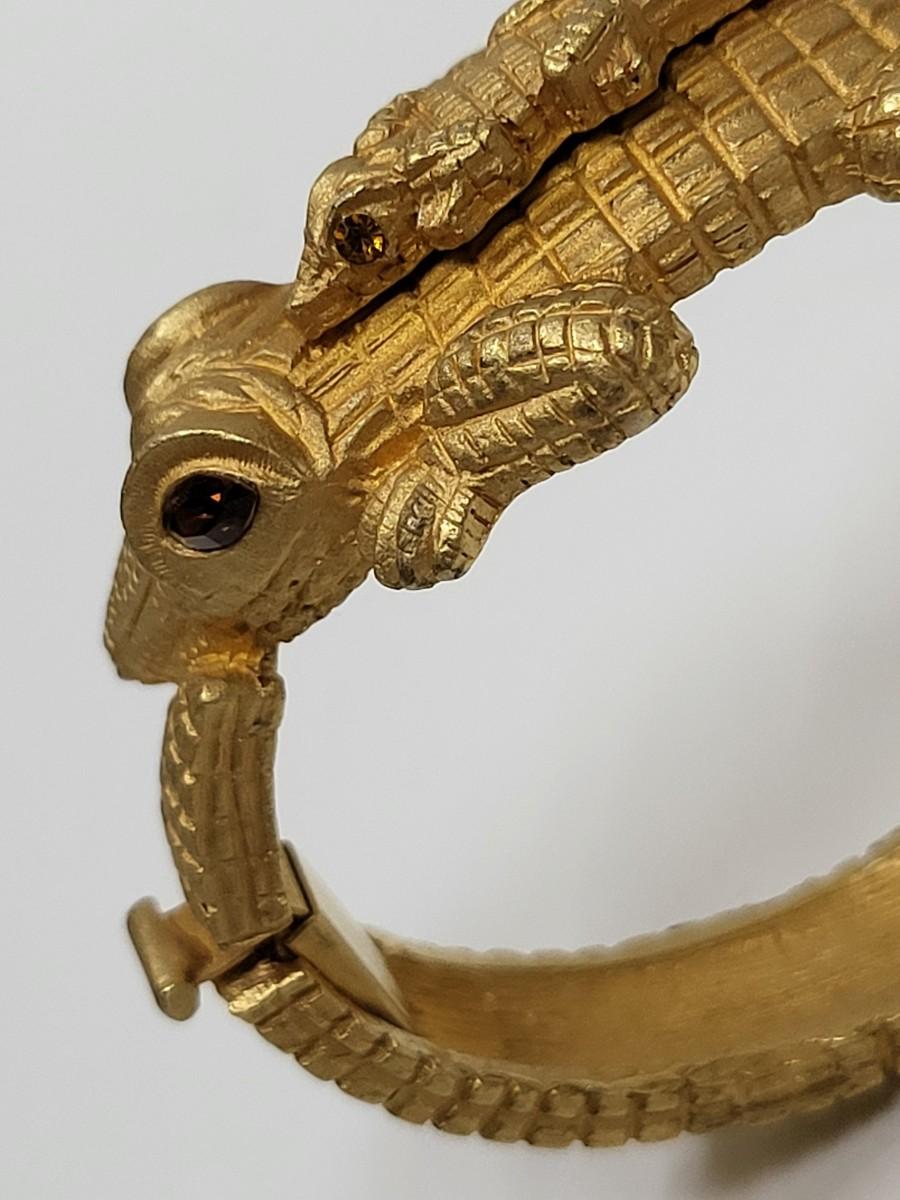 Momma alligator with baby alligator on her back. Topaz orange rhinestone eyes. Textured band, gold tone metal. Secure push clasp closure, and hinged clamper style bangle bracelet.