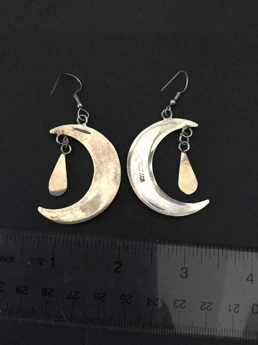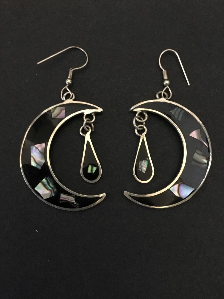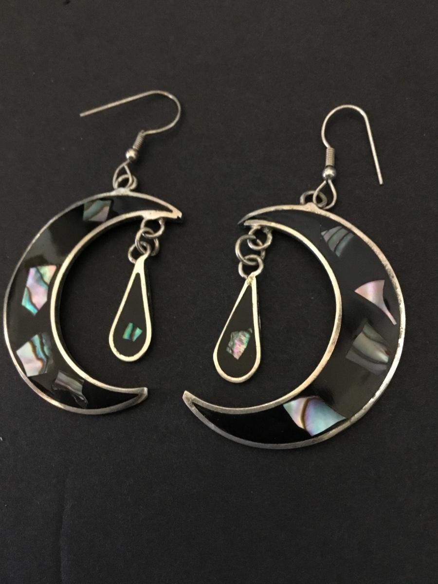 Vintage alpaca, Mexico, silver, ablone shell, inlay moon, dangle earrings