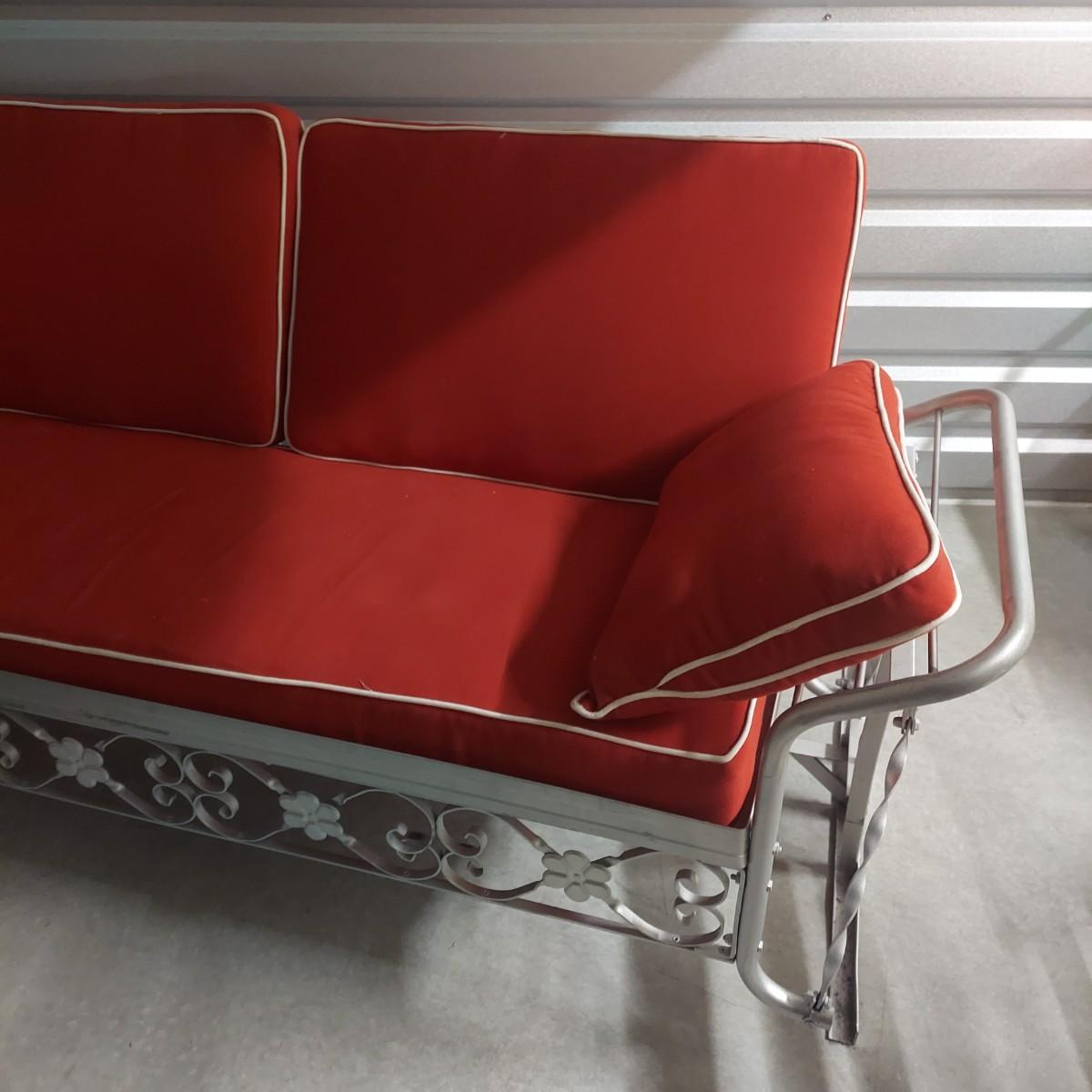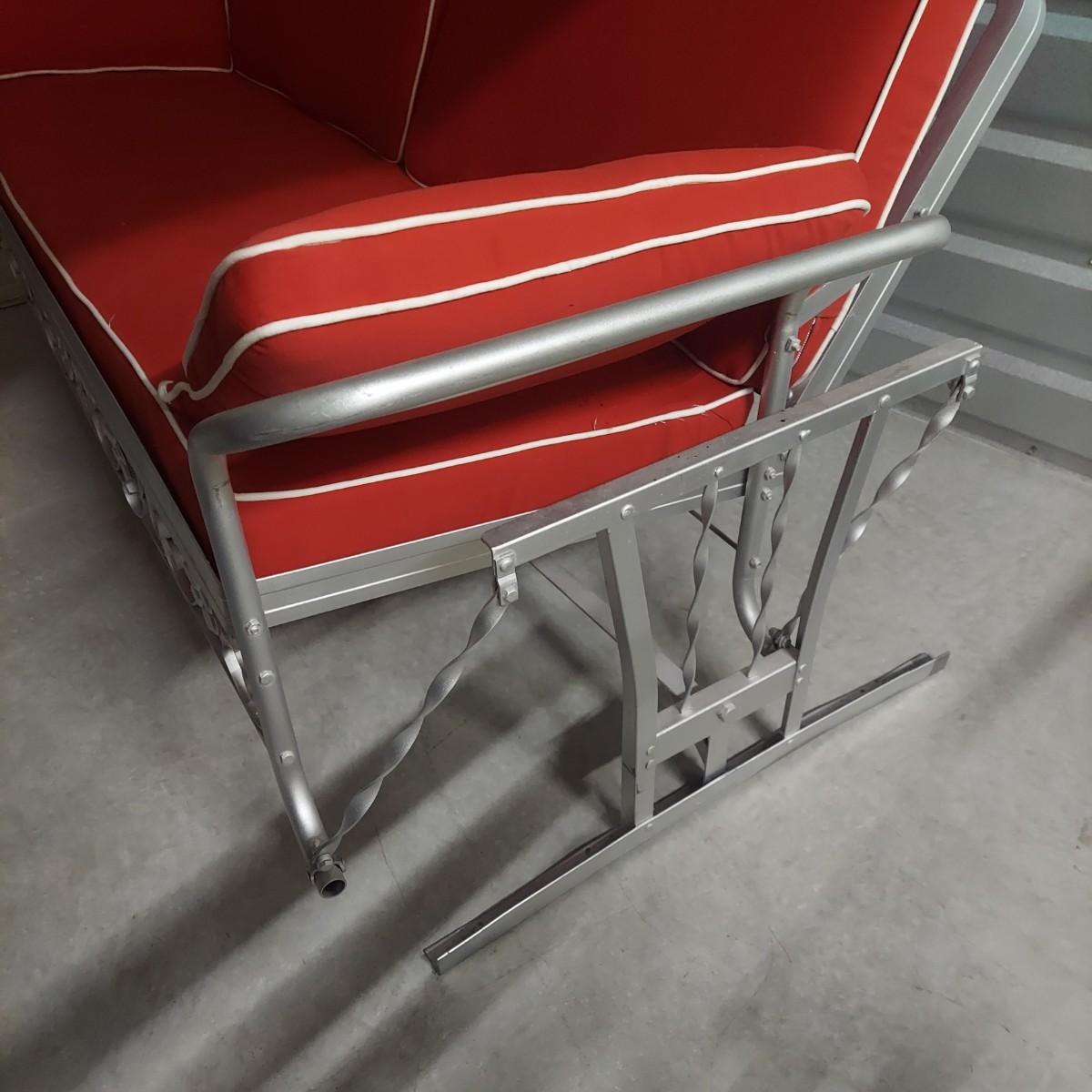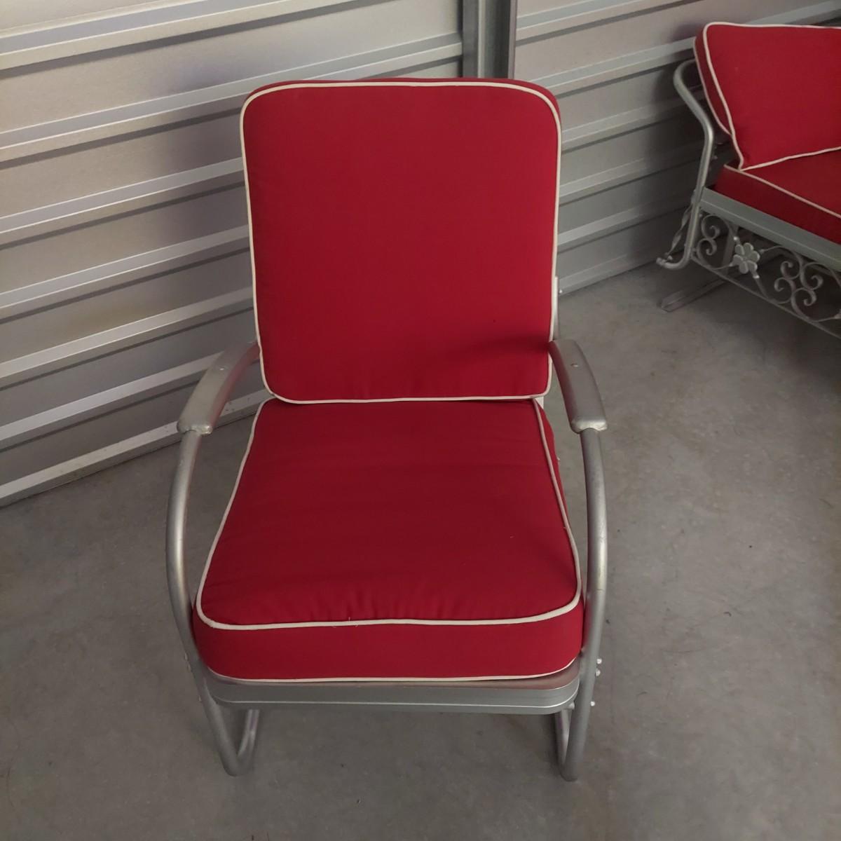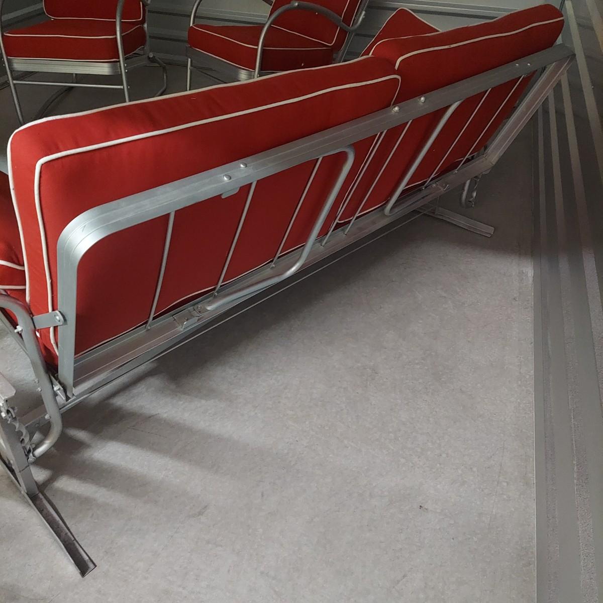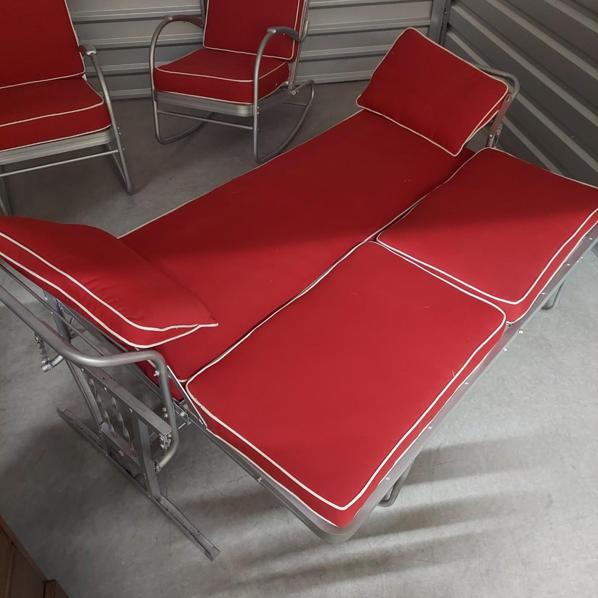 Vintage three-piece aluminum patio set that appears to be Bunting Co. based on the style and approximate age, though there is no label so we cannot confirm this. Set includes a sleeper glider, a rocking lounge chair and a stationary lounge chair. Comes with removable red cushions for all pieces that appear to be original based on the heavy canvas material, the stuffing type and the metal zippers. Please see photos for details. Glider measures approximately 82” x 35” x 35"H with a seat height of 19”. Rocker measures approximately 24” x 33” x 35"H with a 20” seat height. Side chair measures approximately 24” x 33” x 35"H with a 20” seat height. Local Pickup Only. Winning bidder must bring assistance to help move and load this item due to its weight and/or size.
