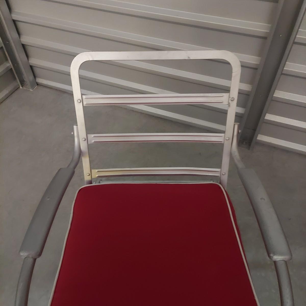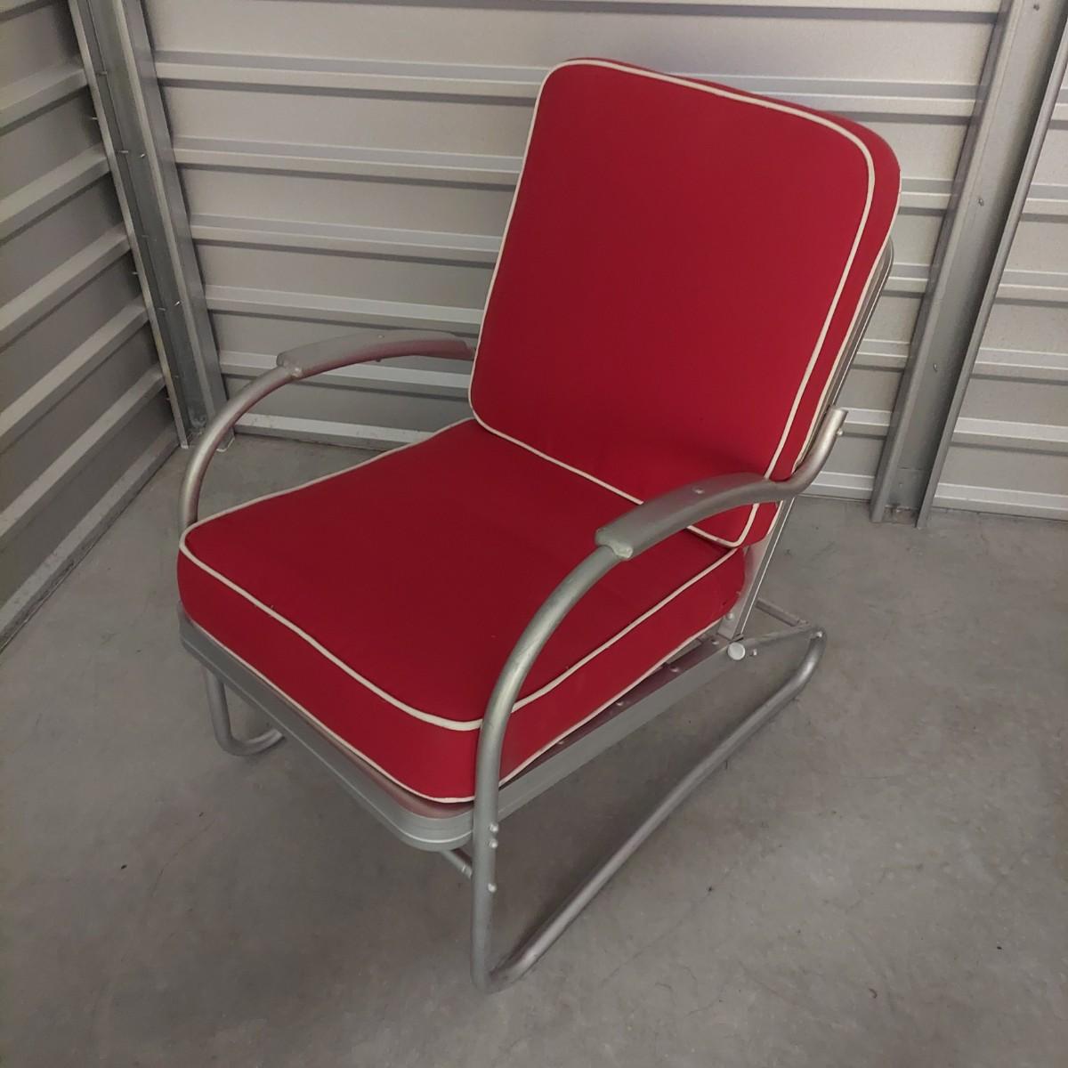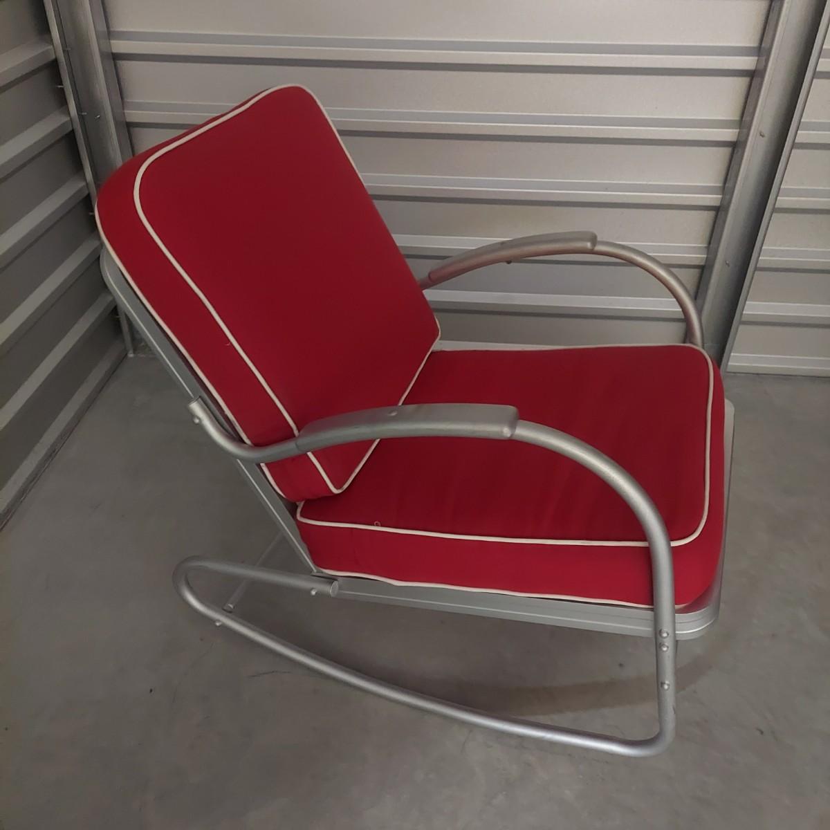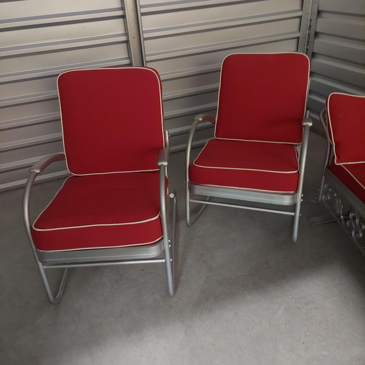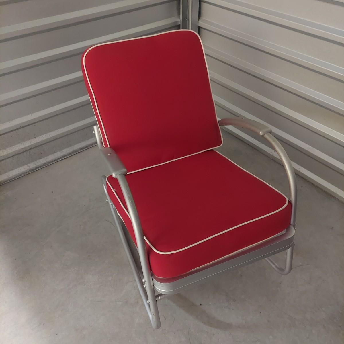 Vintage three-piece aluminum patio set that appears to be Bunting Co. based on the style and approximate age, though there is no label so we cannot confirm this. Set includes a sleeper glider, a rocking lounge chair and a stationary lounge chair. Comes with removable red cushions for all pieces that appear to be original based on the heavy canvas material, the stuffing type and the metal zippers. Please see photos for details. Glider measures approximately 82” x 35” x 35"H with a seat height of 19”. Rocker measures approximately 24” x 33” x 35"H with a 20” seat height. Side chair measures approximately 24” x 33” x 35"H with a 20” seat height. Local Pickup Only. Winning bidder must bring assistance to help move and load this item due to its weight and/or size.