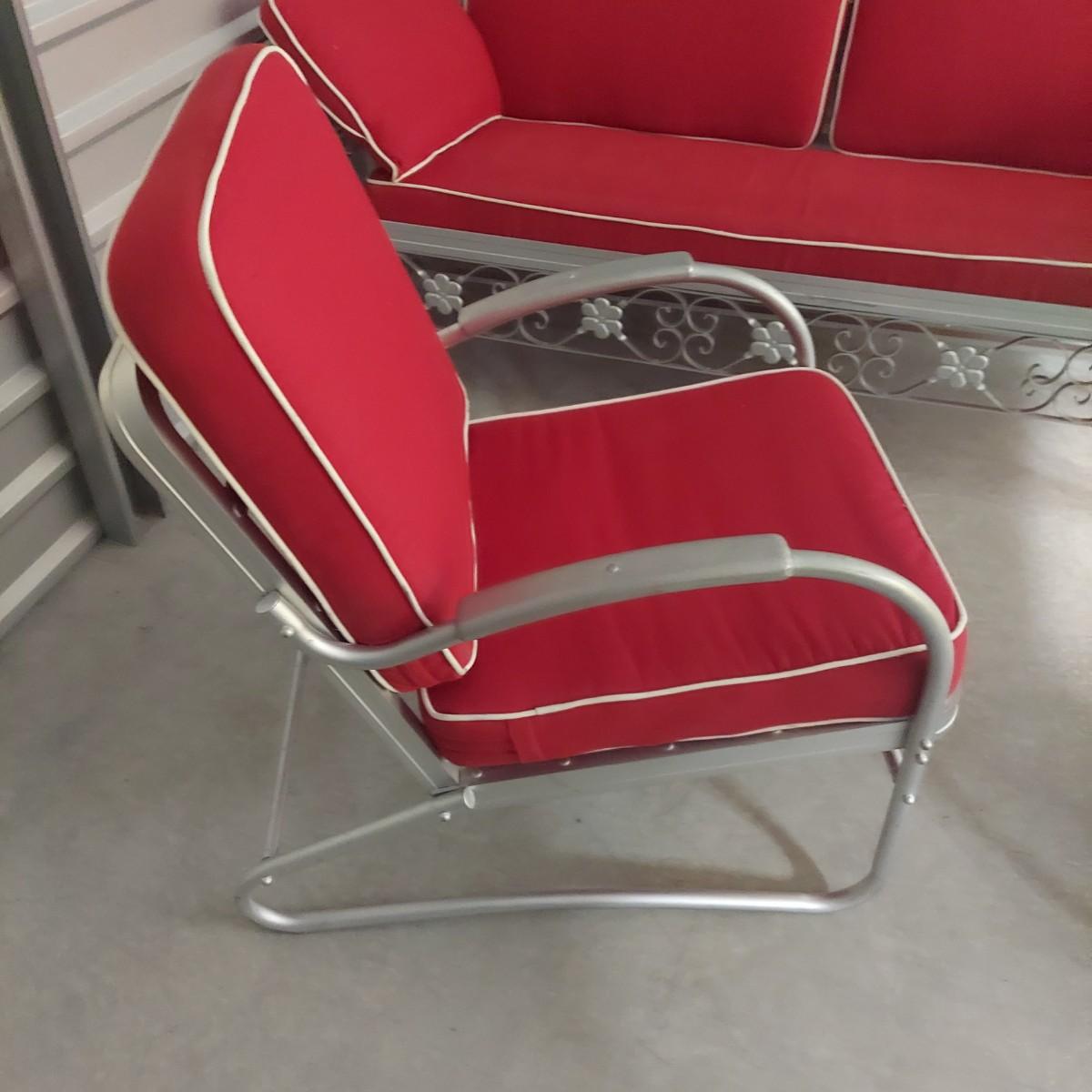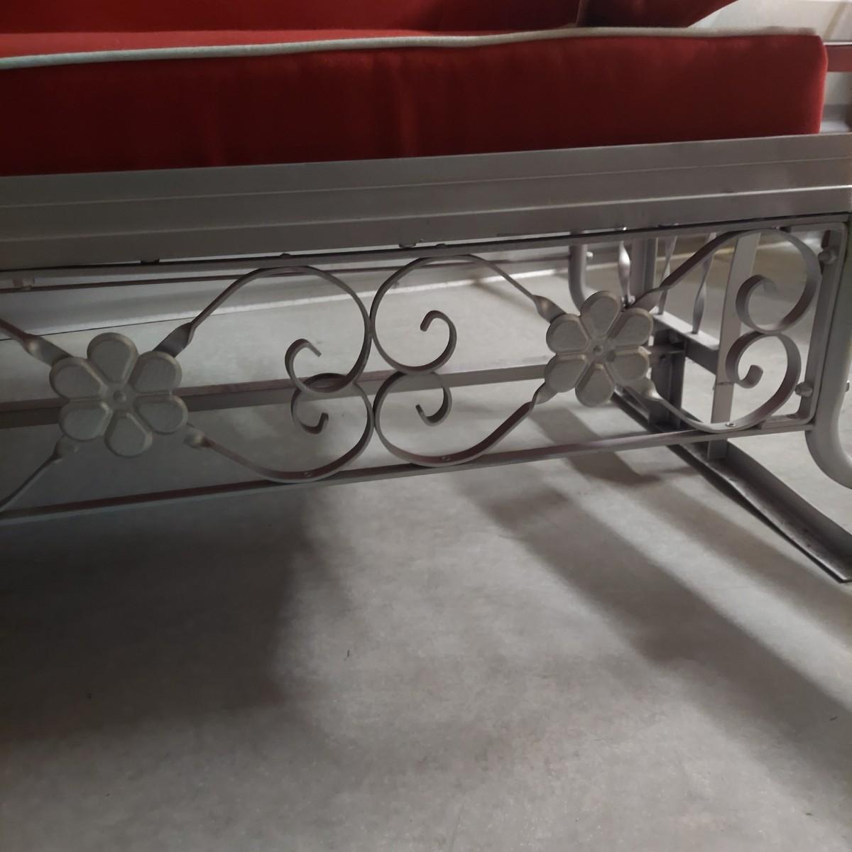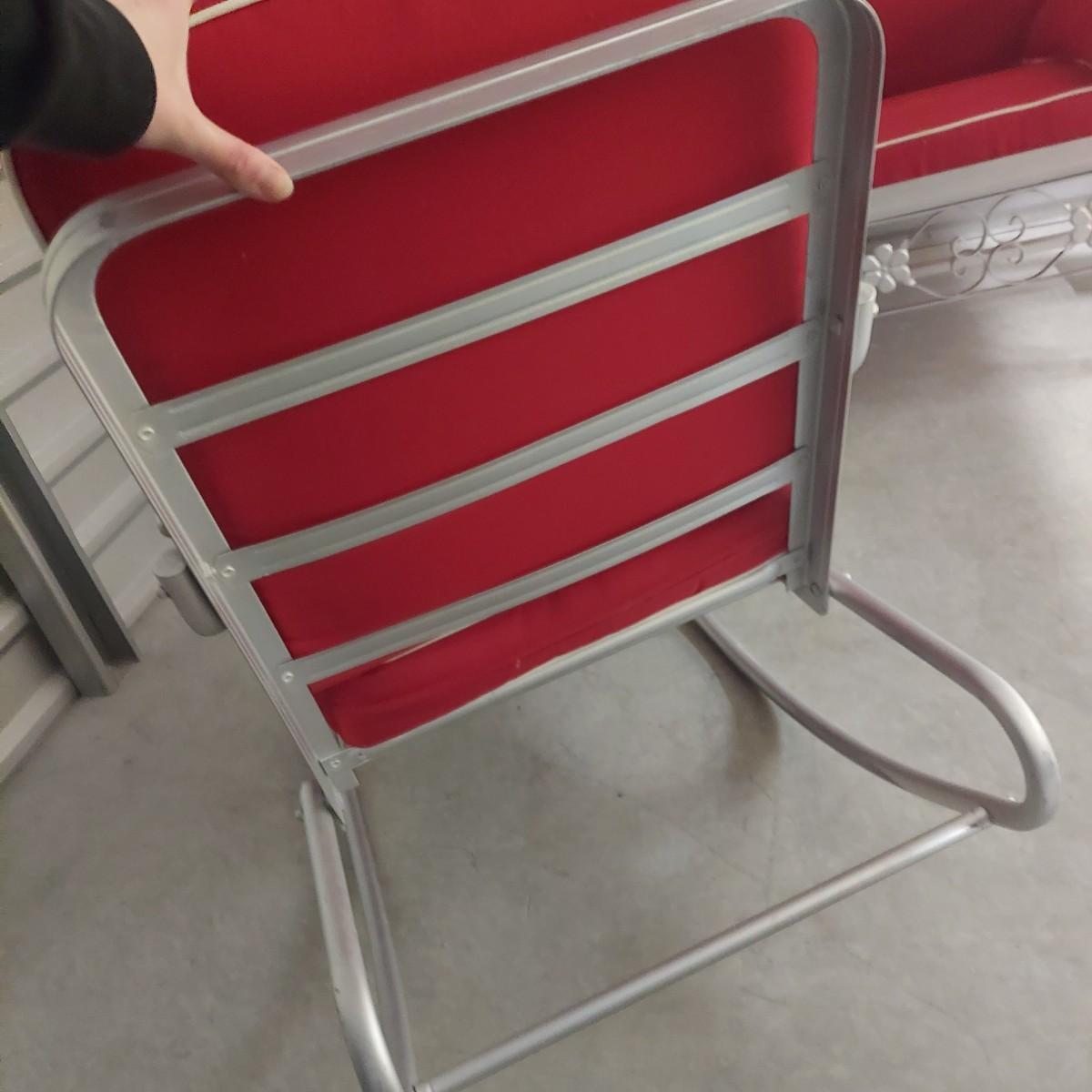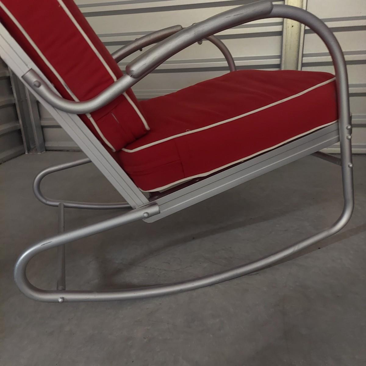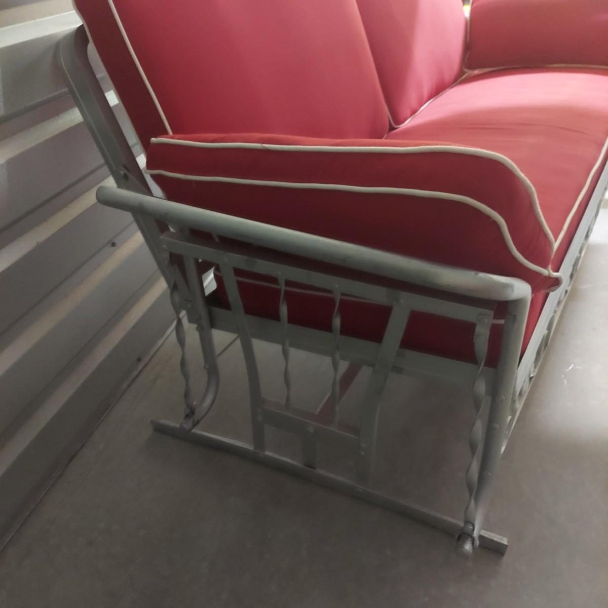 Vintage three-piece aluminum patio set that appears to be Bunting Co. based on the style and approximate age, though there is no label so we cannot confirm this. Set includes a sleeper glider, a rocking lounge chair and a stationary lounge chair. Comes with removable red cushions for all pieces that appear to be original based on the heavy canvas material, the stuffing type and the metal zippers. Please see photos for details. Glider measures approximately 82” x 35” x 35"H with a seat height of 19”. Rocker measures approximately 24” x 33” x 35"H with a 20” seat height. Side chair measures approximately 24” x 33” x 35"H with a 20” seat height. Local Pickup Only. Winning bidder must bring assistance to help move and load this item due to its weight and/or size.