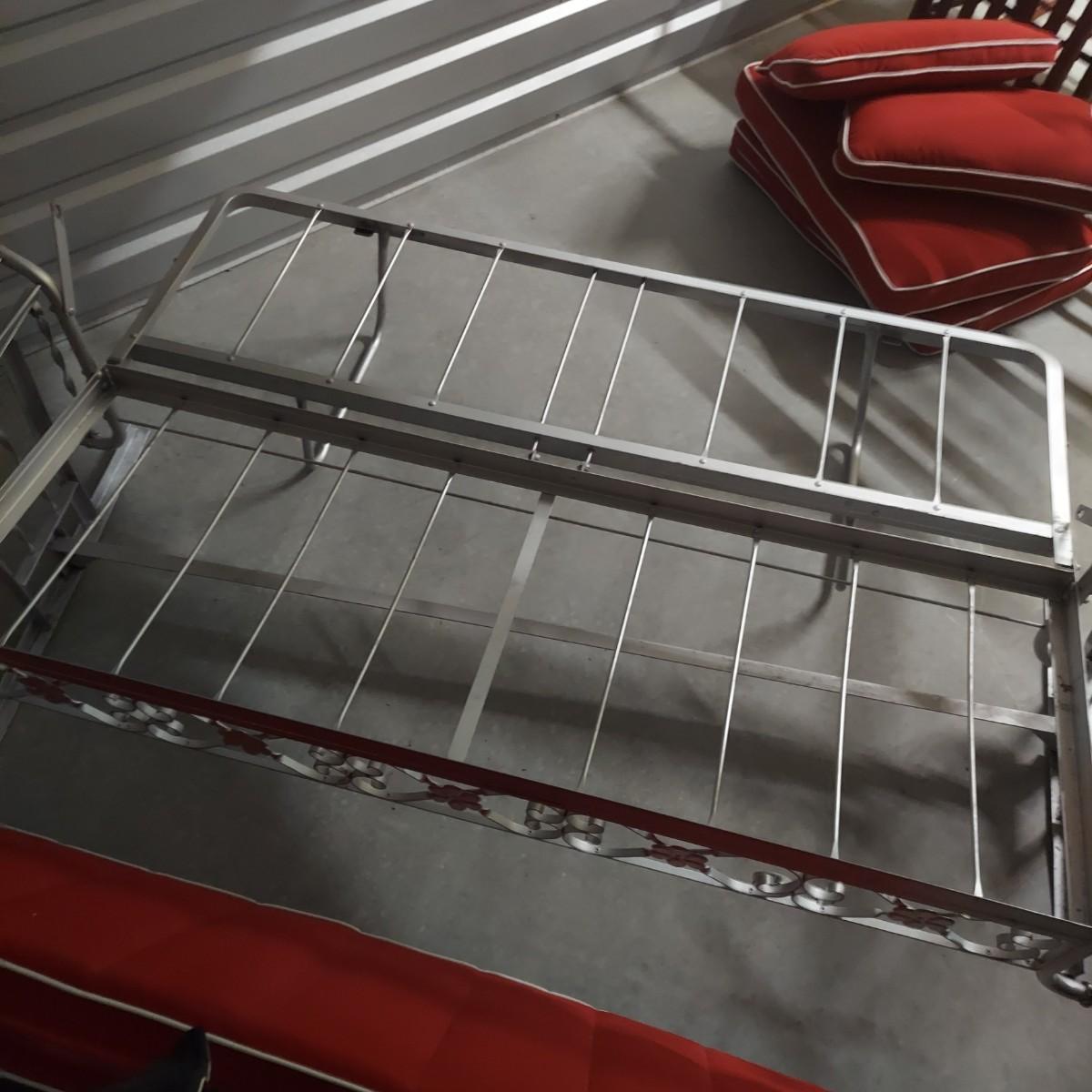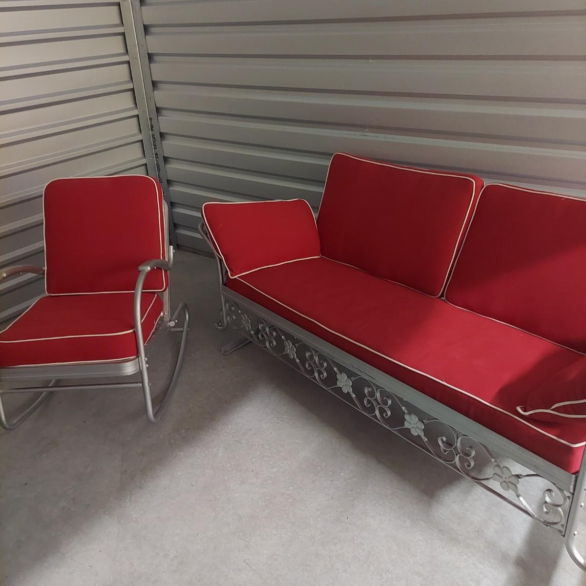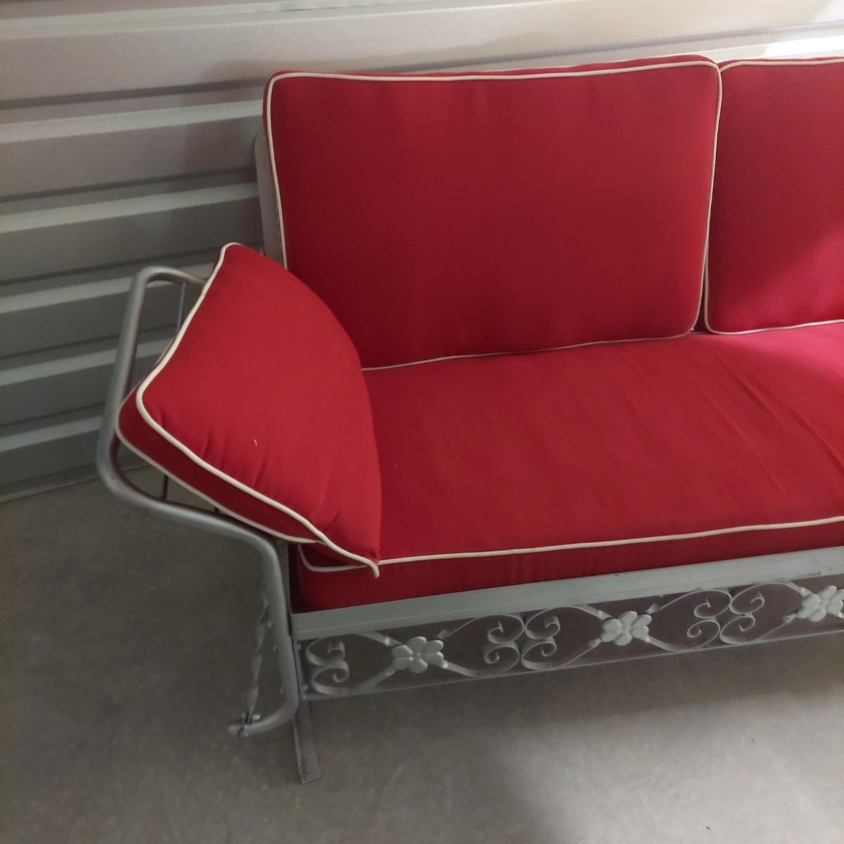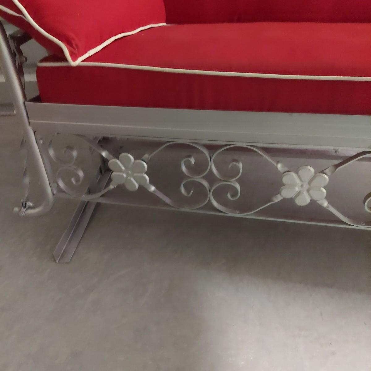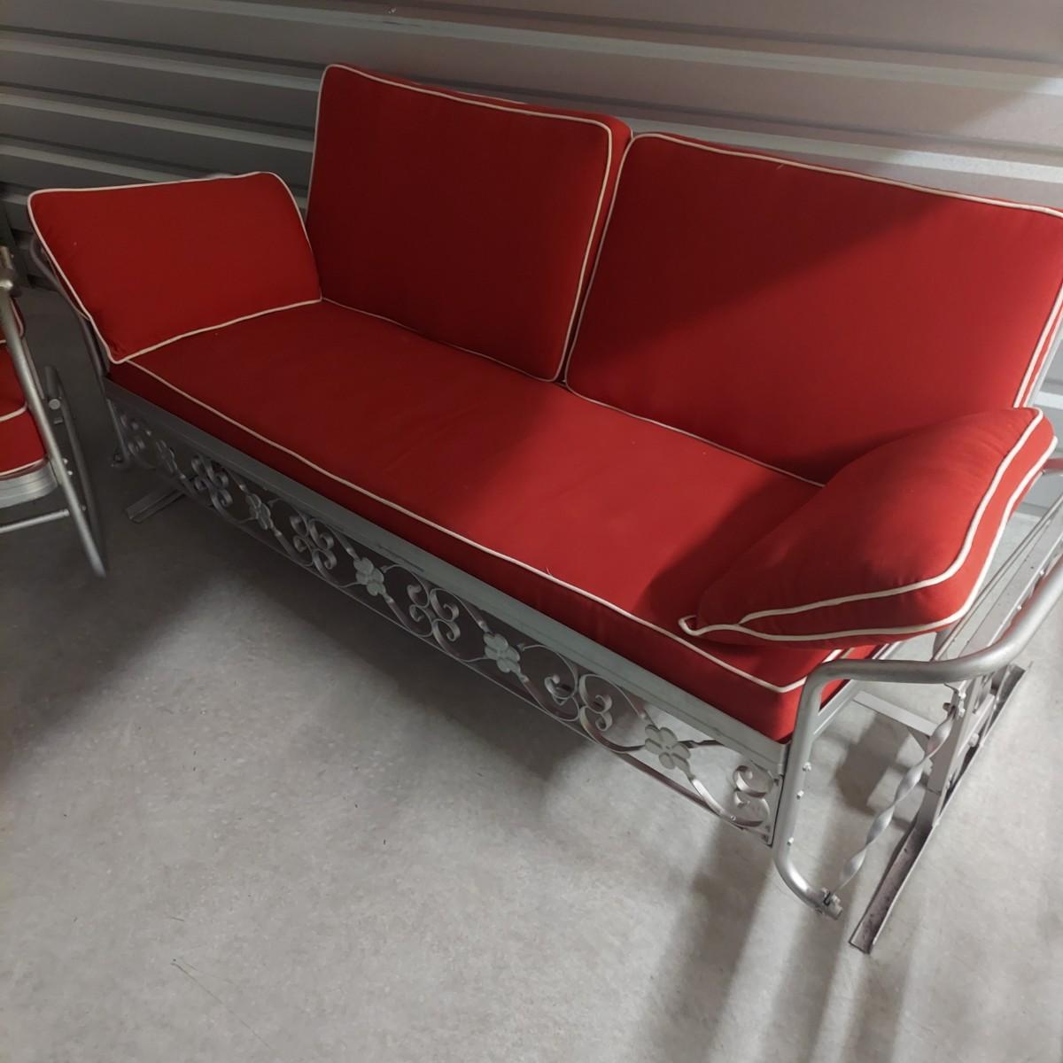 Vintage three-piece aluminum patio set that appears to be Bunting Co. based on the style and approximate age, though there is no label so we cannot confirm this. Set includes a sleeper glider, a rocking lounge chair and a stationary lounge chair. Comes with removable red cushions for all pieces that appear to be original based on the heavy canvas material, the stuffing type and the metal zippers. Please see photos for details. Glider measures approximately 82” x 35” x 35"H with a seat height of 19”. Rocker measures approximately 24” x 33” x 35"H with a 20” seat height. Side chair measures approximately 24” x 33” x 35"H with a 20” seat height. Local Pickup Only. Winning bidder must bring assistance to help move and load this item due to its weight and/or size.