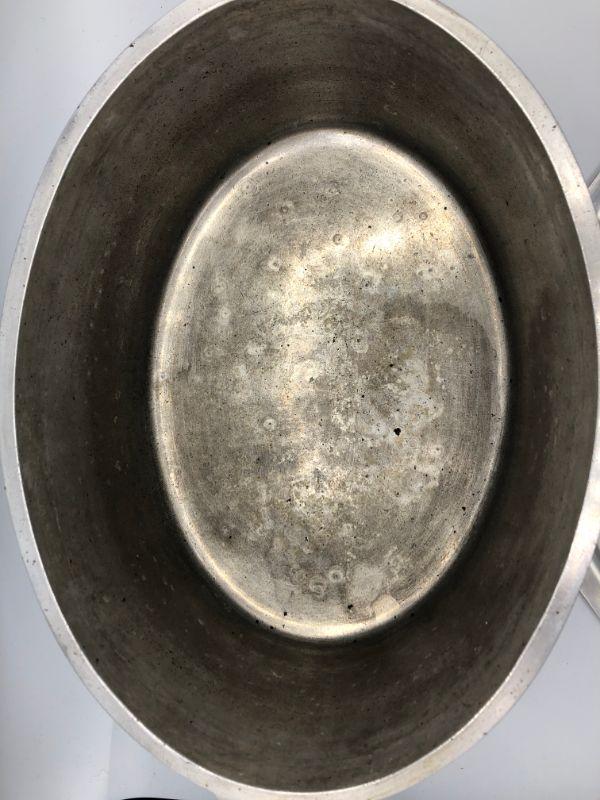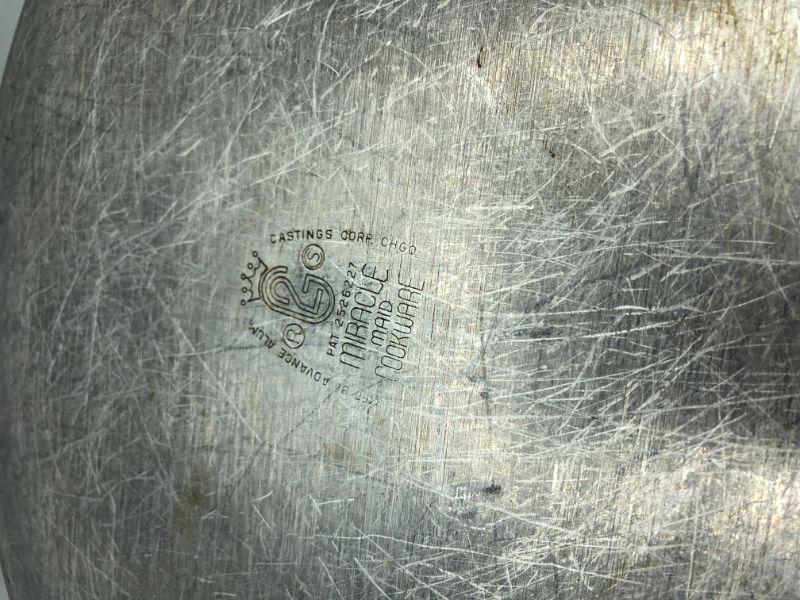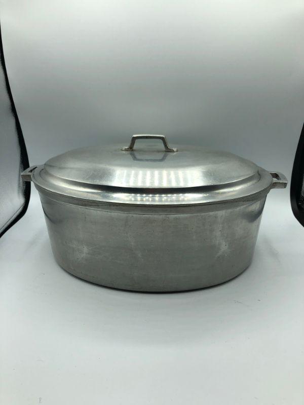 Vintage lidded roasting pan by Miracle Maid Cookware. Large heavy duty aluminum pan. Good used condition. About 12" length.