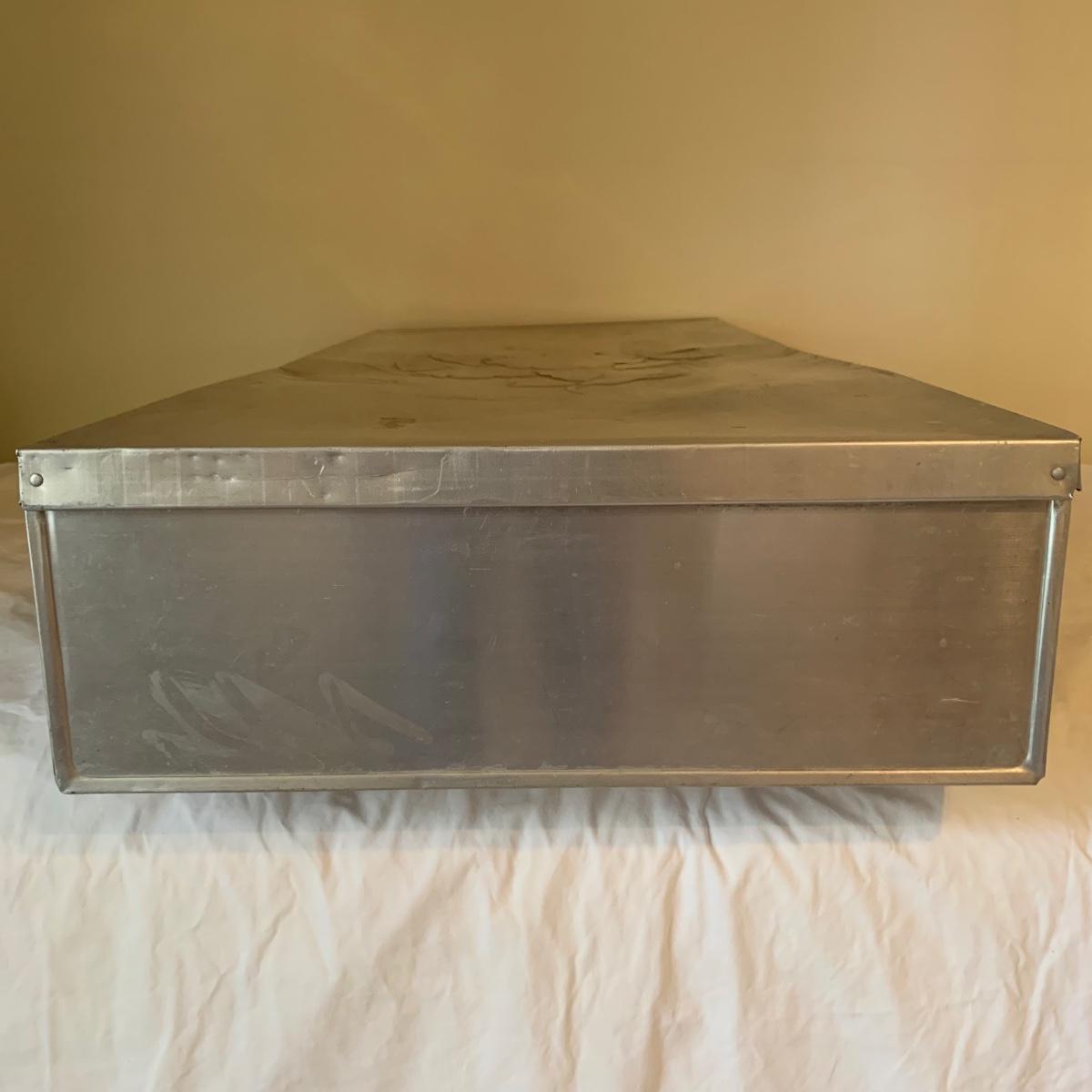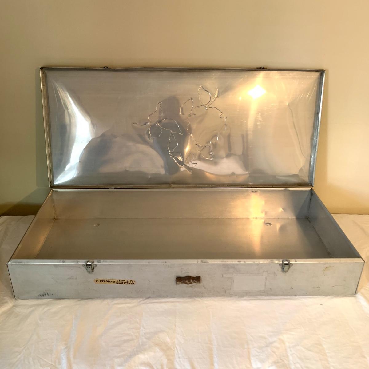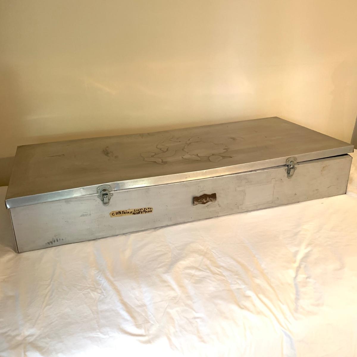Vintage aluminum storage box with two latches. Storage container measures 42” x 18” x 6.5”H. Please see photos for more details and condition as there are some areas with imperfections. Shipping available. Shipping can be costly. We suggest contacting our preferred local shipping provider, Postage Express, with dimensions and getting an estimate before bidding: (828) 670-5501 or postageexpress@yahoo.com.