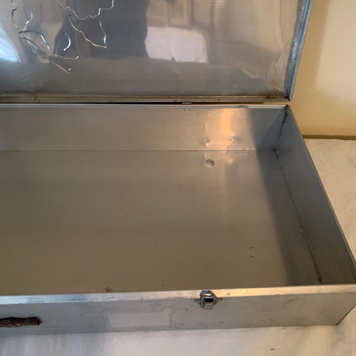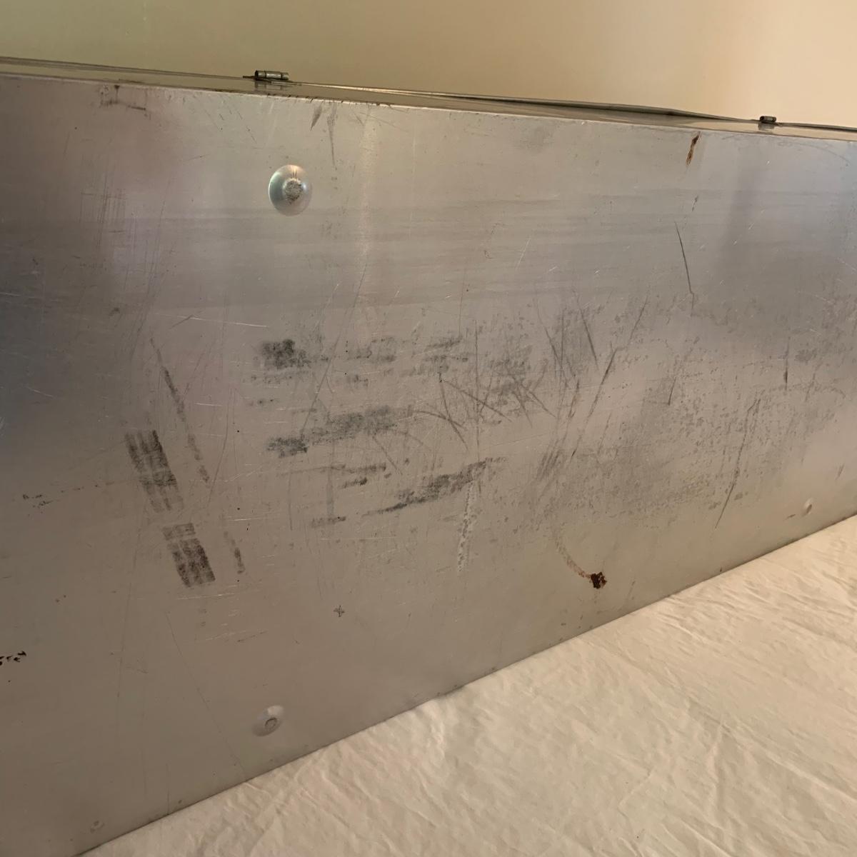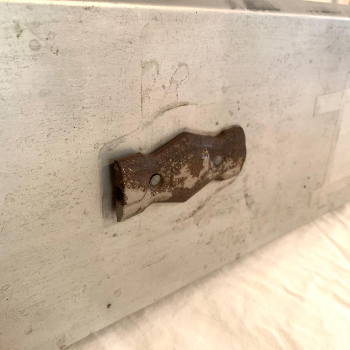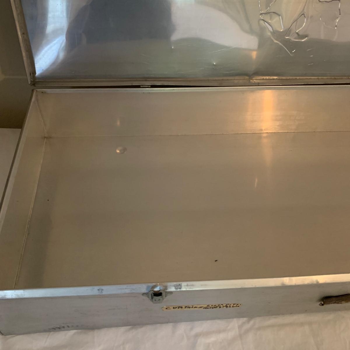 Vintage aluminum storage box with two latches. Storage container measures 42” x 18” x 6.5”H. Please see photos for more details and condition as there are some areas with imperfections. Shipping available. Shipping can be costly. We suggest contacting our preferred local shipping provider, Postage Express, with dimensions and getting an estimate before bidding: (828) 670-5501 or postageexpress@yahoo.com.