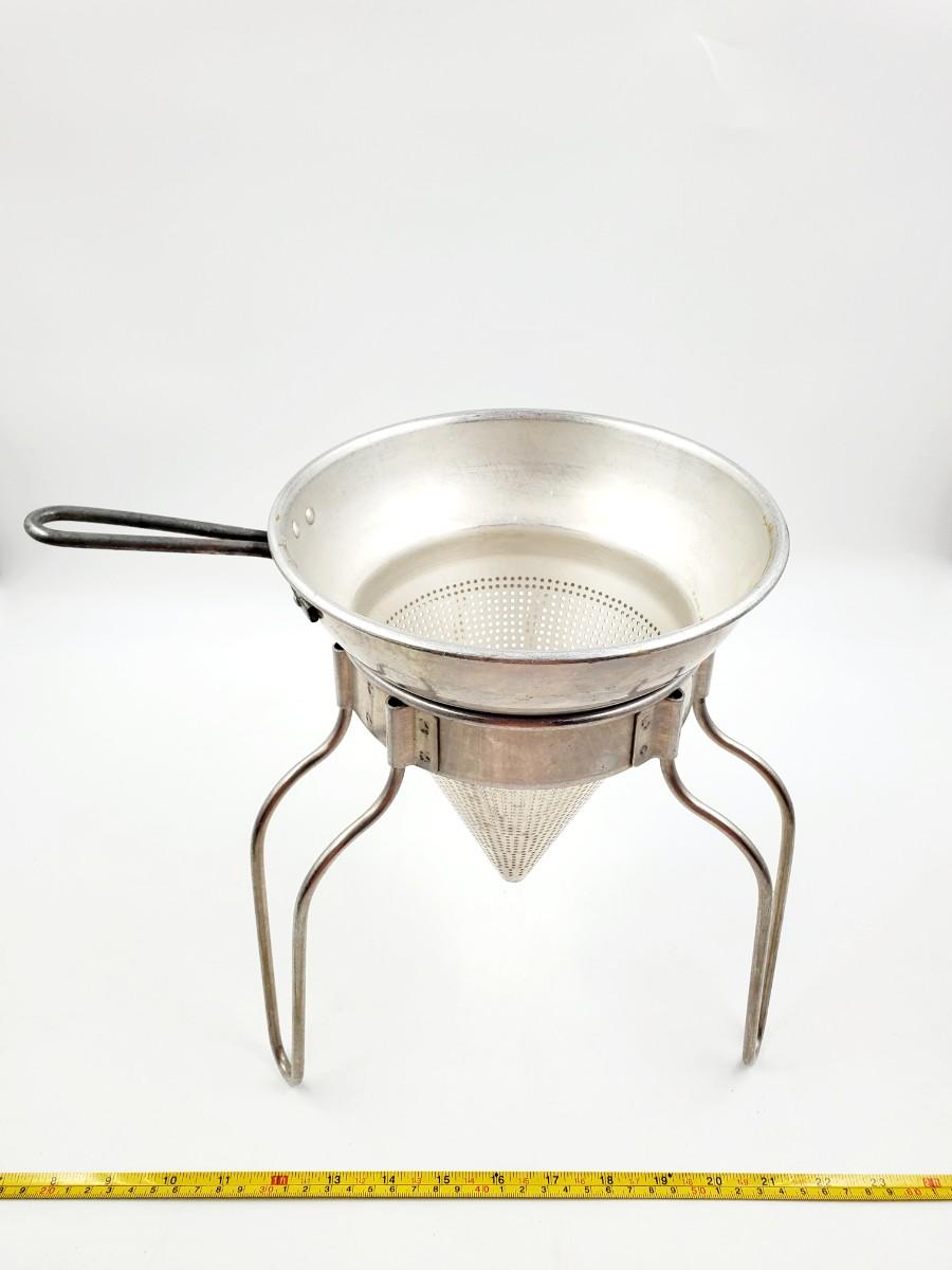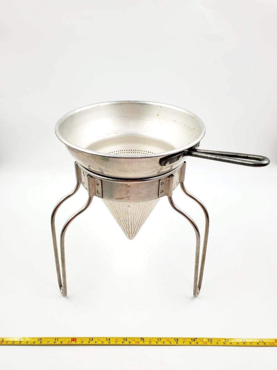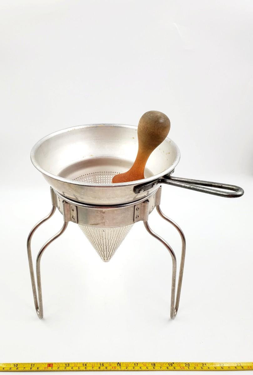 VINTAGE ALUMINUM WEAR EVER NO 452 SIEVE/COLANDER/STRAINER WITH WOODEN PESTLE AND STAND