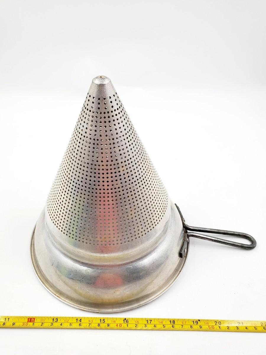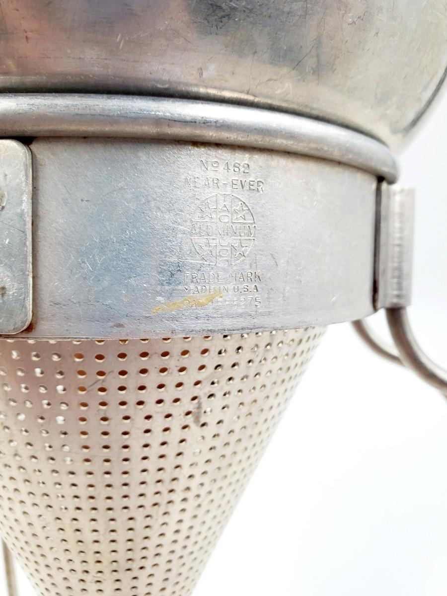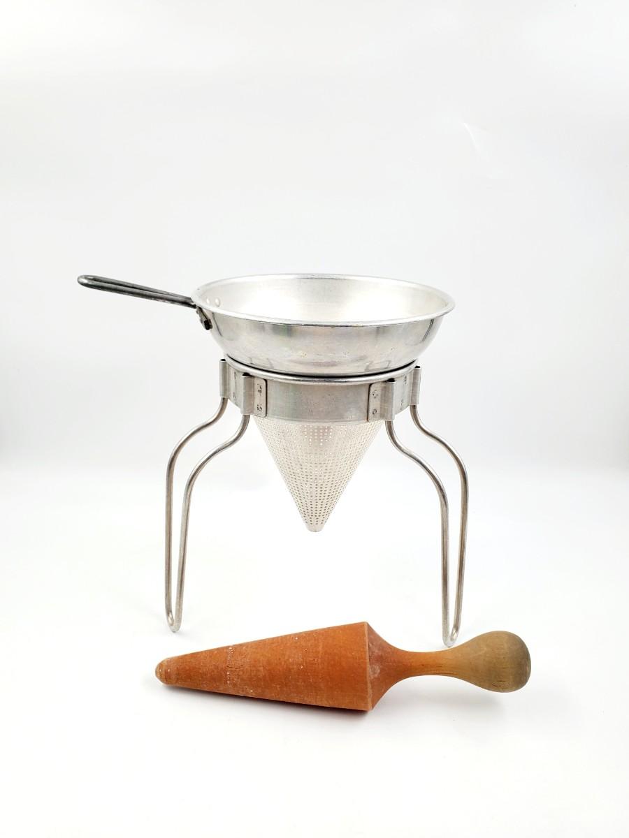 VINTAGE ALUMINUM WEAR EVER NO 452 SIEVE/COLANDER/STRAINER WITH WOODEN PESTLE AND STAND