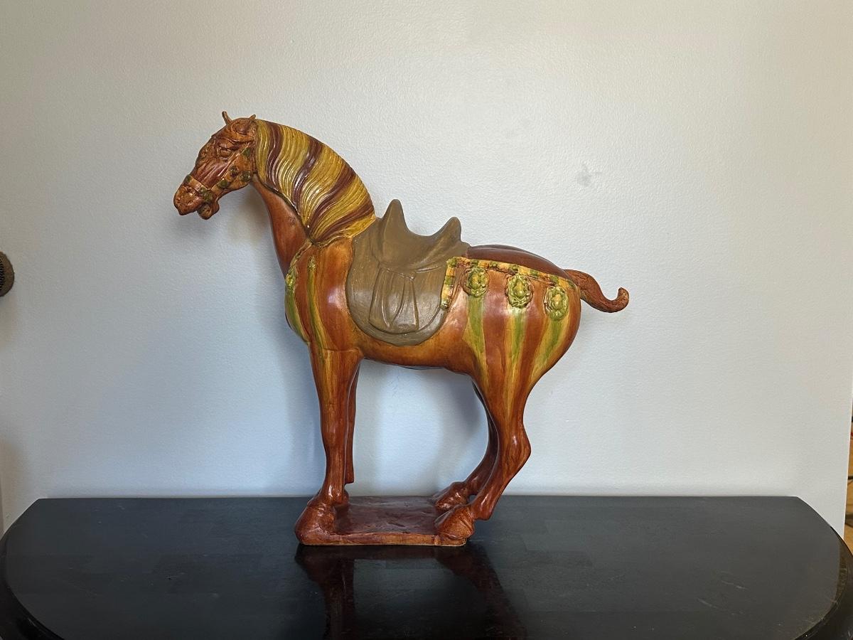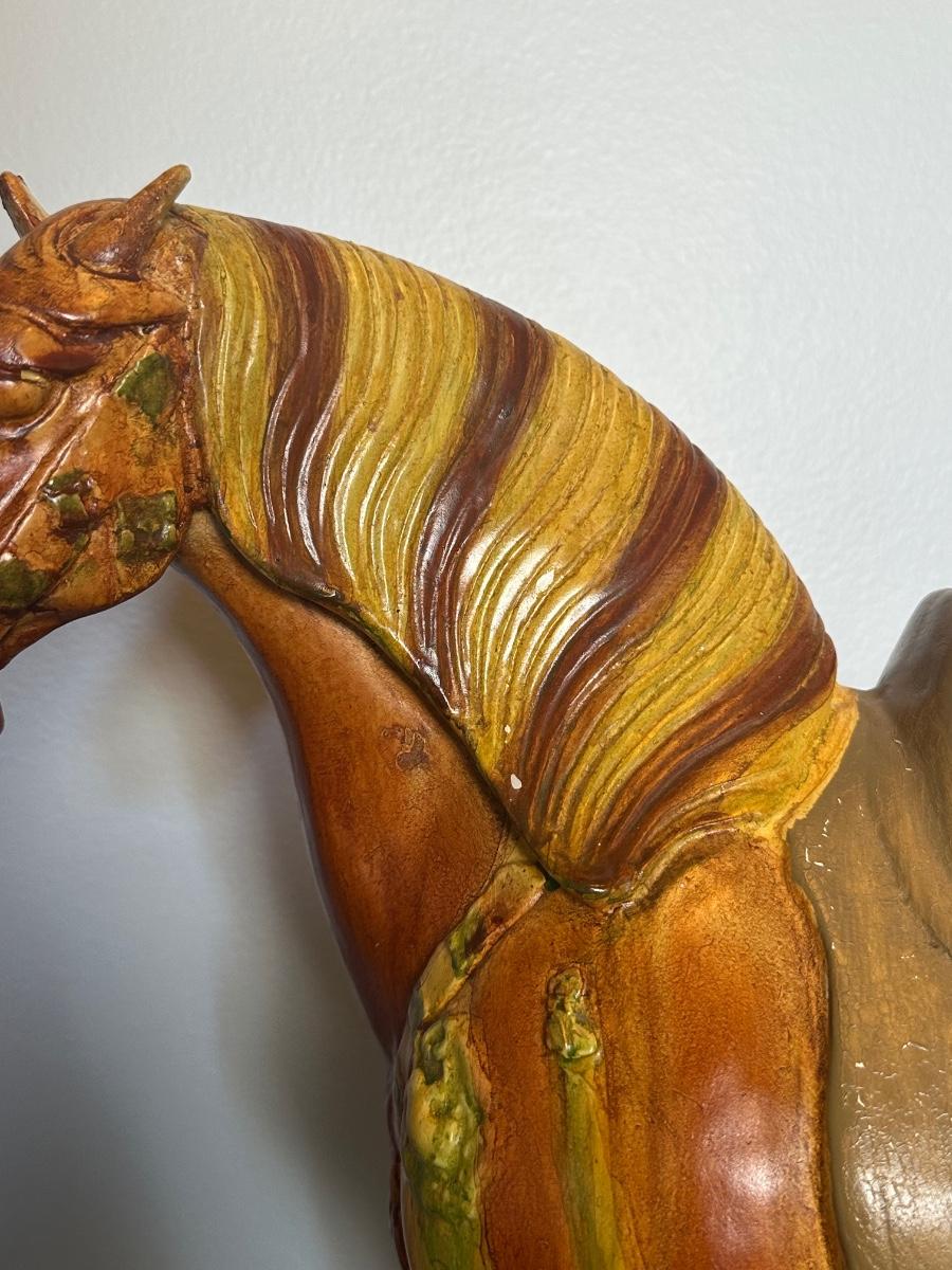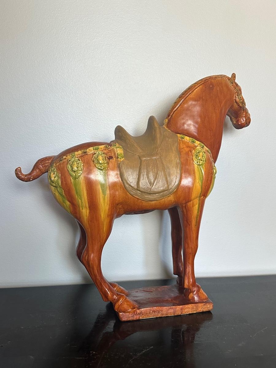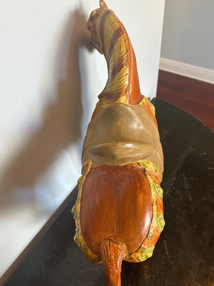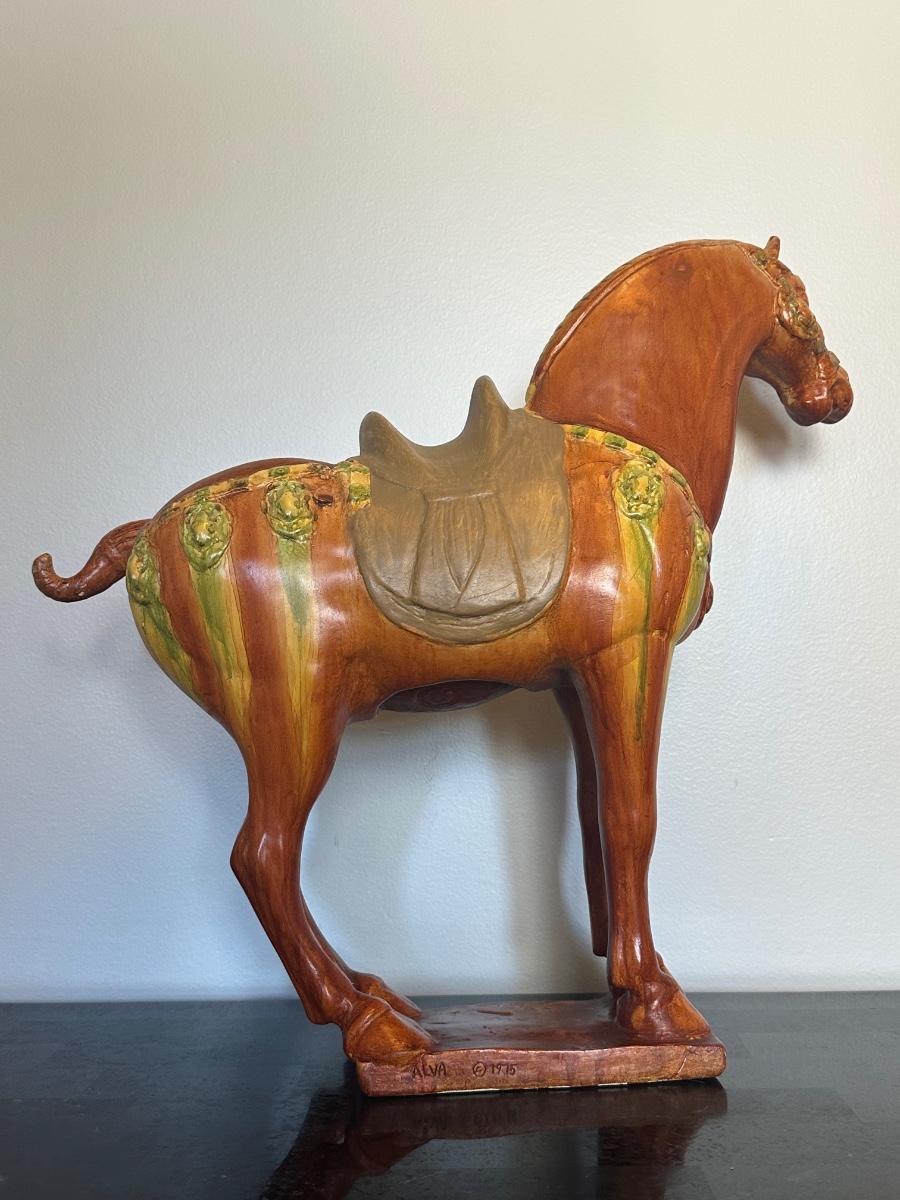 Vintage hand-painted ceramic horse marked “ALVA © 1975” on base. Approx. 20–21” tall. Minor glaze chips and surface wear consistent with age. See photos for details and condition.