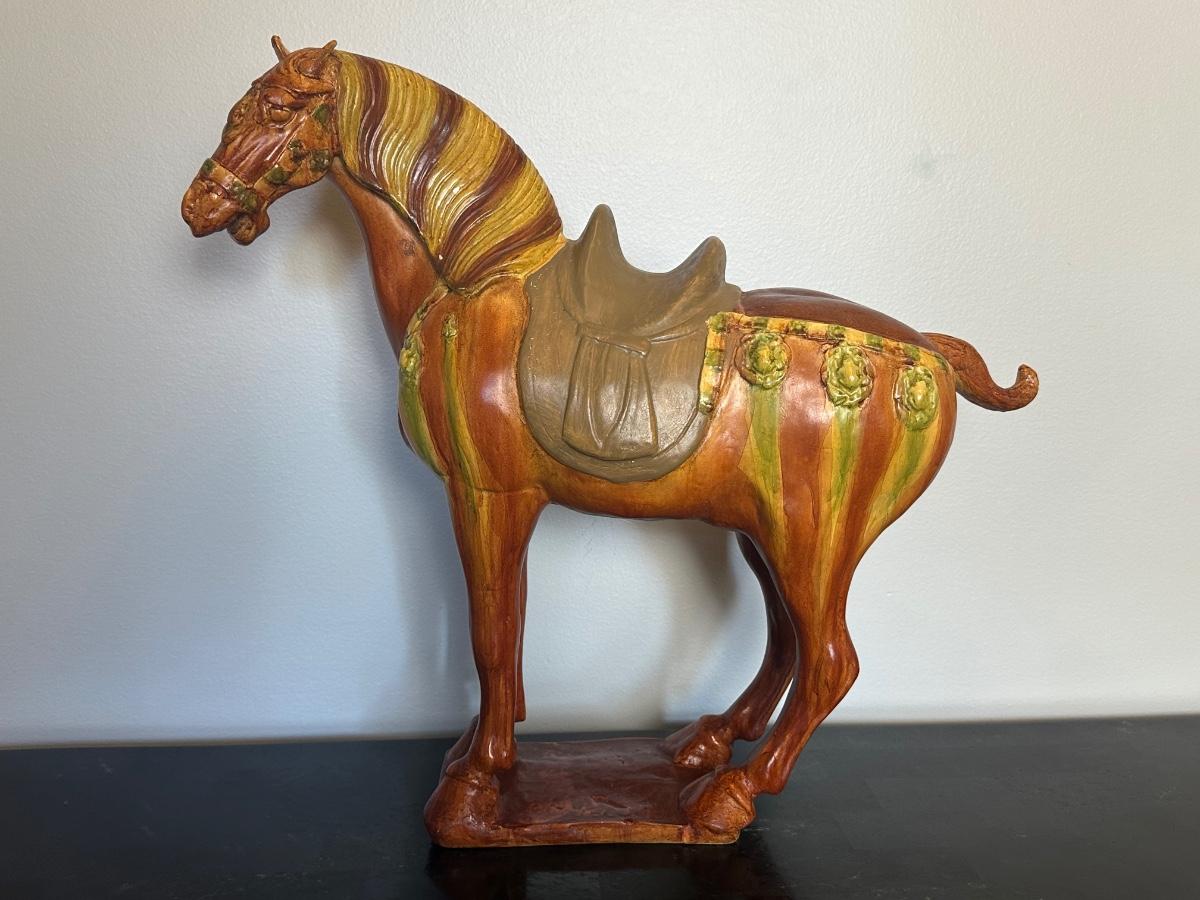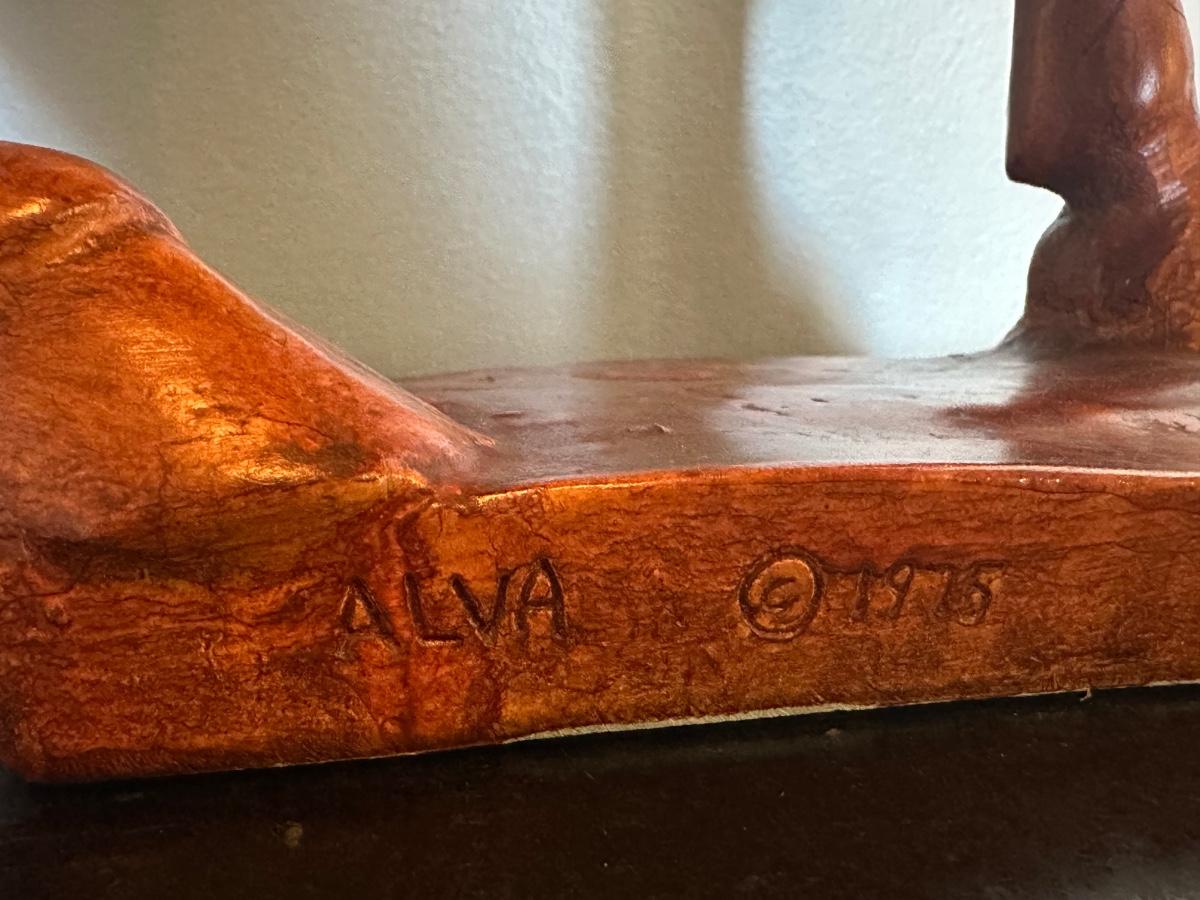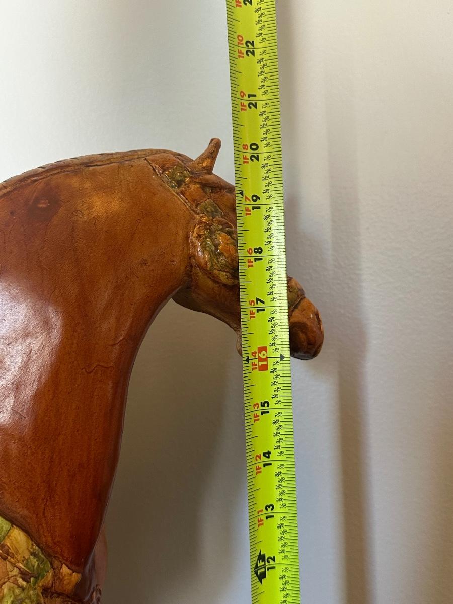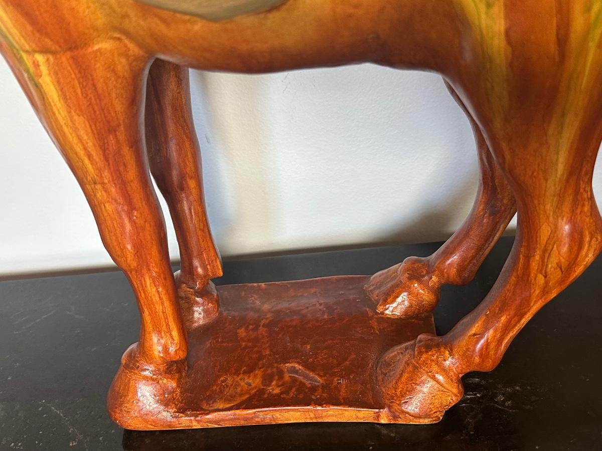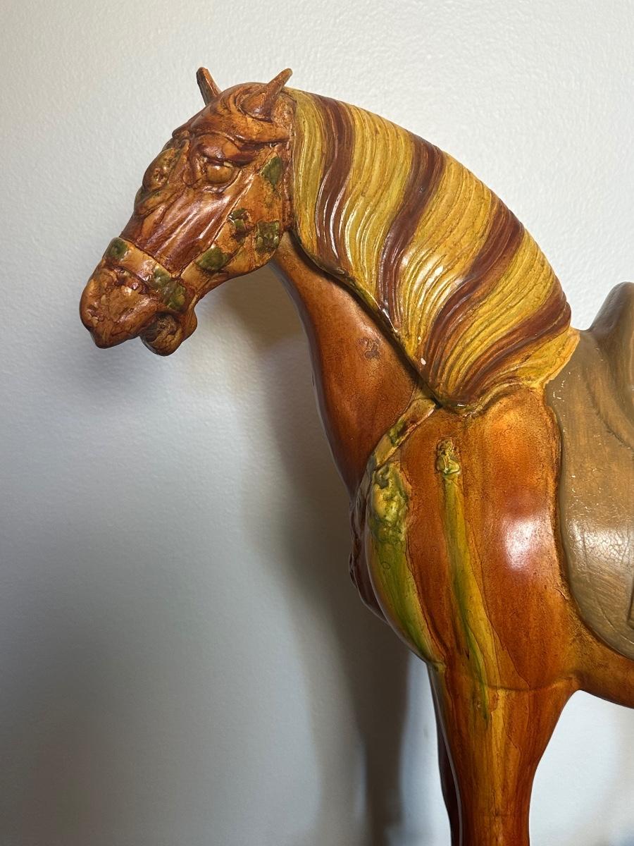 Vintage hand-painted ceramic horse marked “ALVA © 1975” on base. Approx. 20–21” tall. Minor glaze chips and surface wear consistent with age. See photos for details and condition.