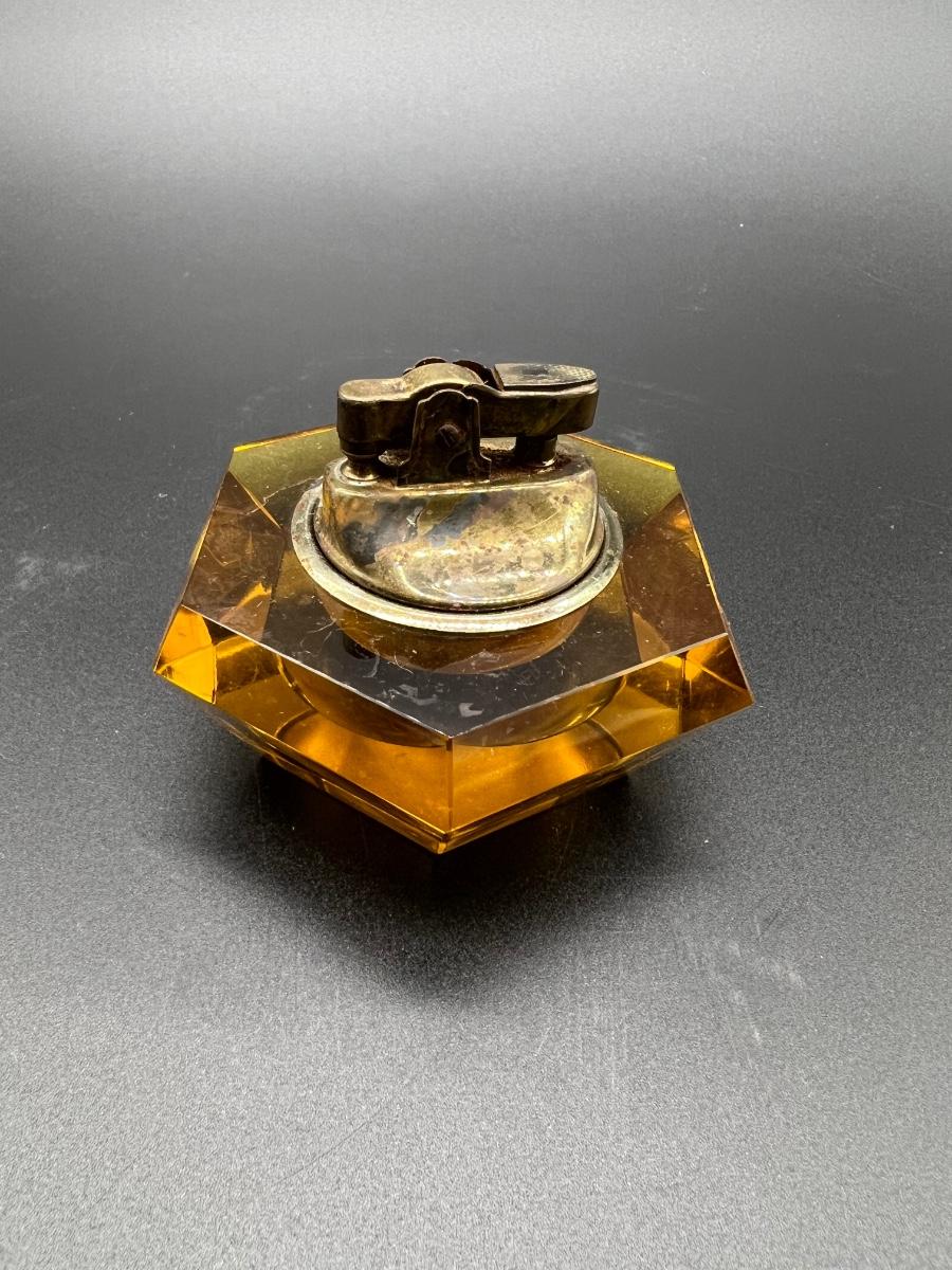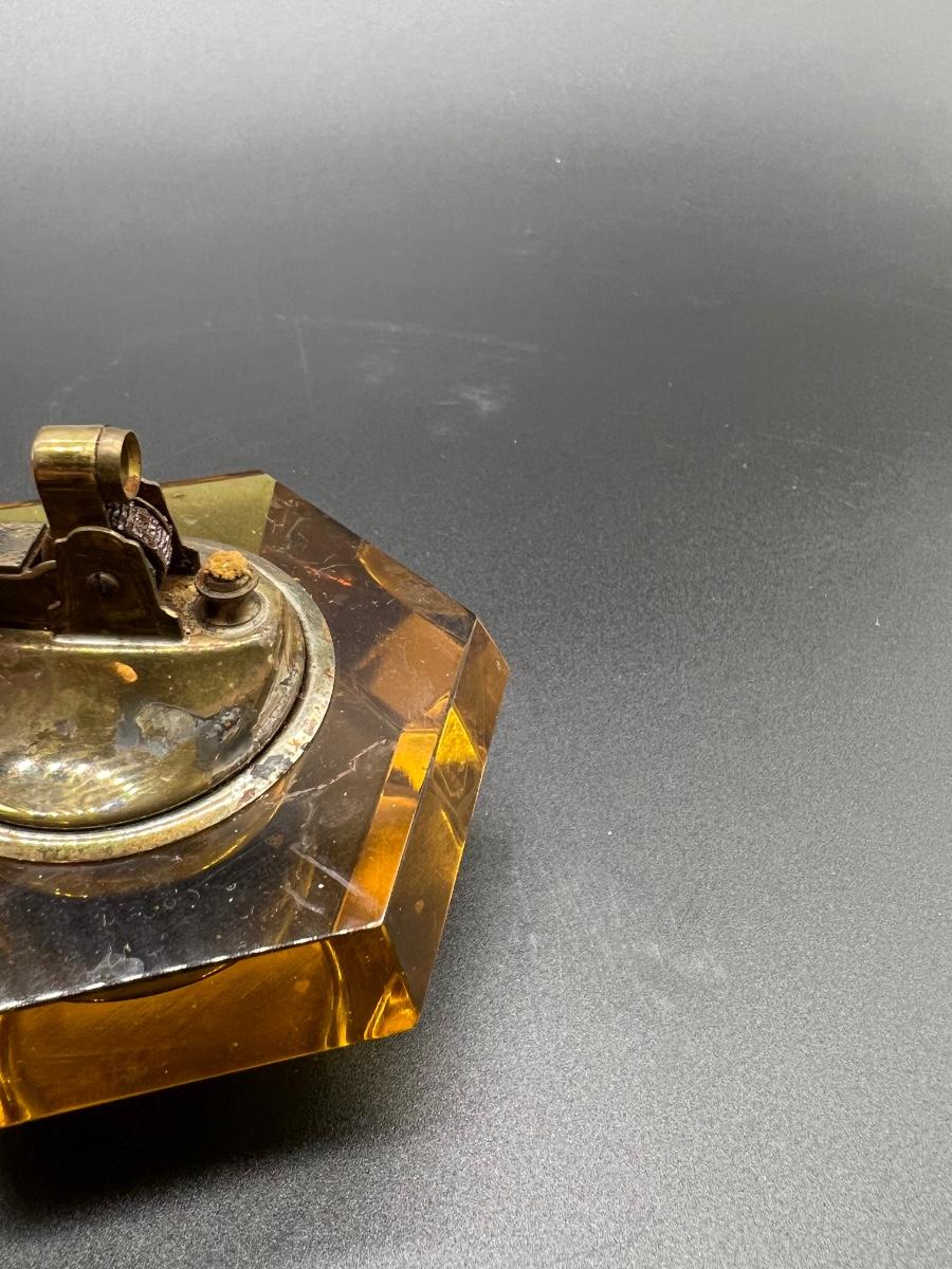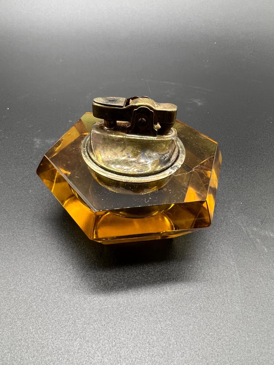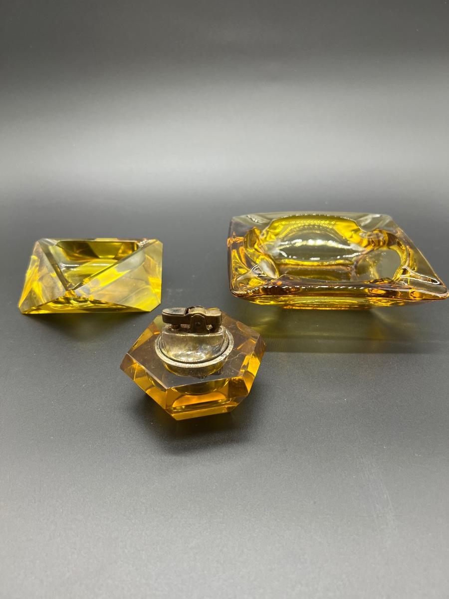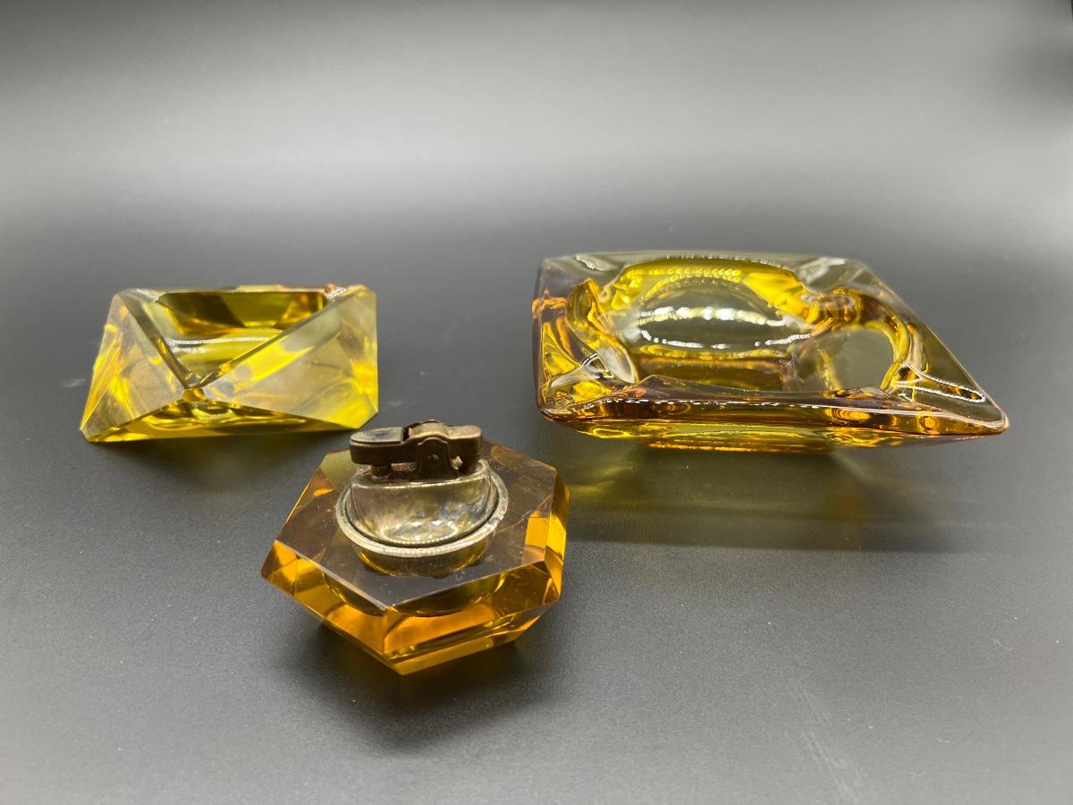 Vintage Amber Glass Lighter and Two Amber Ash Trays