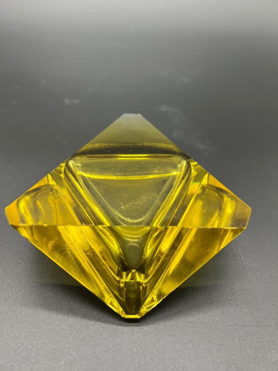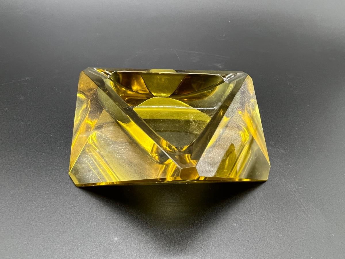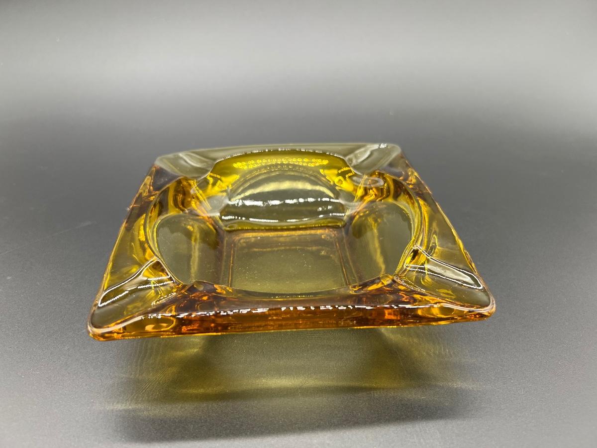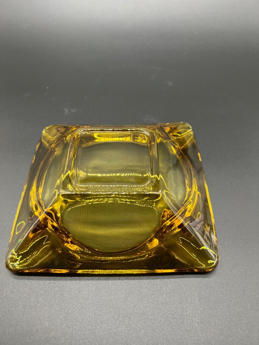 Vintage Amber Glass Lighter measures 2 inches tall and 3 inches wide. amber ash tray measures 4 inches tall and 5 inches wide. Square ash tray measures 6X6.