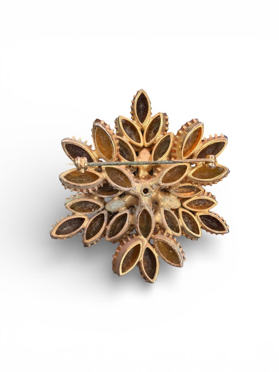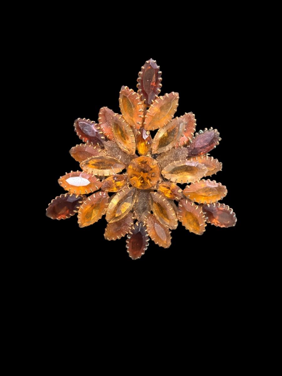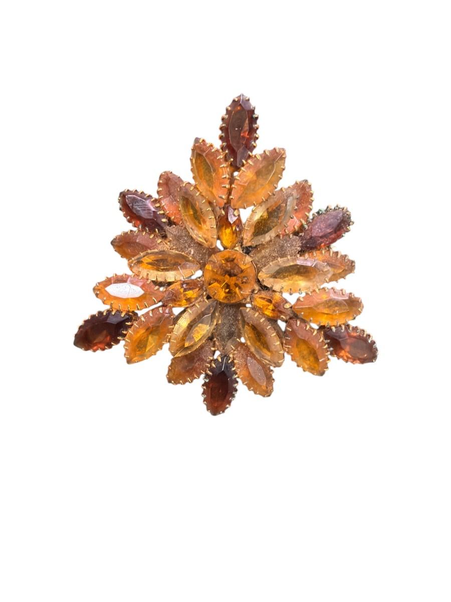 Vintage Amber and Root Beer Colored Glass Rhinestone Flower Brooch With Gold Tone Metal Set