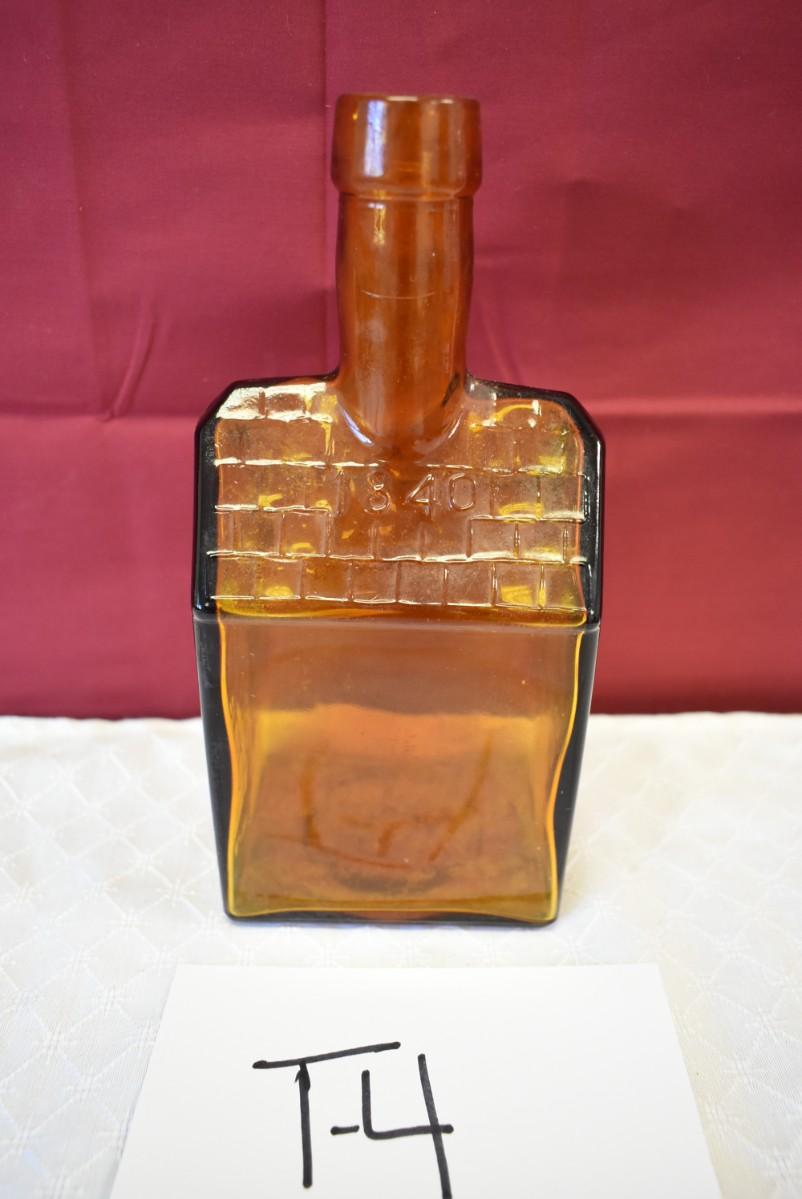 Markings of "120 Walnut St Philadelphia" on one side; "E.C. Booz's Old Cabin Whiskey" one the other. One side of the 'roof' also reads "E.C. Booz's Old Cabin Whiskey"; the other side reads "1840". On the base of the bottle "Nuline, NJ".