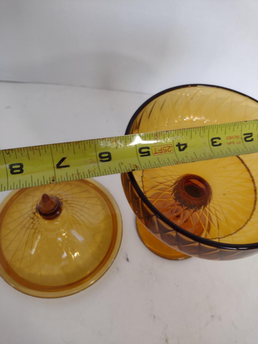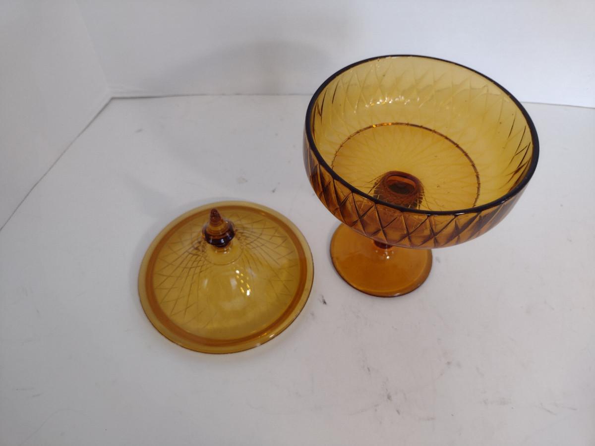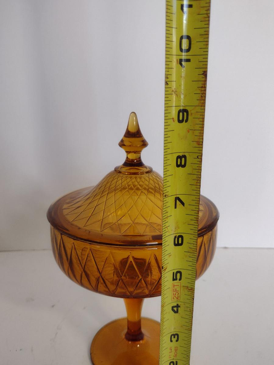Vintage Amber Glass Pedestal Candy Dish with Lid. Lid has some very light chipping.