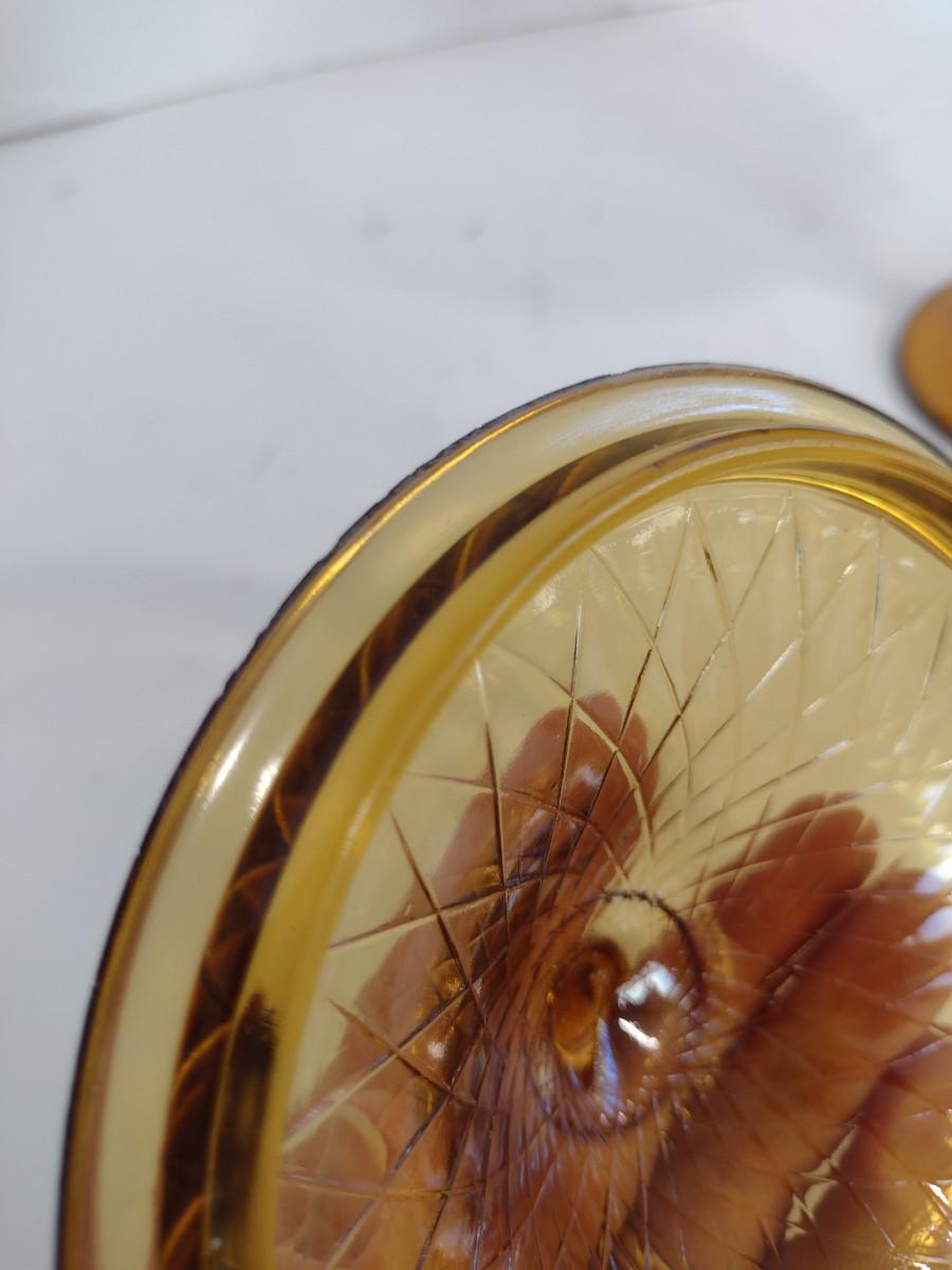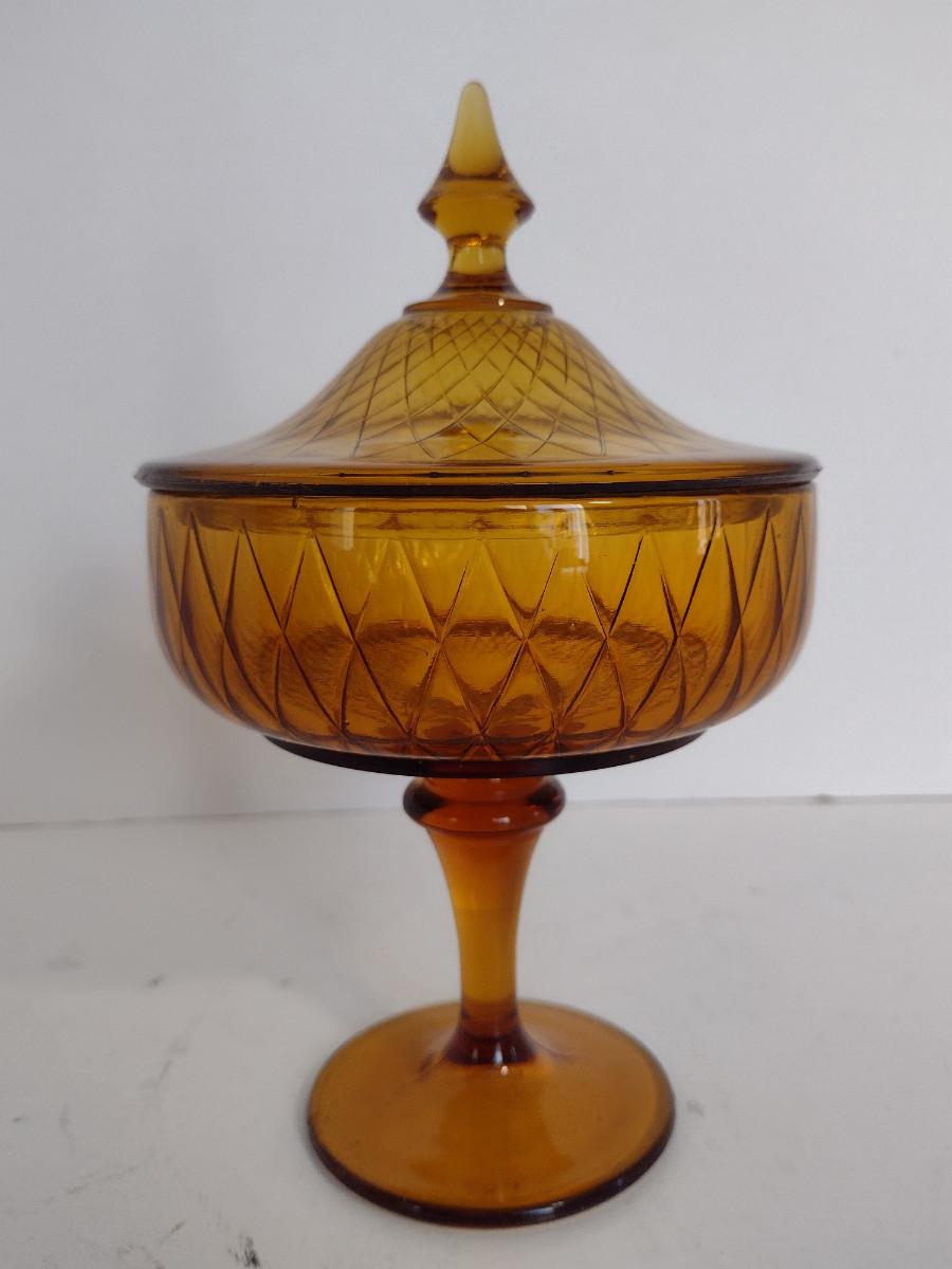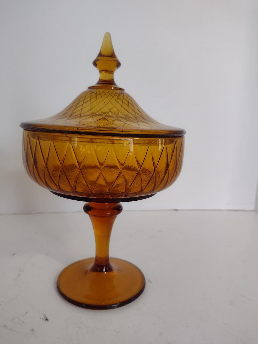 Vintage Amber Glass Pedestal Candy Dish with Lid. Lid has some very light chipping.
