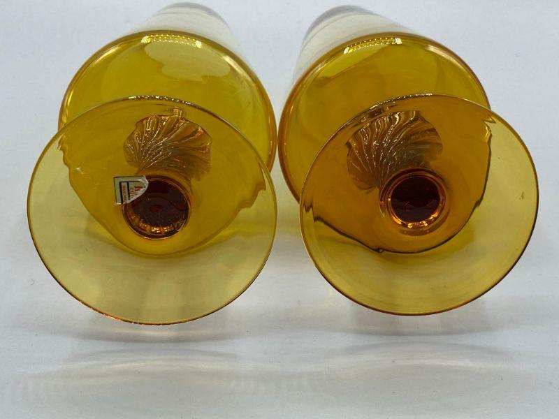 Pair of hand blown champagne flutes. Amber gold colored glass. Slightly different from each other since they are handmade. Stand about 8". Partial sticker still on one glass.