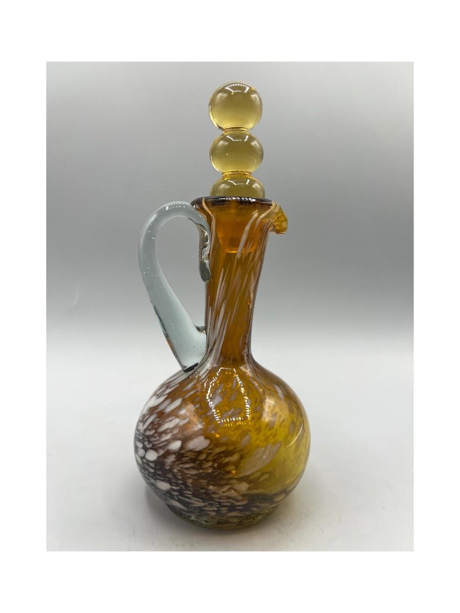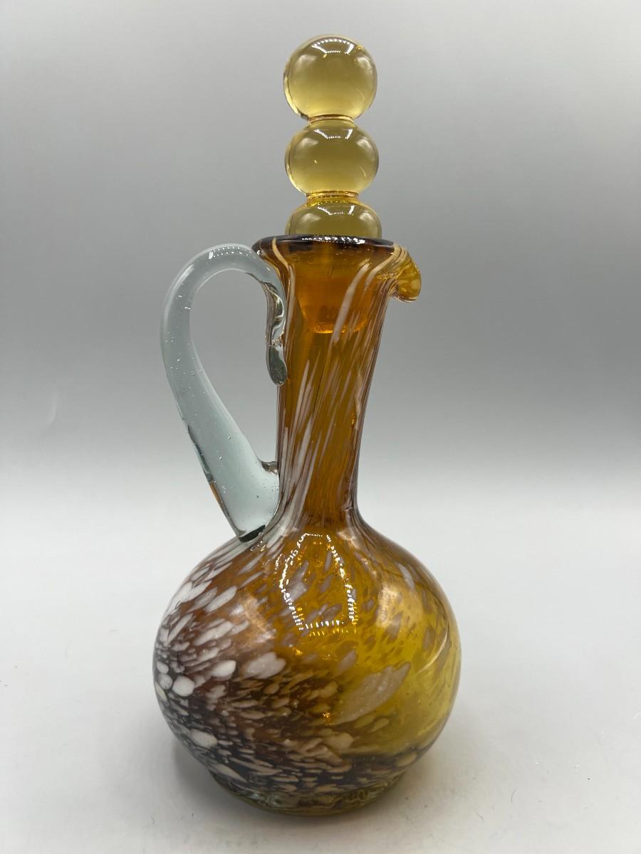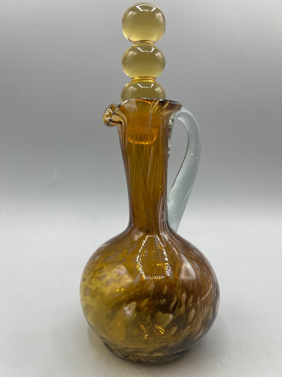 There is no significant cracks or chips to the glass cruet bottle and is in good collectible and useable condition. Check pictures for more details and for sizing,